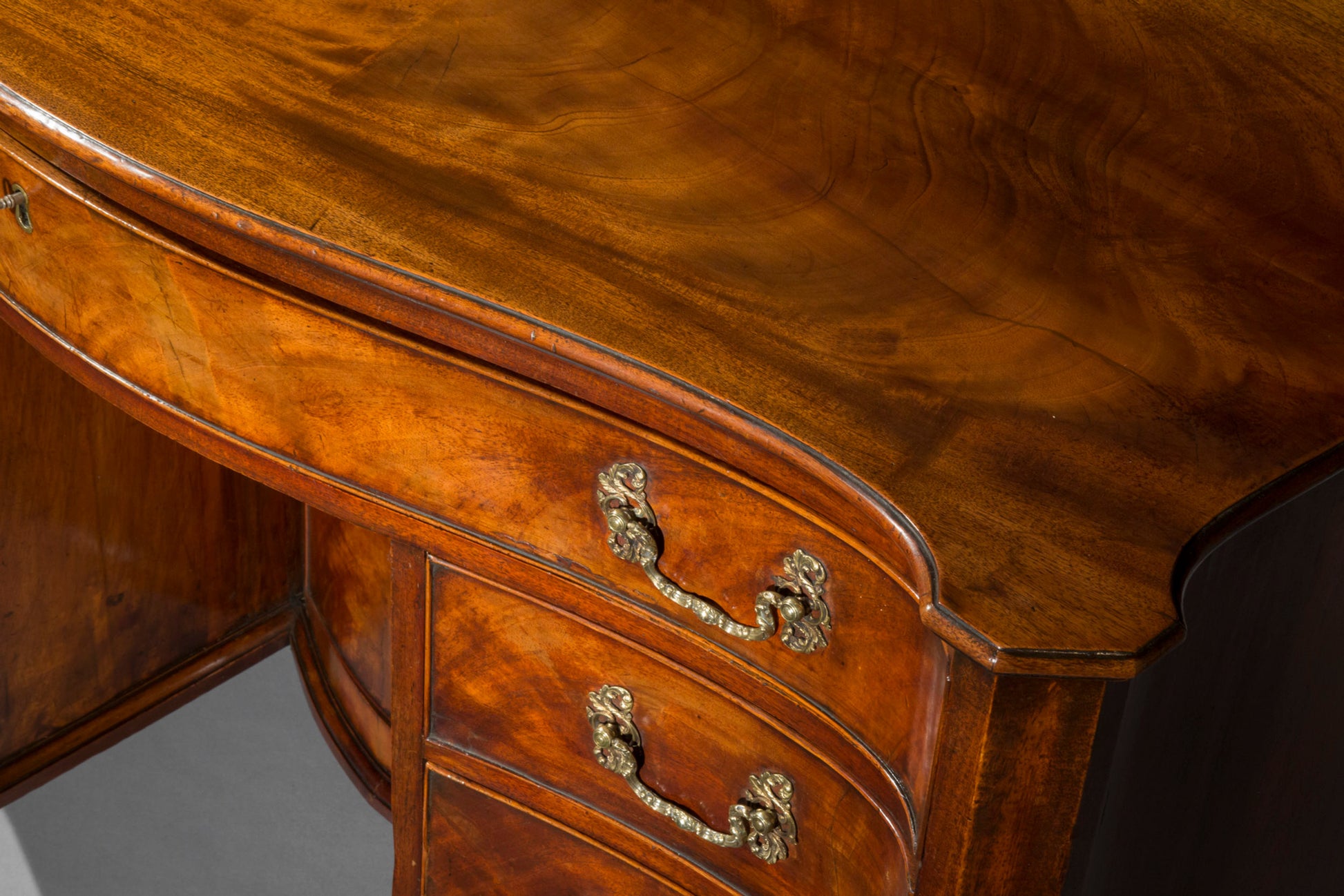 A fine George III Chippendale period kneehole chest of drawers or desk in mahogany with serpentine front.
