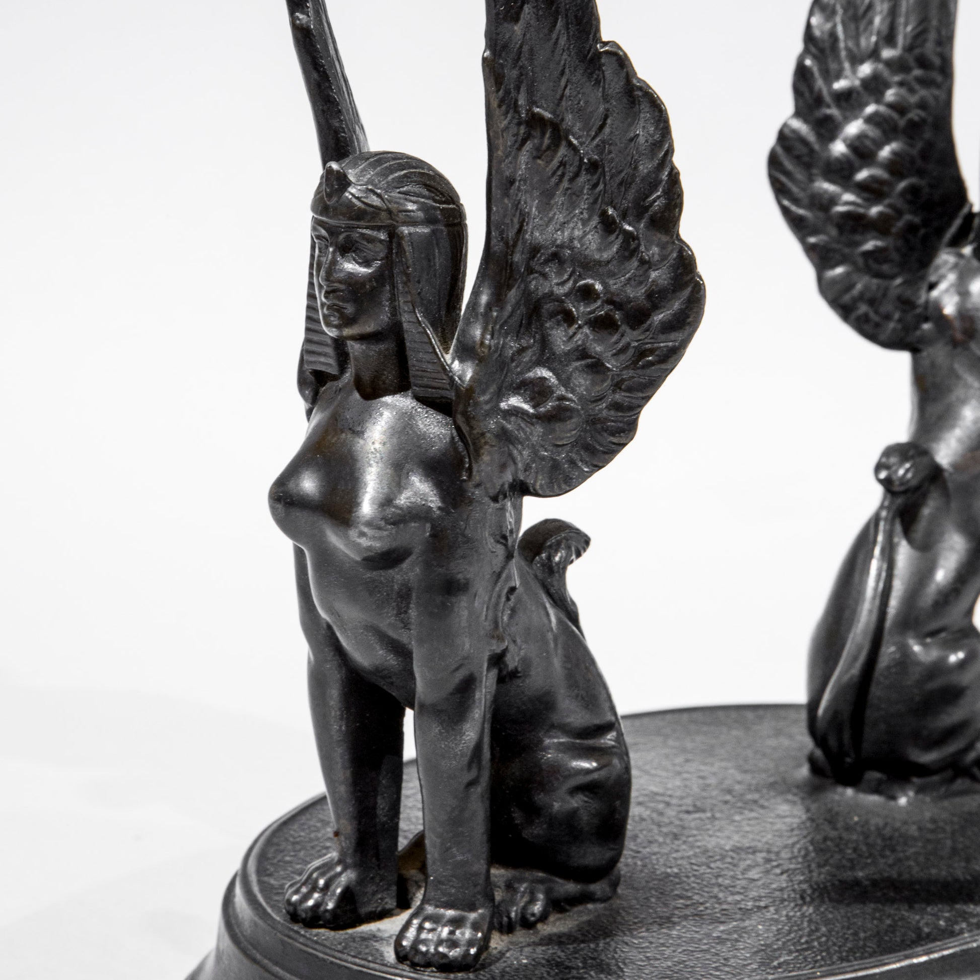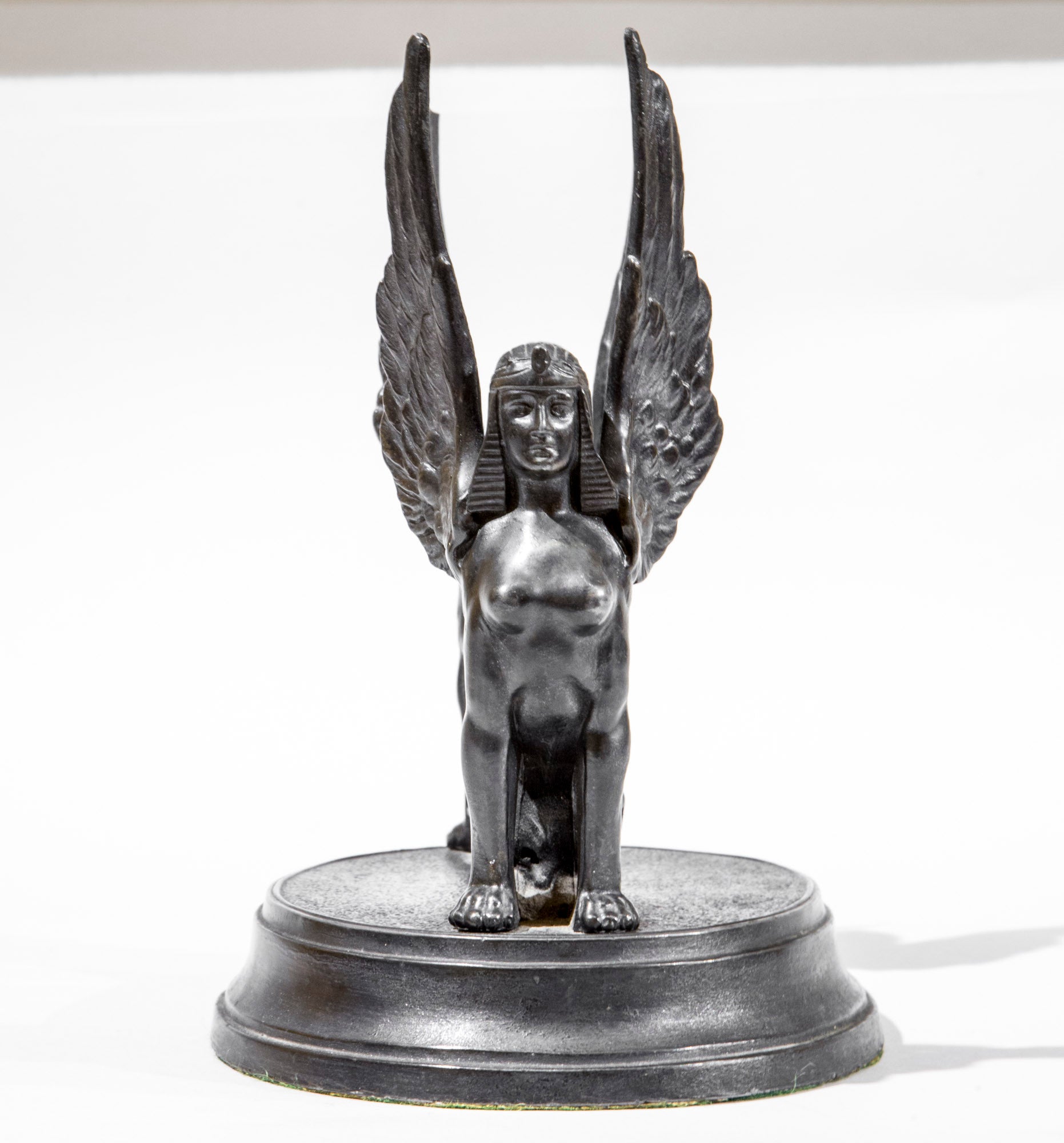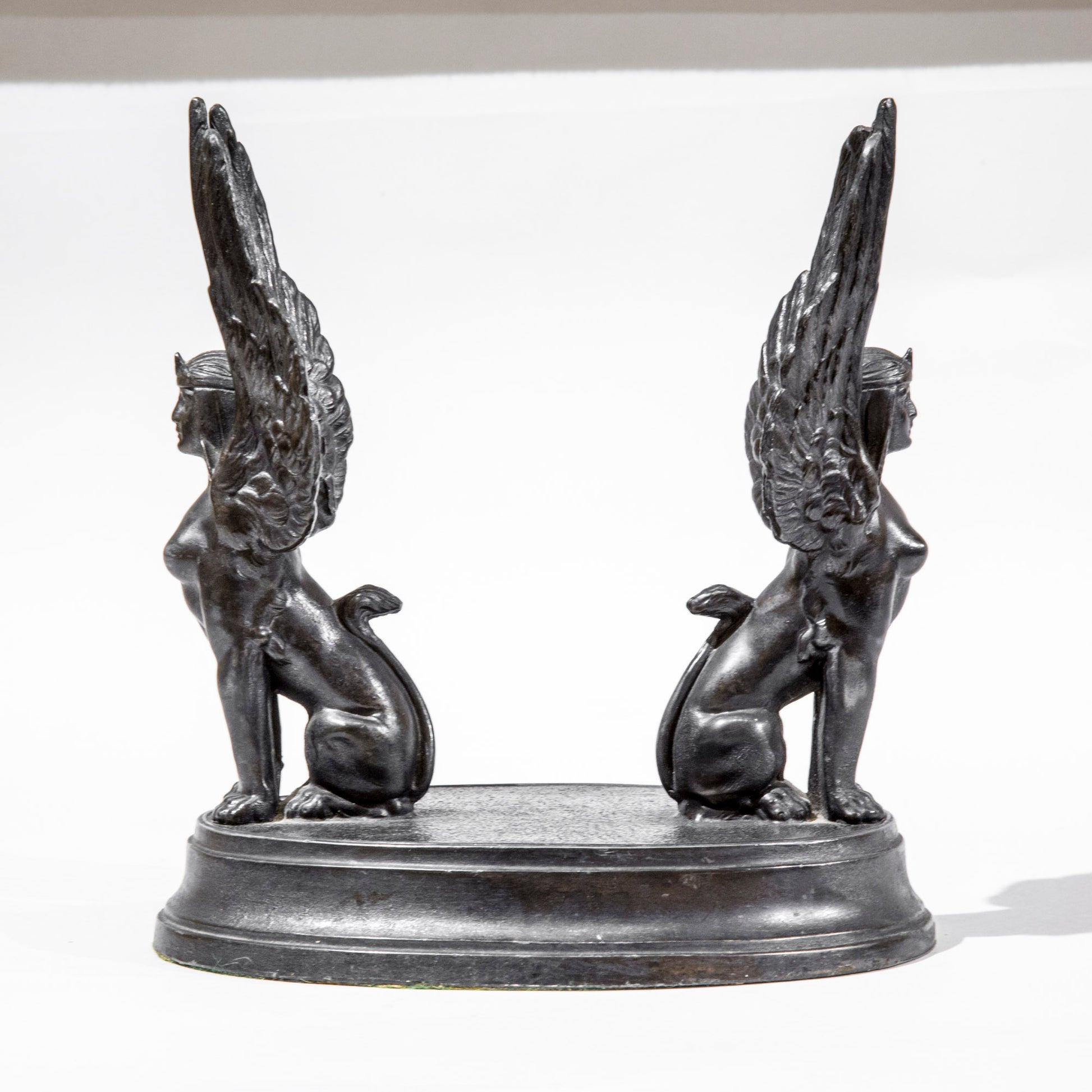 An interesting antique bronzed metal desktop sculpture, probably a paperweight, fashioned as two opposing sphinx.