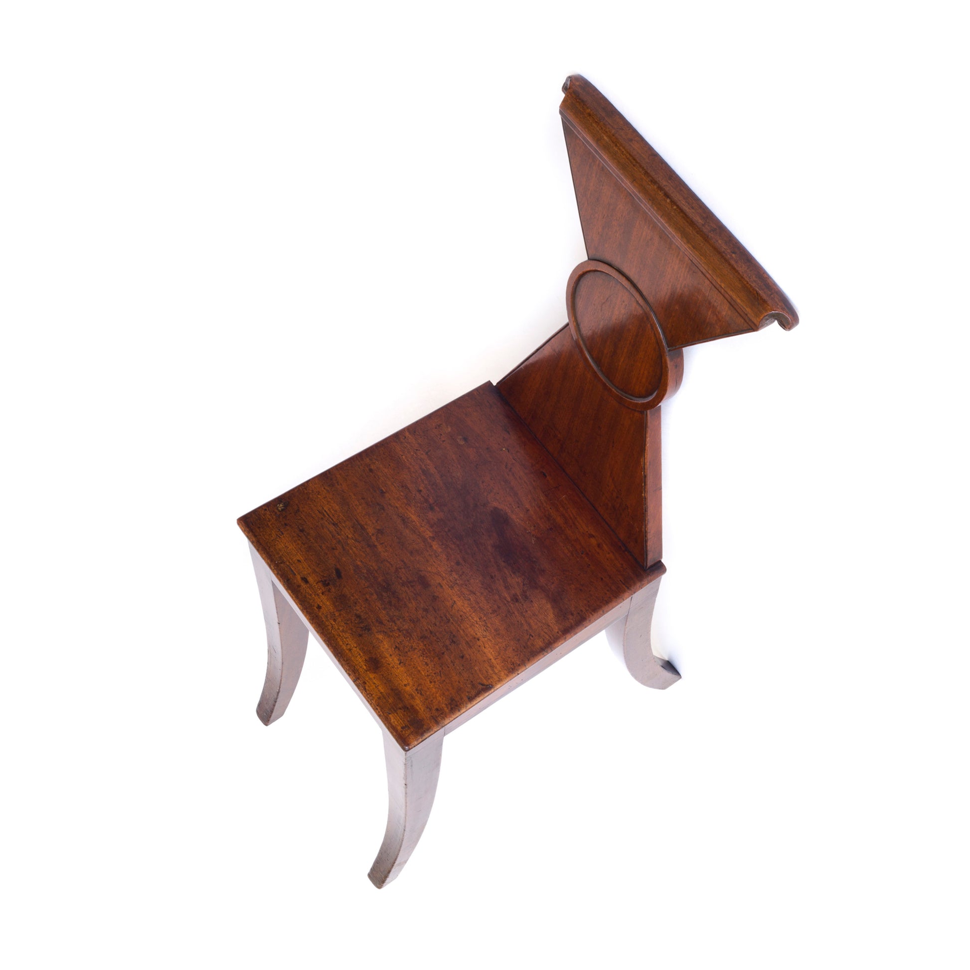 An rare and unusual fine pair of early Regency mahogany klismos hall chairs of exceptional quality, attributed to Gillows of Lancaster and London.