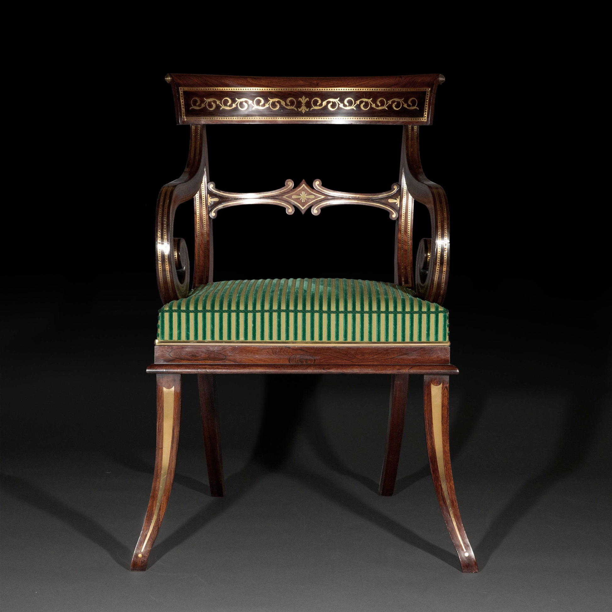 Extremely rare with this particular form of front legs, derived from the ancient Greek 'Klismos' seats, this chair features exquisite brass inlay throughout, traditionally associated with the oeuvre of George Oakley (1773-1840), one of the most prominent London furniture-makers of the early 19th century.