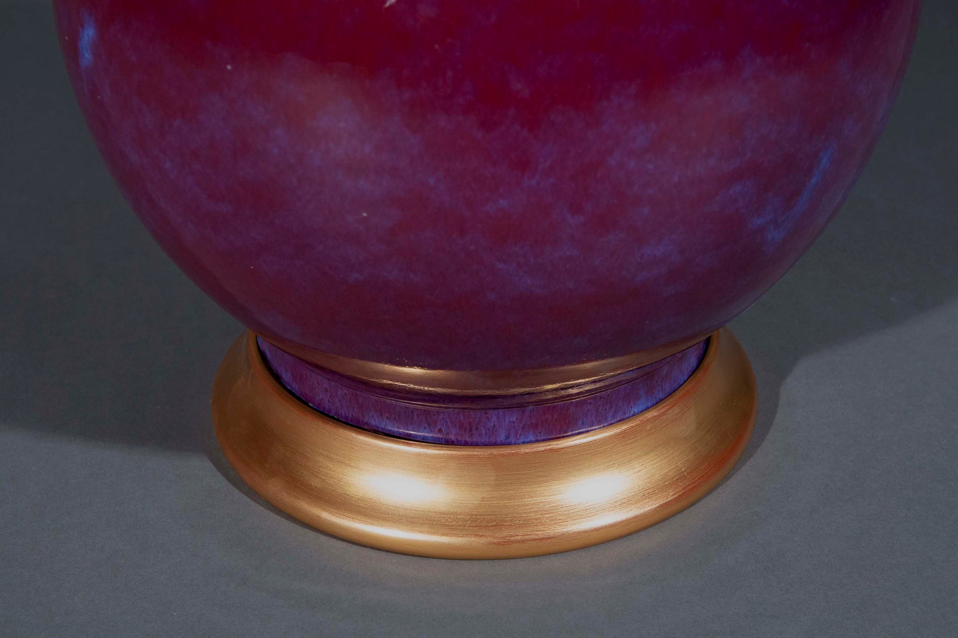 A wonderfully decorative vase of massive proportions, beautifully glazed with purple and blue streaks, mounted as lamp.