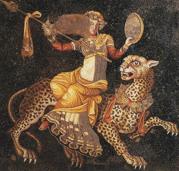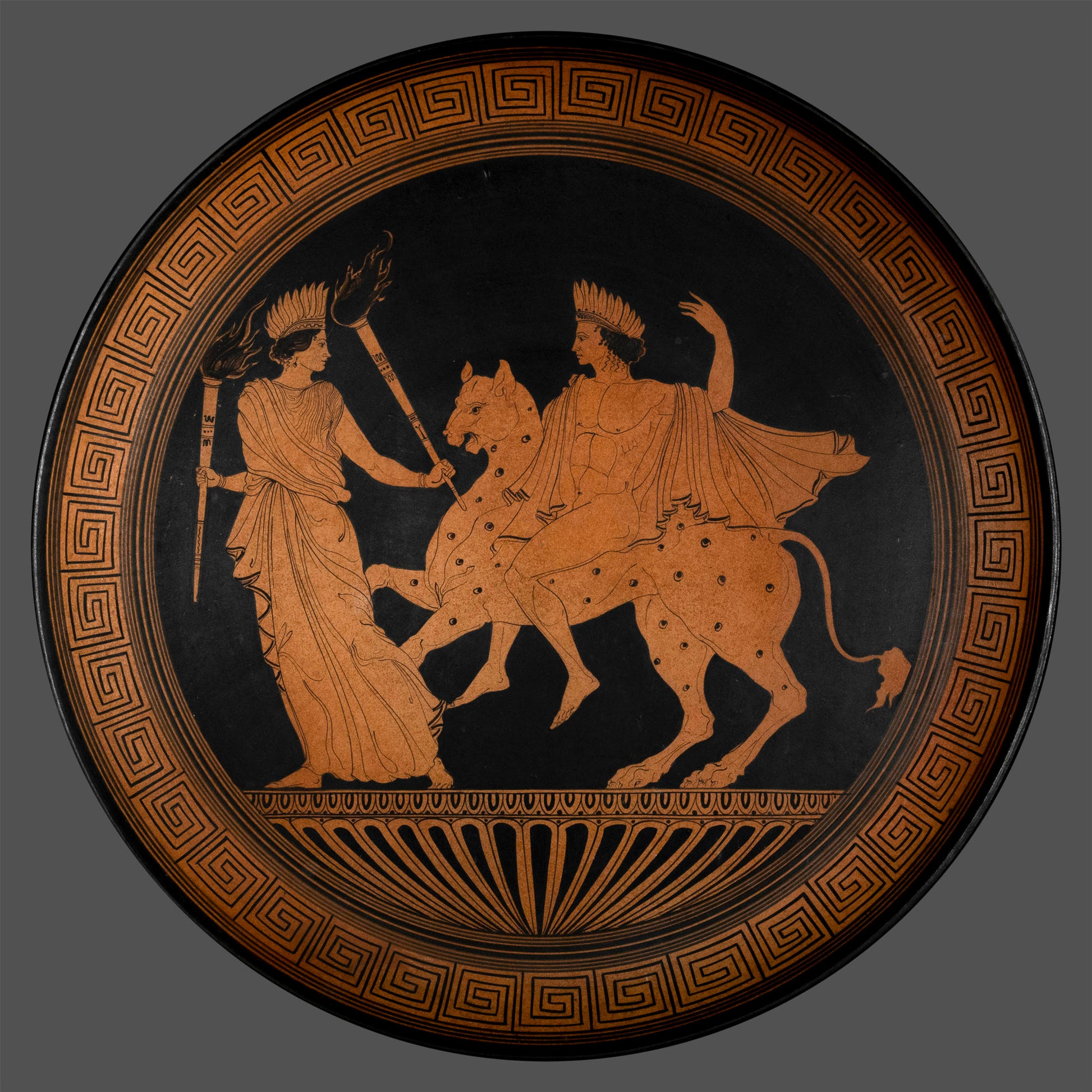 Decorated with Dionysus riding a cheetah, and Ariadne with torches in her hands, all exquisitely painted within an intricate Greek key border.