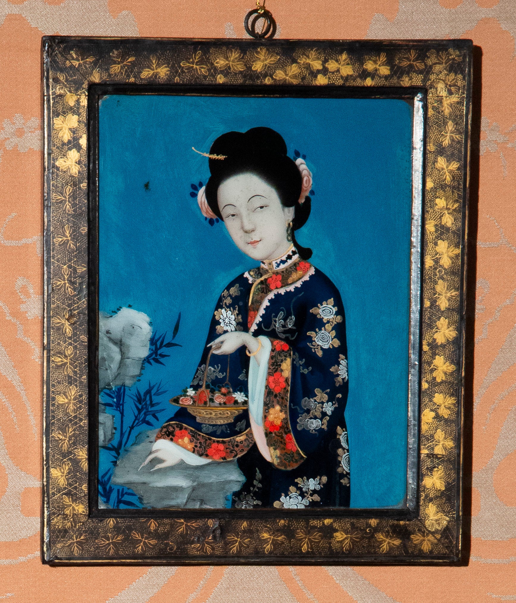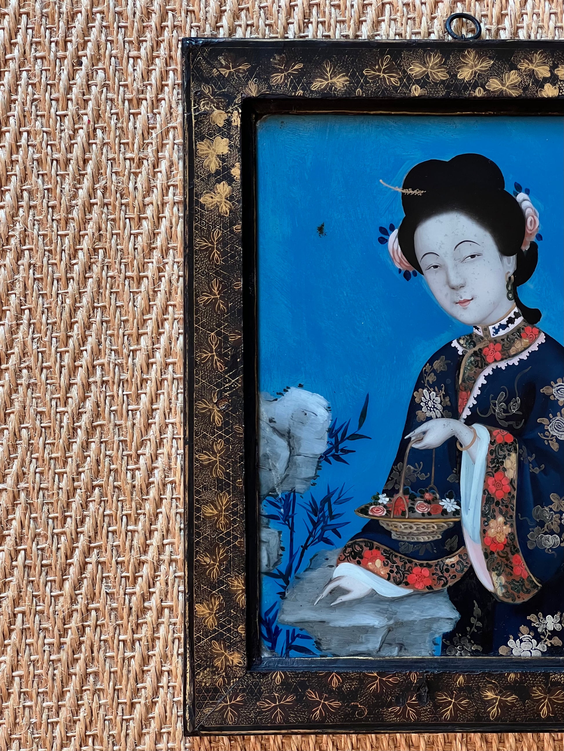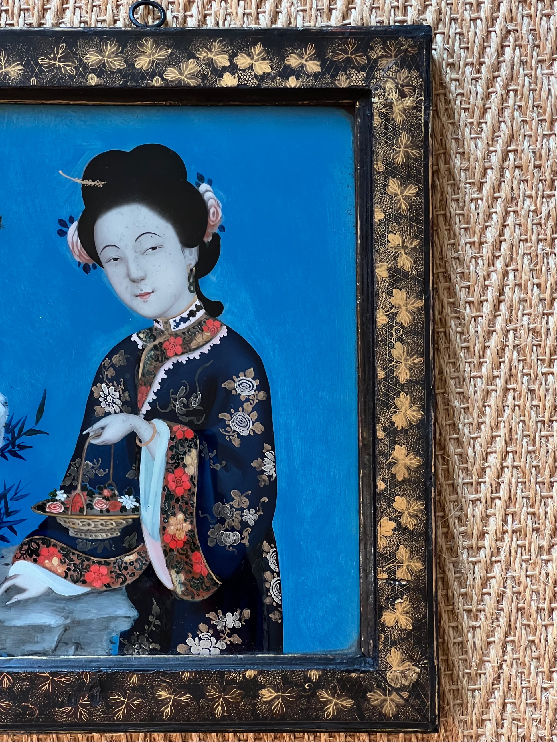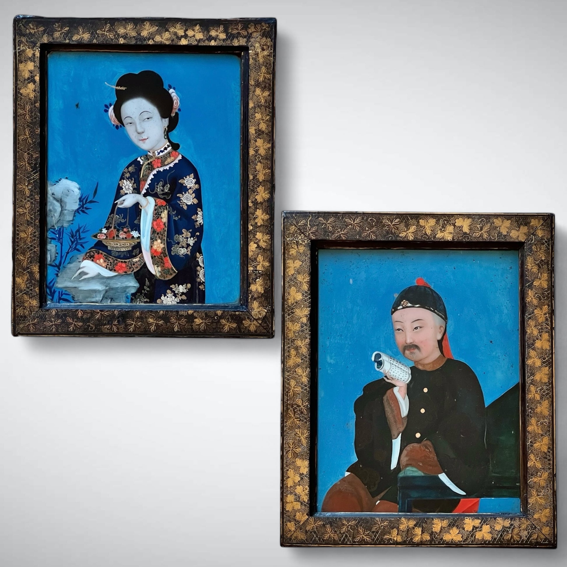 A pair of absolutely exquisite 18th century Chinese export reverse glass portrait paintings in 18th century lacquer frames. Canton, circa 1800.