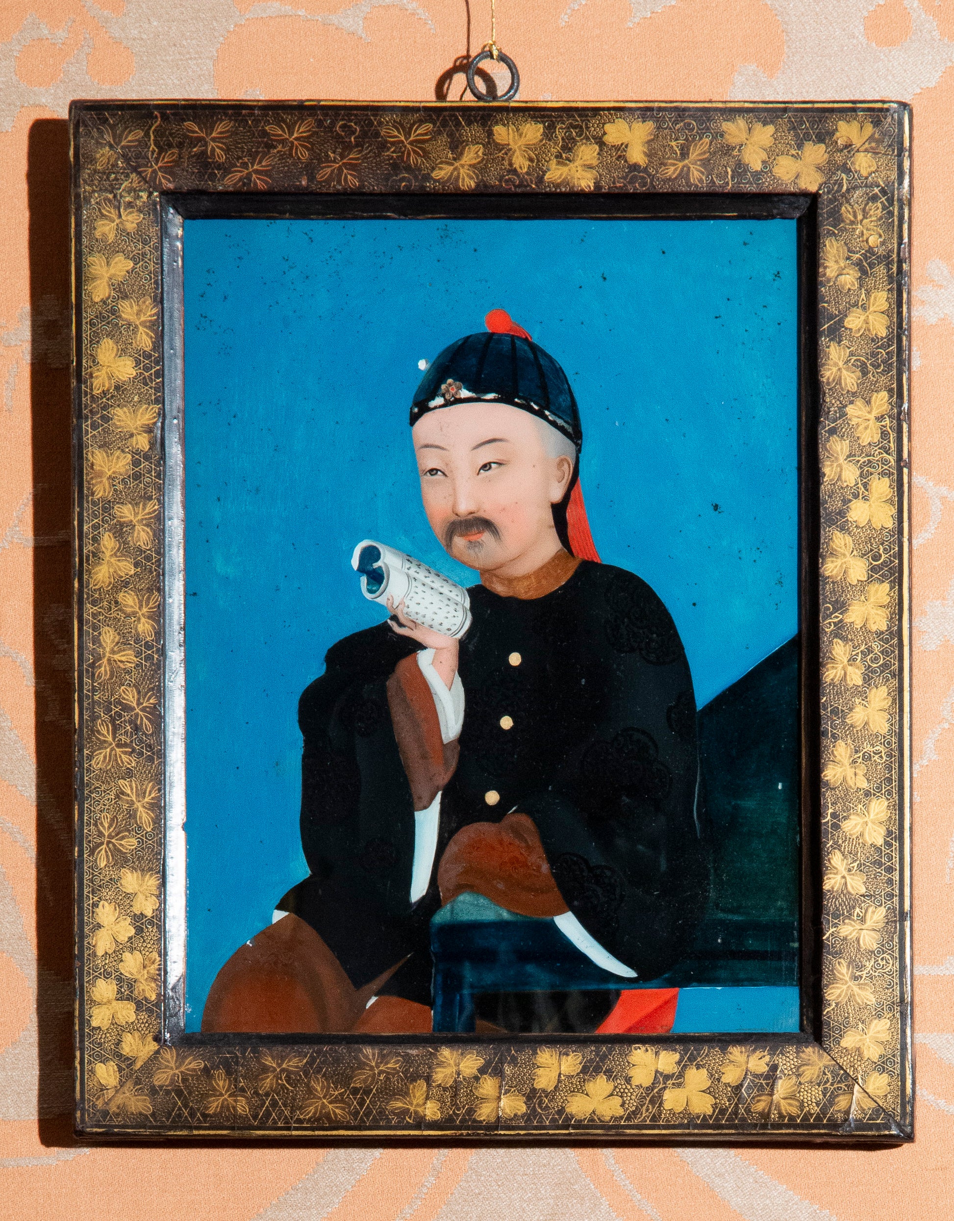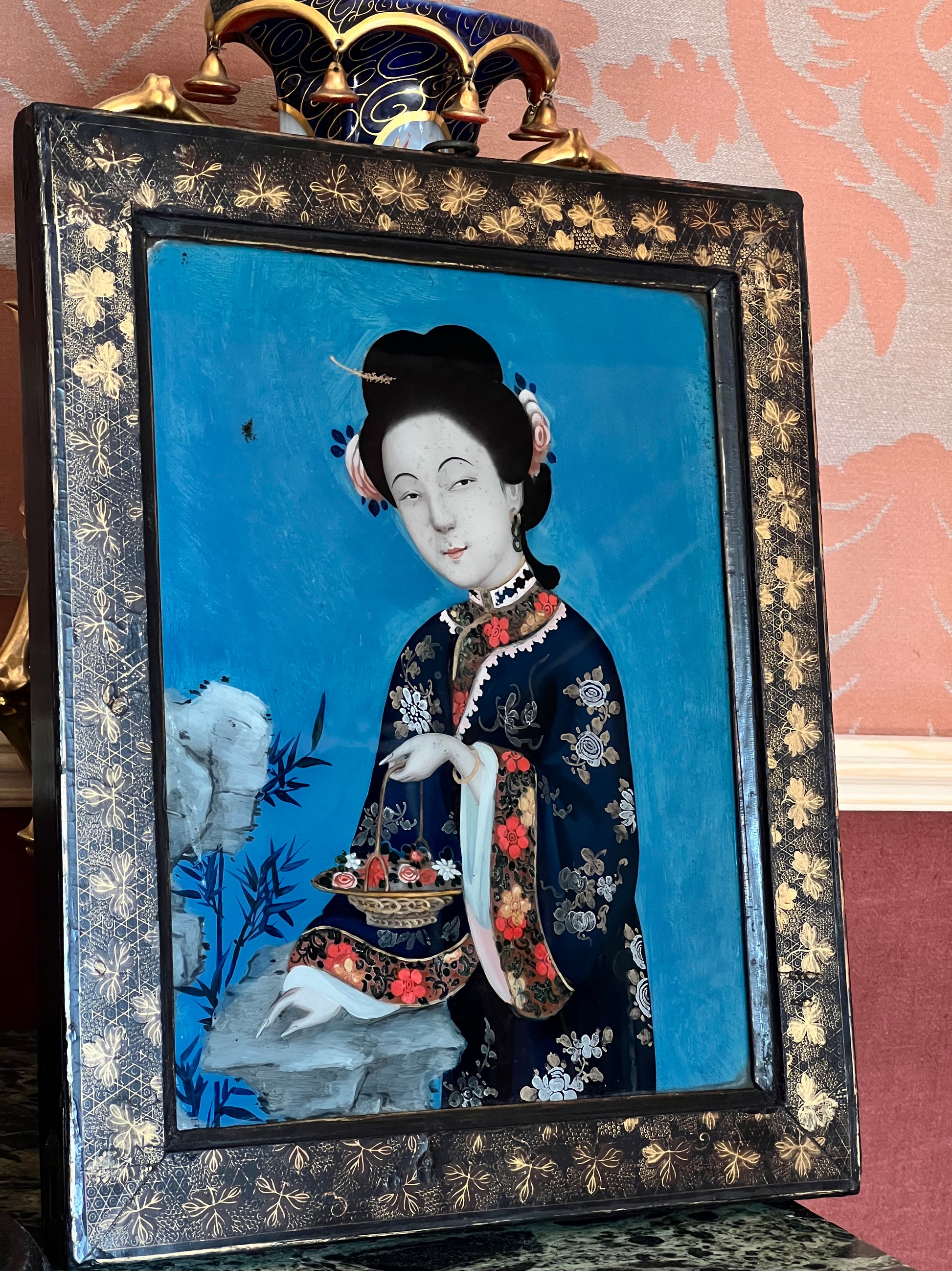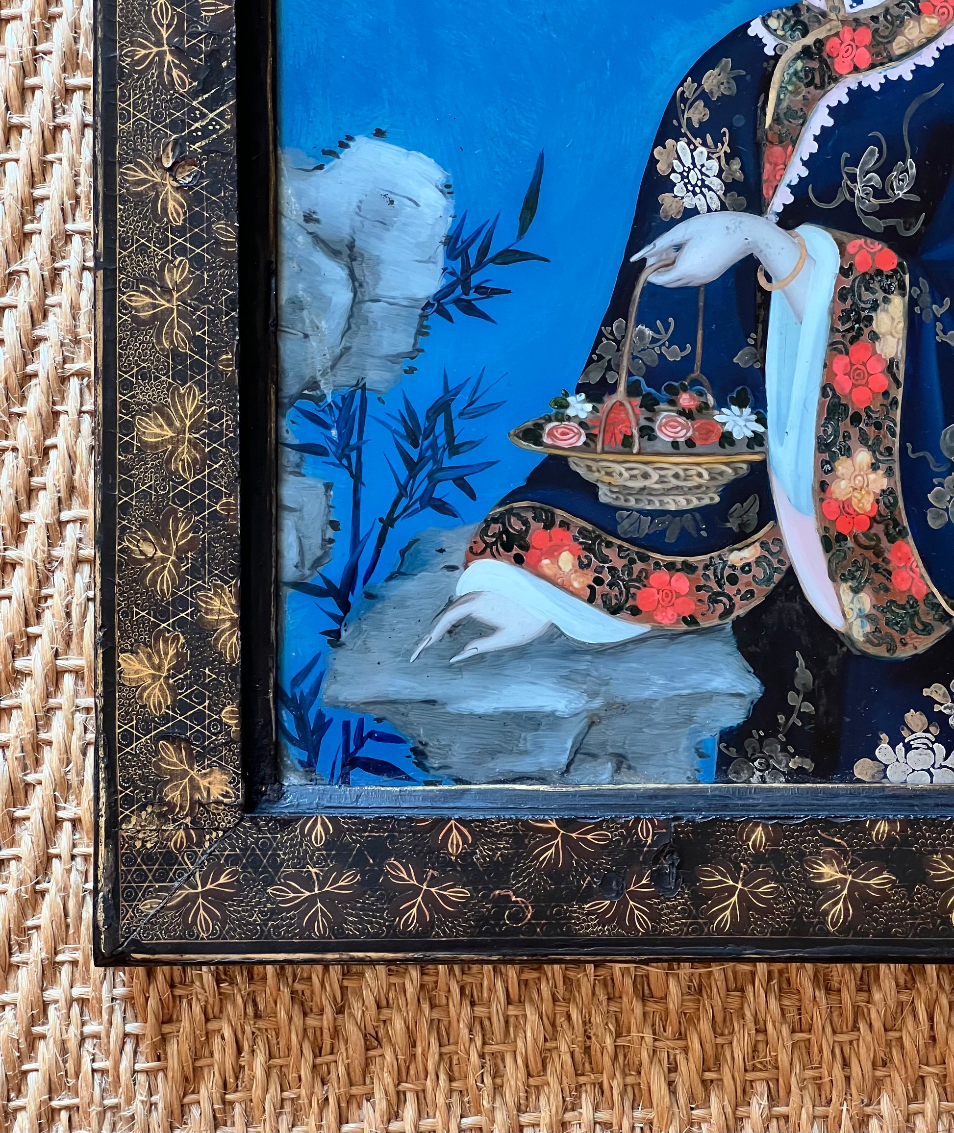A pair of absolutely exquisite 18th century Chinese export reverse glass portrait paintings in 18th century lacquer frames. Canton, circa 1800.