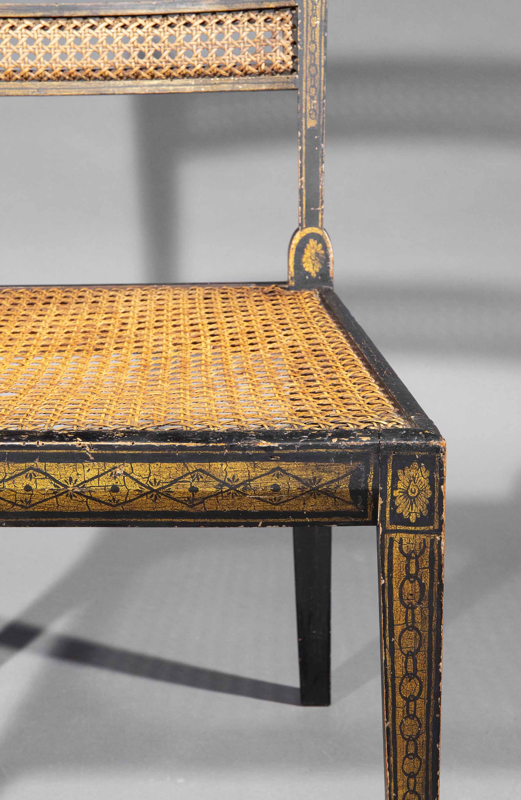 Old restorations, wear and touch-ups to decoration, original canework. Minor old worming to frames. Sturdy and ready for immediate use. Custom squab cushions may be made upon request.