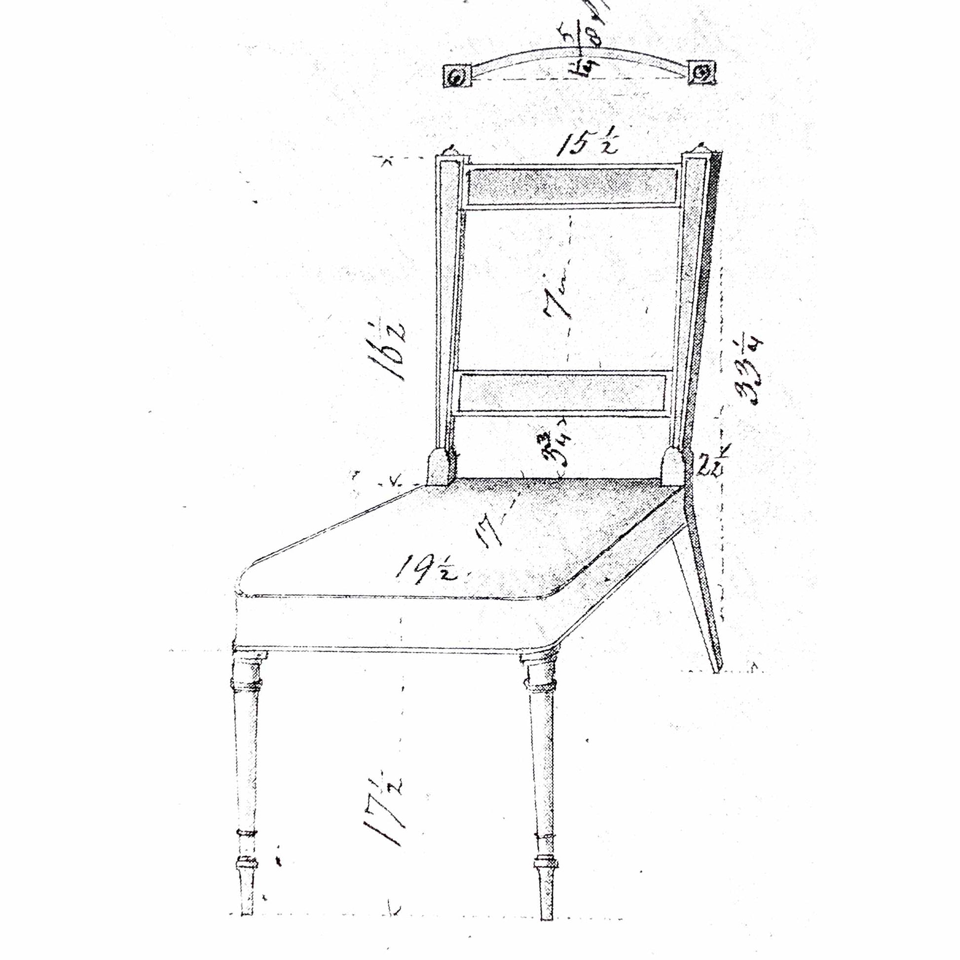 These chairs virtually match the Gillows design dated 24.7.1799 that is preserved in the Westminster archives and published in L.Boynton, Gillow Furniture Designs 1760–1800, fig. 287. Essentially a lighter version of this design, with their caned seats and back panels instead of upholstery and veneers, these chairs share the same distinctive elements such as the tapered square-cut uprights of the backs, terminating in relief paterae.