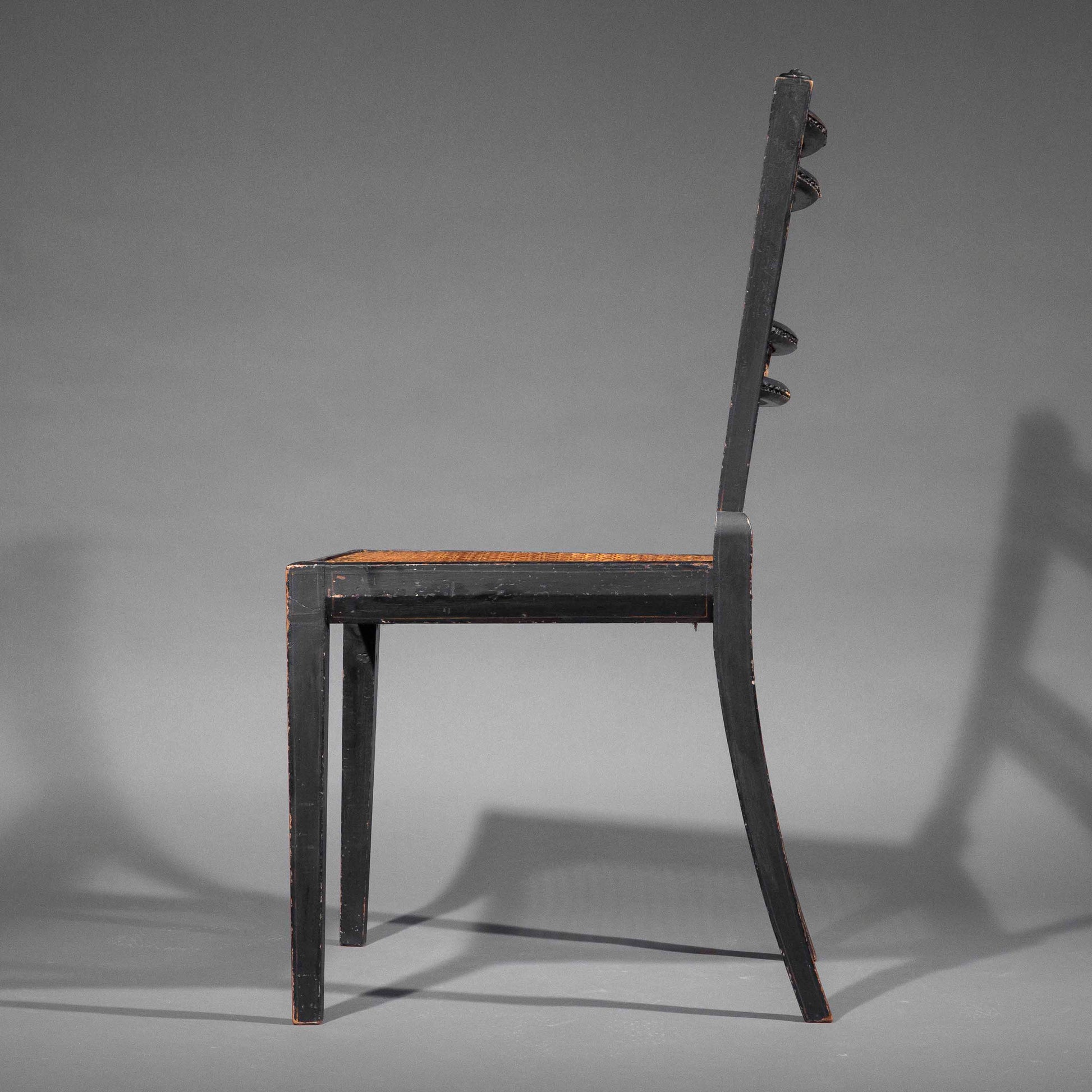 A fabulous pair of chairs, looking gorgeous in their original, distressed ebonised and gilt decoration. Extremely rare, wonderfully elegant design, it looks refreshingly modern and would perfectly suit a classic or a modern home.