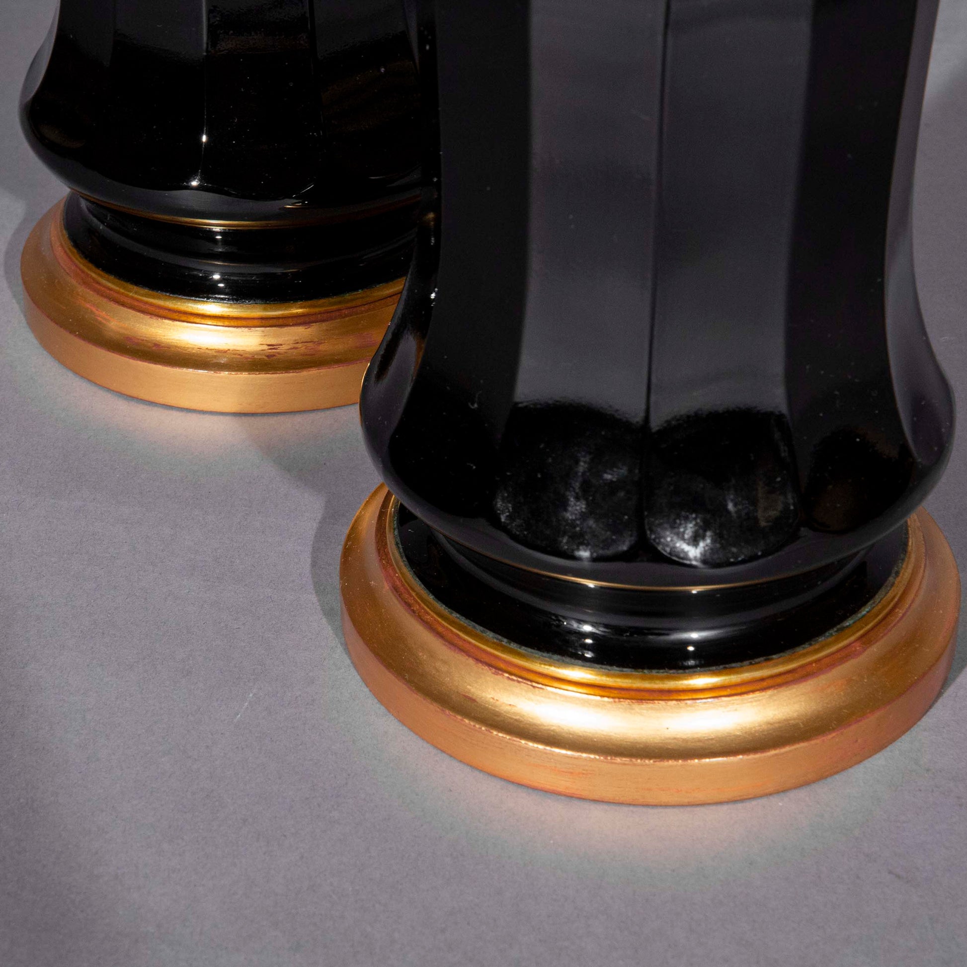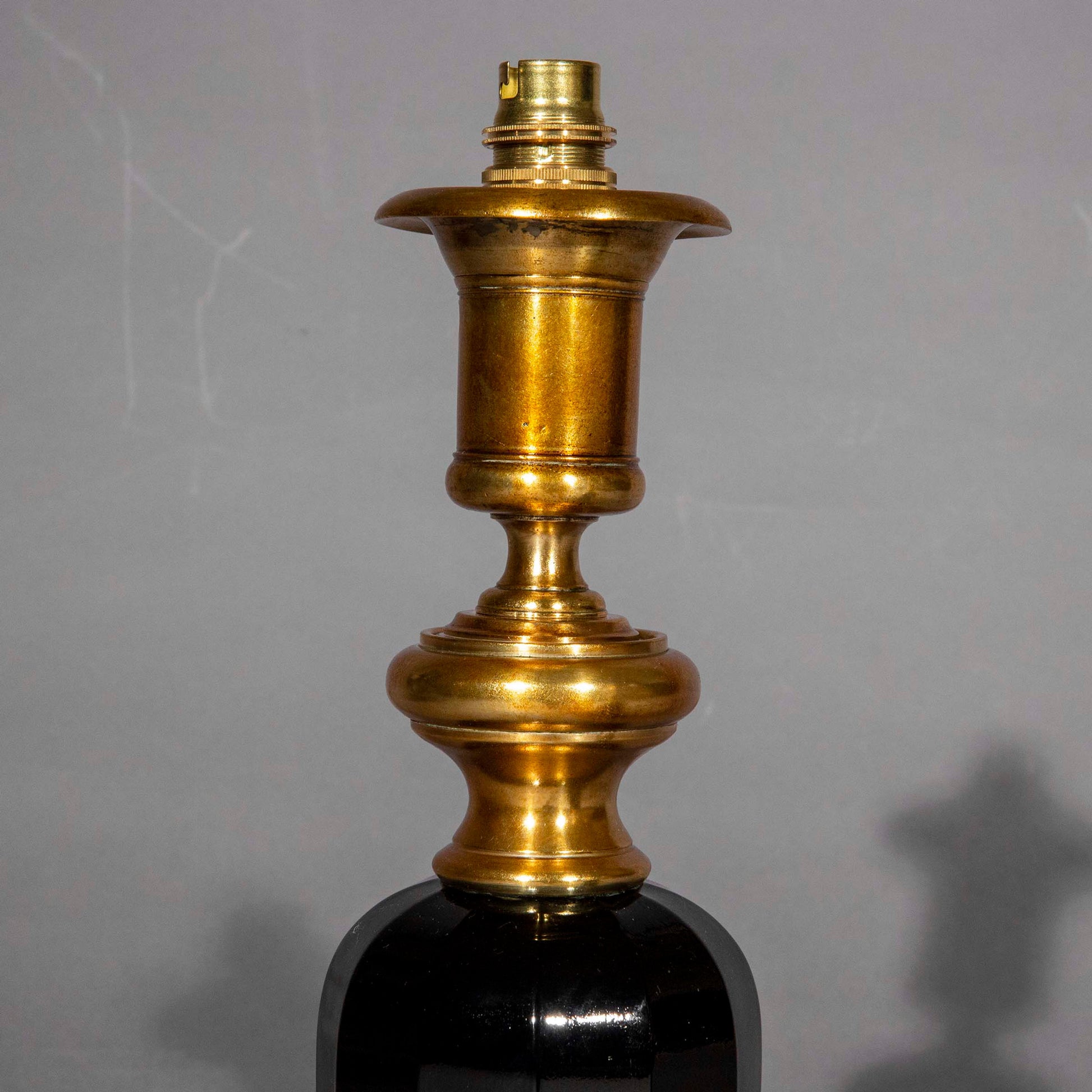 A handsome pair of black glass and bronze table lamps, formerly oil lamps, now converted to electricity.