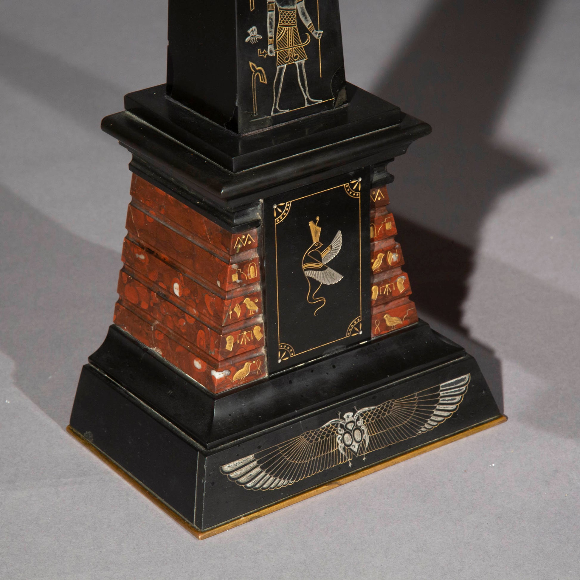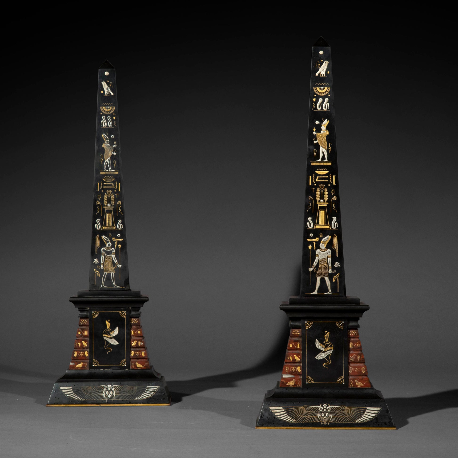 A superbly decorative pair of 'Goût Égyptienne' obelisks in black and Rouge Griotte marbles, with exquisite relief decorations picked out in silver and gold.