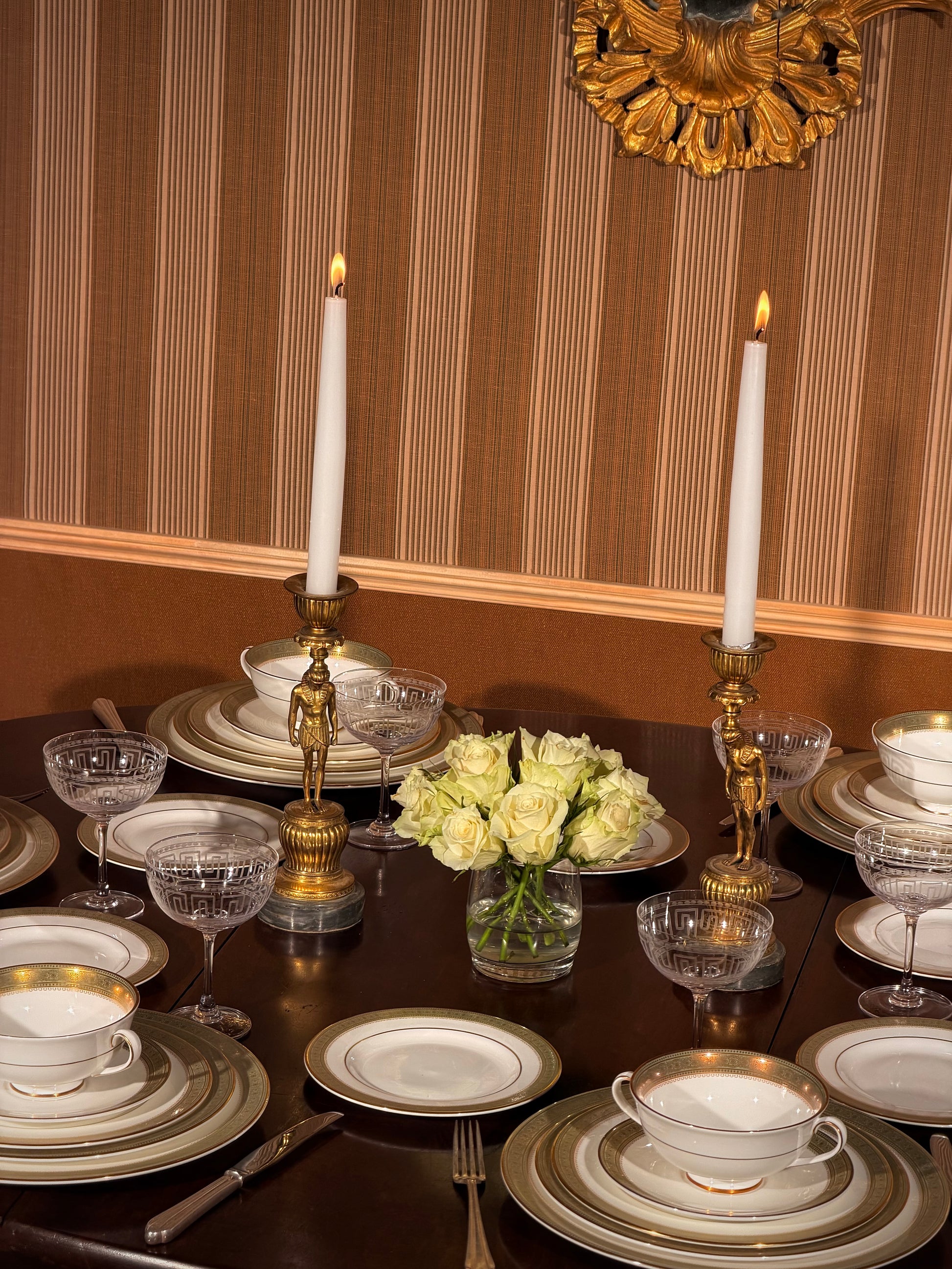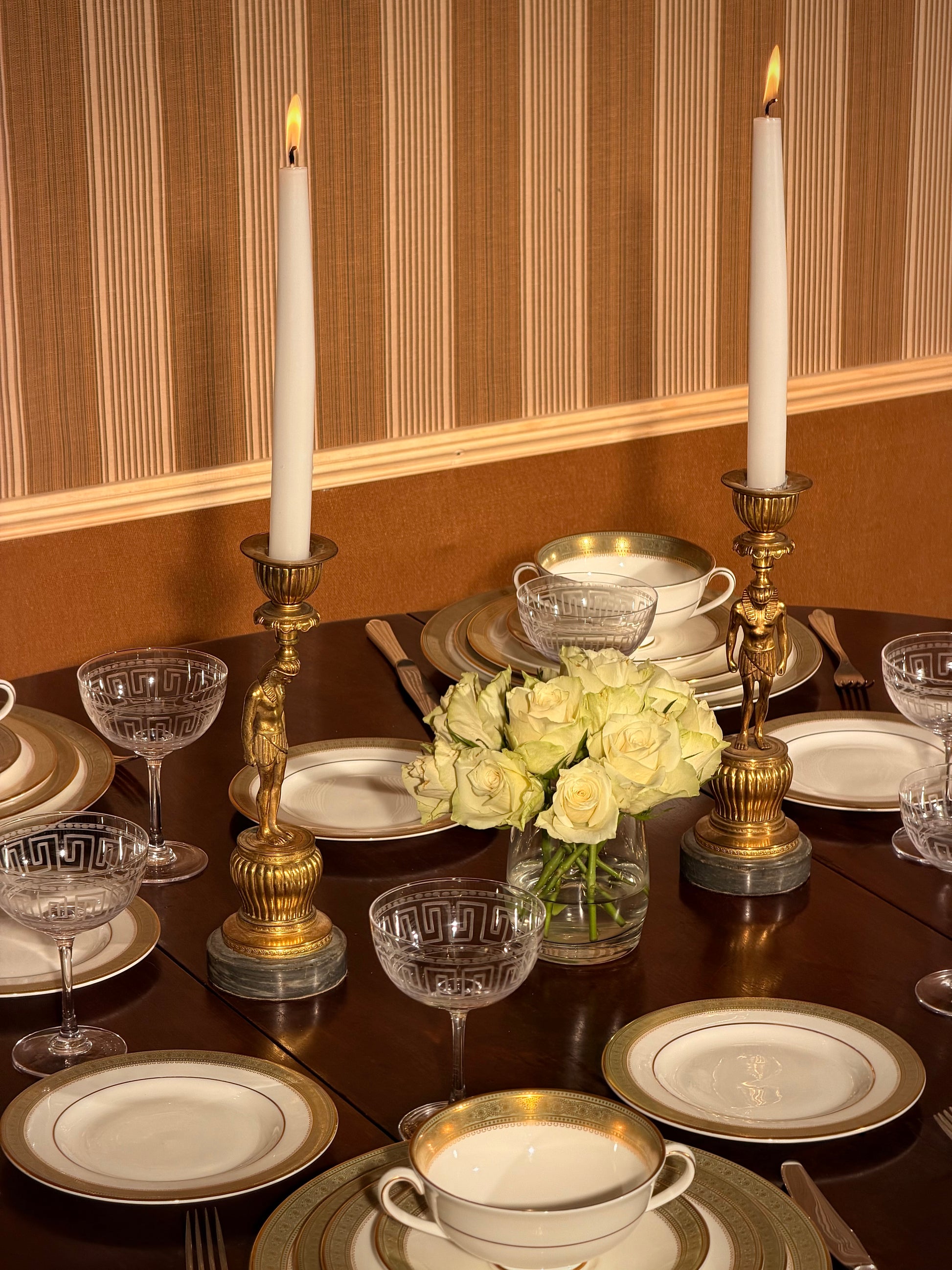 The combination of this moving historical reference with the intricate craftsmanship of the ormolu and fluted candle holders speaks to both the artistry and the deeper narrative presented in these candlesticks. The stately posture of Antinous, with his Egyptian-inspired attire, echoes the grandeur of the ancient world while evoking a rich romanticism that captivated 19th-century France. Such pieces would have originally graced the interiors of a well-appointed 19th-century home, reflecting the fascination with ancient Egyptian culture that surged in France following Napoleon's campaign in Egypt. Whether for a collector of antique decorative arts or a connoisseur of French design and interior decoration, this pair offers both historical significance and timeless beauty.