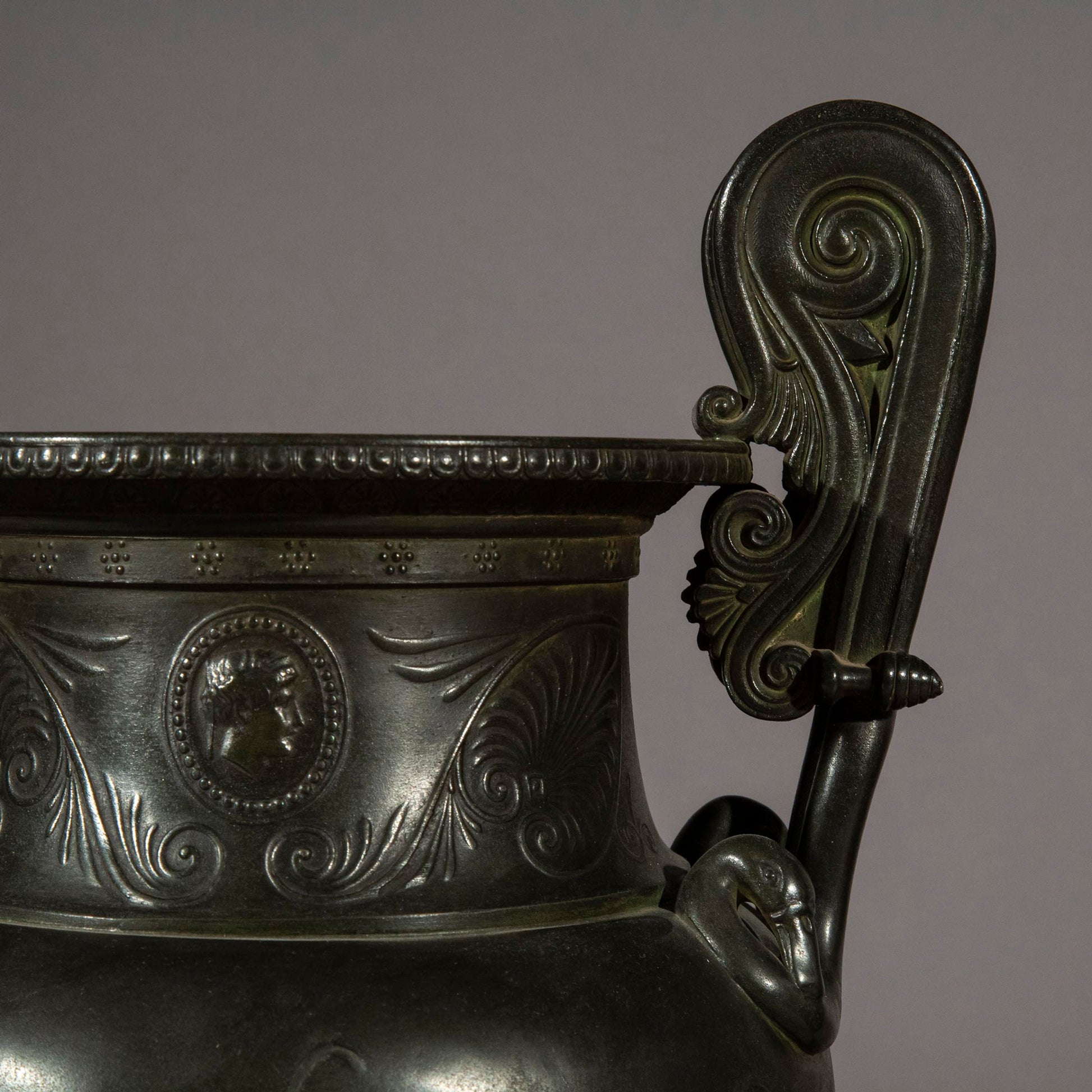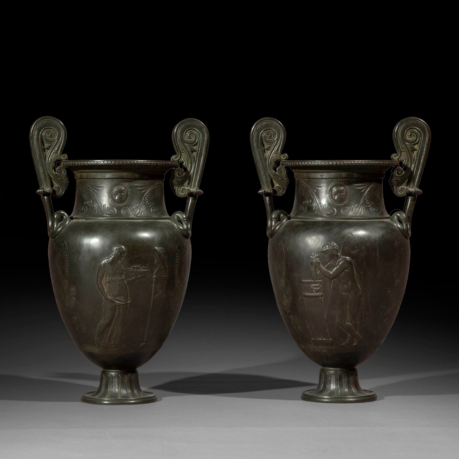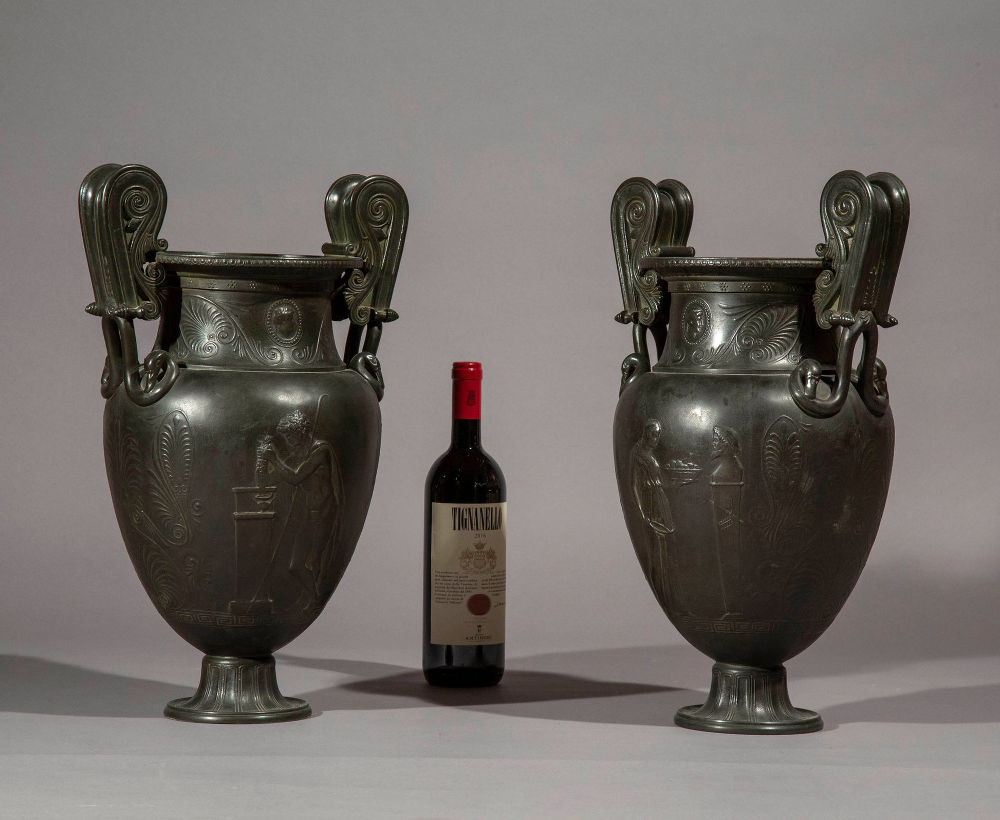 An unusually large and decorative pair of Grand Tour bronze vases of ancient Greek volute krater form,