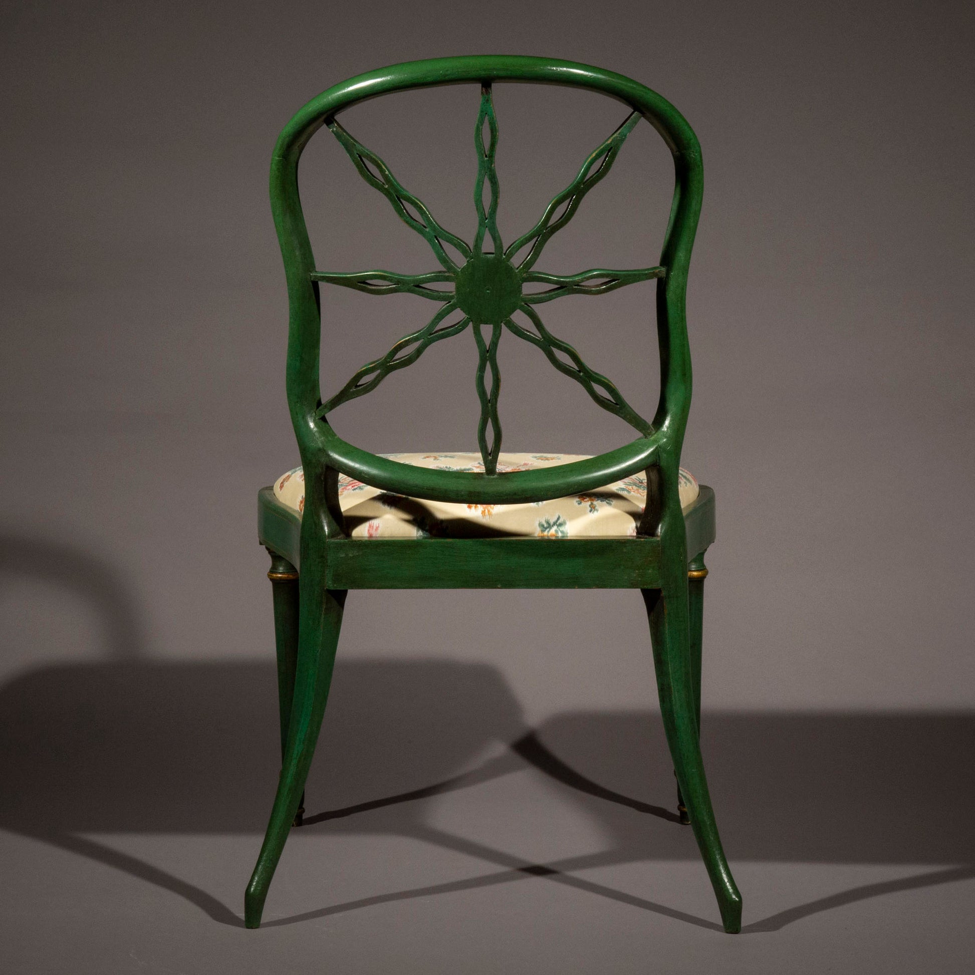 This model with its distinct sunburst-backs is very similar to a set of chairs photographed by Edwin Smith in ‘The Balcony Room’ at Dyrham Park, Gloucestershire, in 1971. In 1774, Thomas Chippendale supplied 'green and white japanned' ‘Star back’ chairs for Paxton House, Scotland (C. Gilbert, The Life and Work of Thomas Chippendale, London, 1978, vol. II, p. 271 and fig. 164). Henry Hill of Marlborough also used a similar pattern for chairs supplied to Thomas Mansel at Penrice Castle, Glamorgan, in 1778 (illustrated Lucy Wood, The Upholstered Furniture in the Lady Lever Art Gallery, Volume II, Singapore, 2008, p. 628, fig. 394). Although displaying similarities with a number of other fine examples, a firm attribution for this pattern remains elusive and requires further research.