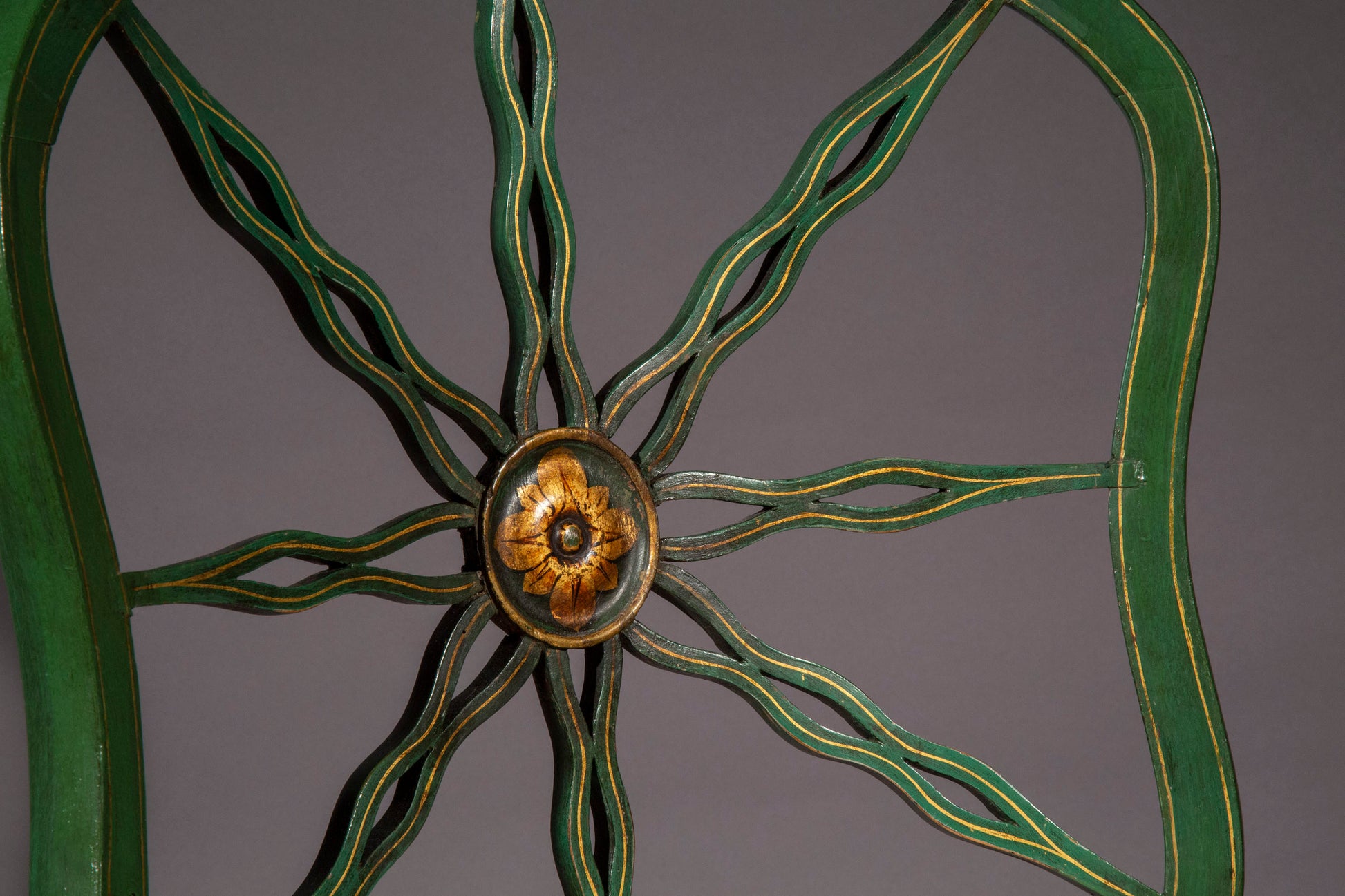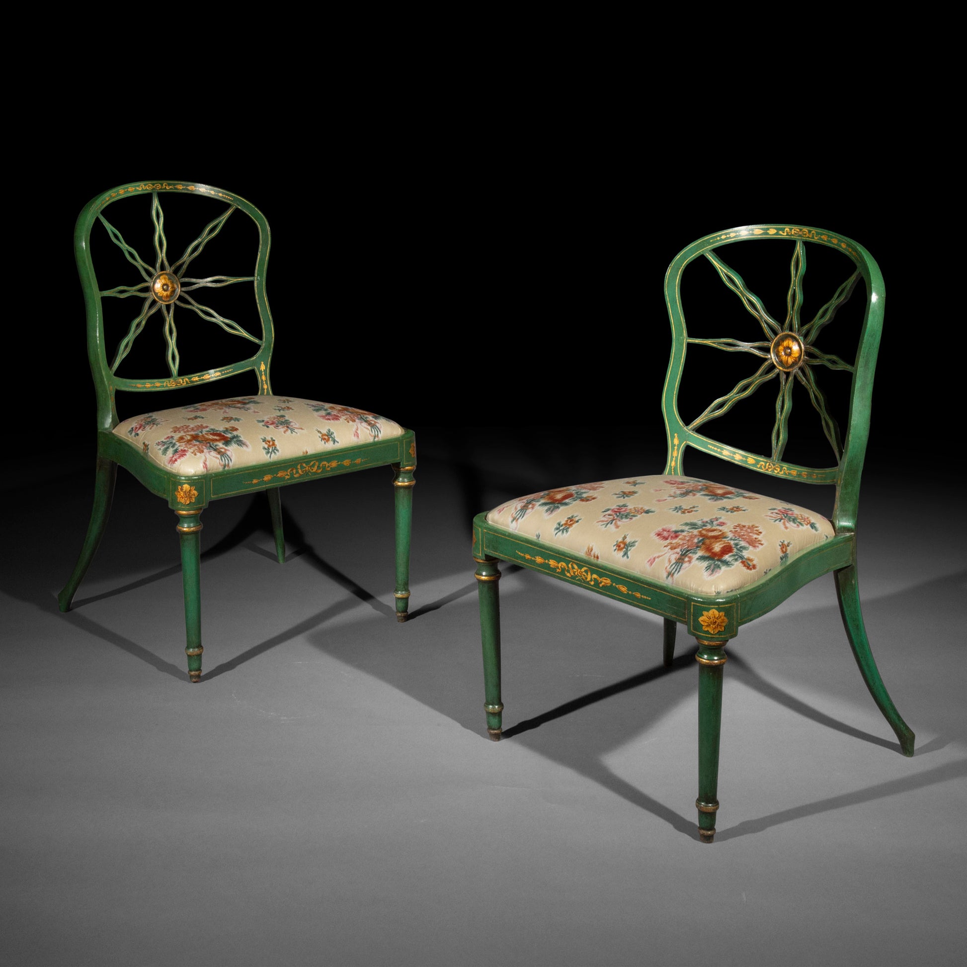 Their delicate and unusual shape, with boldly splayed back legs and intricate backs, alluding to 'The Sun King' Louis XIV, together with the rare, supmtuous green 'japanning', emblematic of the early neoclassical era in English interior design, make these superbly decorative chairs very attractive and desirable.