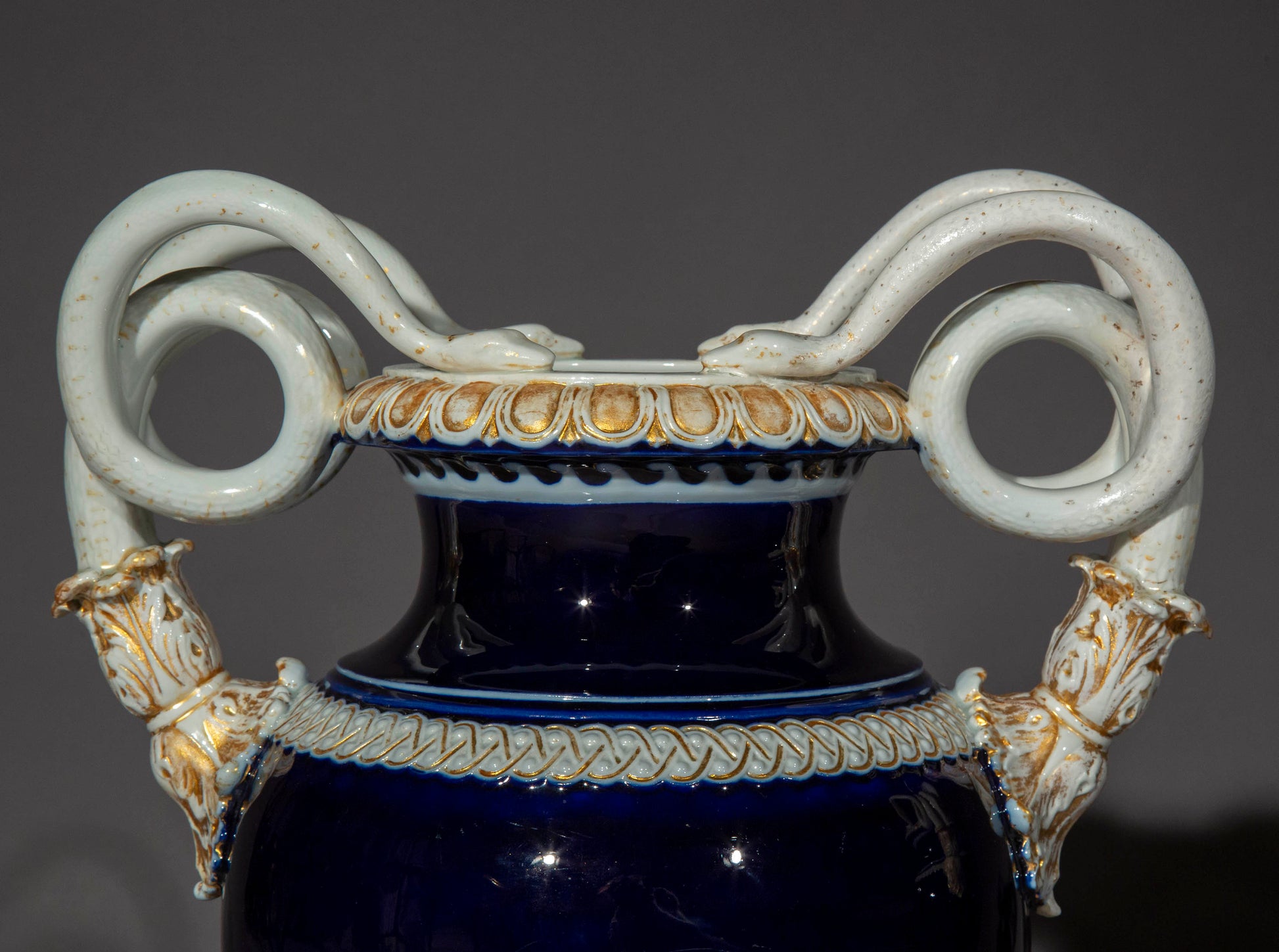 A large and decorative pair of Meissen porcelain vases, of ancient Roman krater form, with handles shaped as entwined serpents (Schlangenvasen)