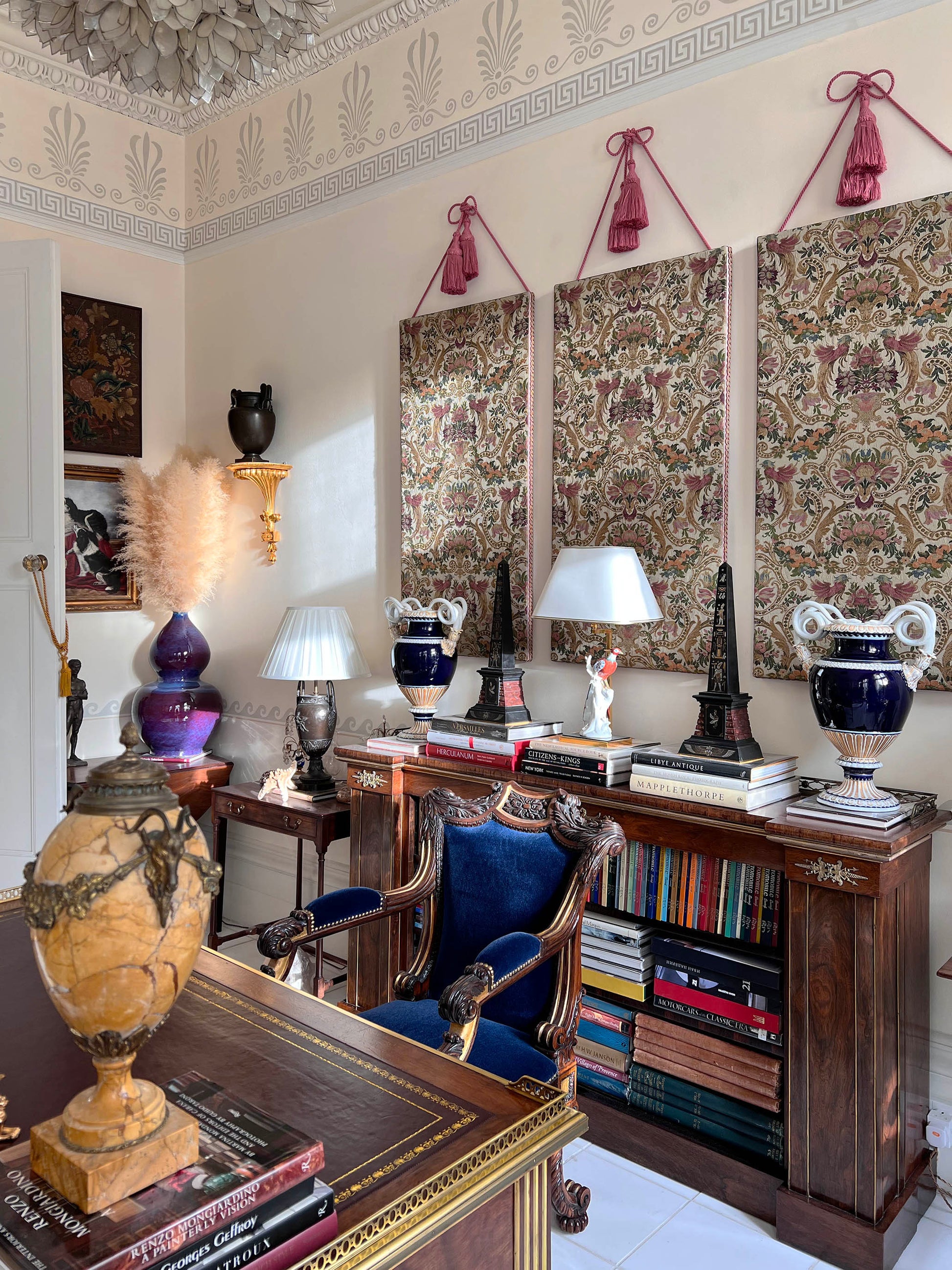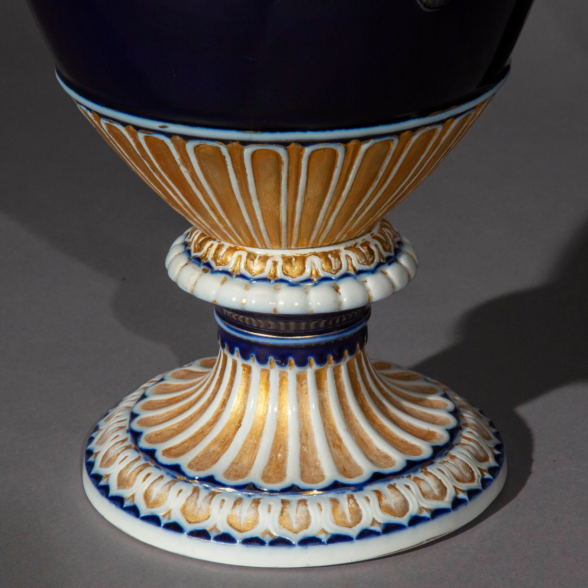 Highly ornamental, these vases represent an interesting combination of the restrained, classical form, and the exuberant Renaissance-revival decoration with rich cobalt-blue and gold. Perfect for lamp conversion.