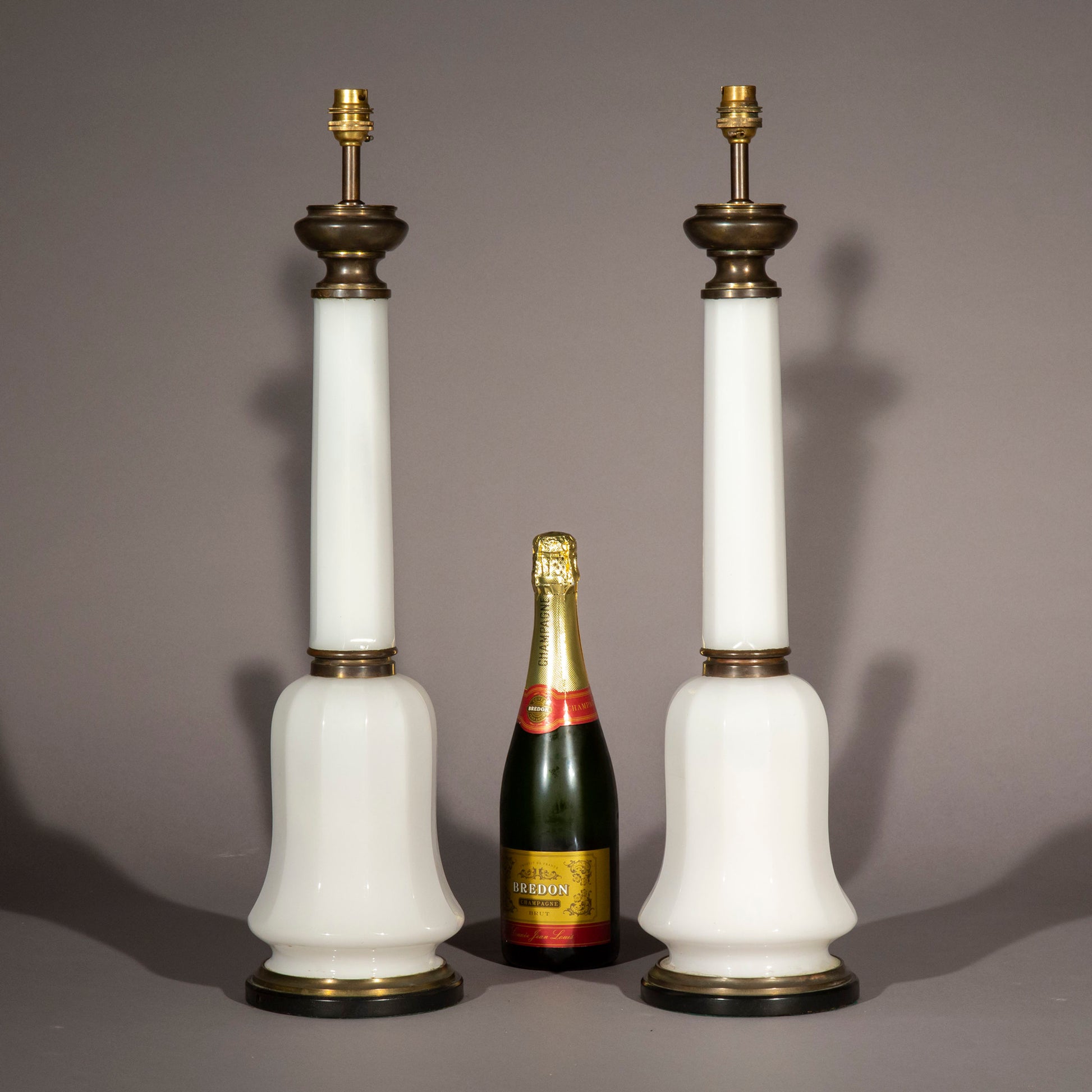 A handsome pair of opaline glass and bronze table lamps, formerly oil lamps, now converted to electricity.