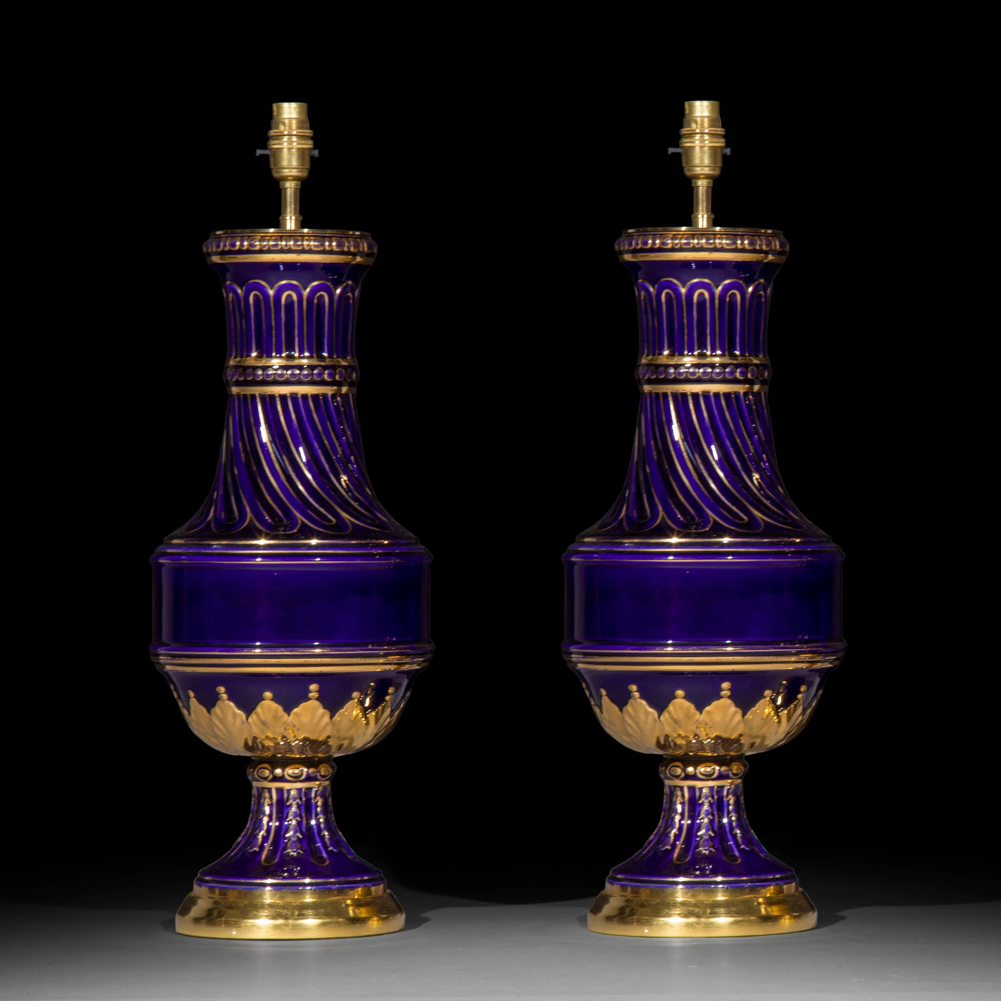 A very decorative pair of Sevres style vases, decorated in Royal Blue cobalt glaze and gilding, mounted as table lamps on water-gilt wooden bases.