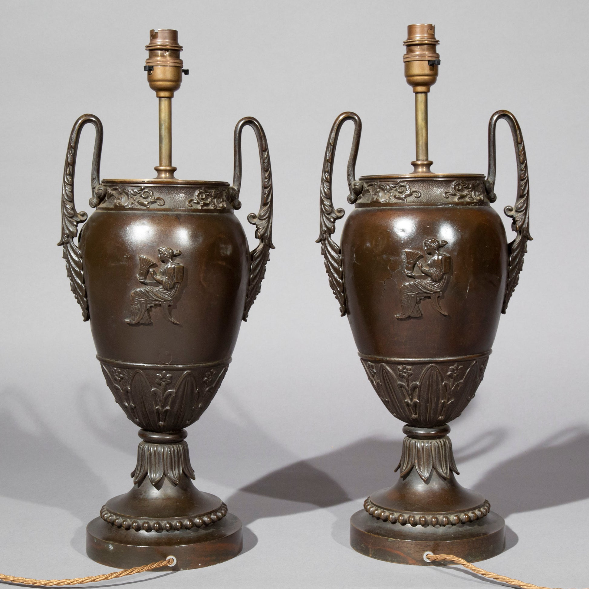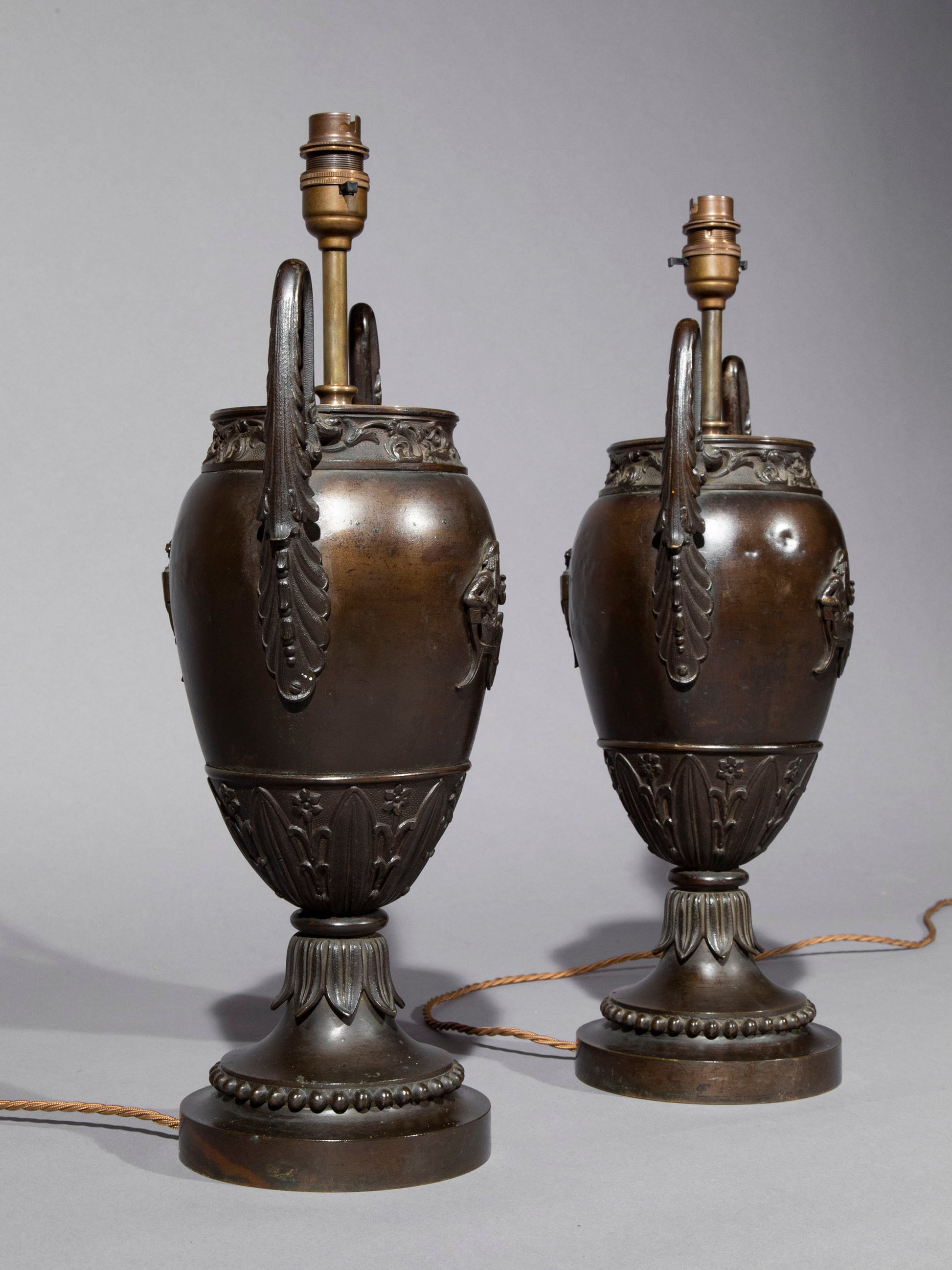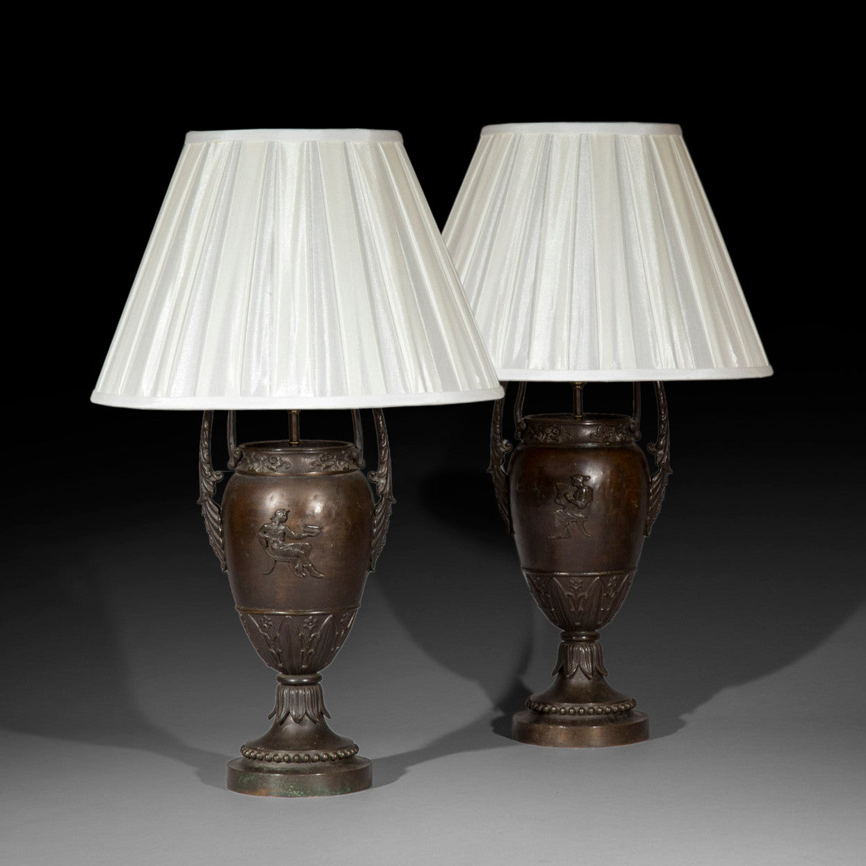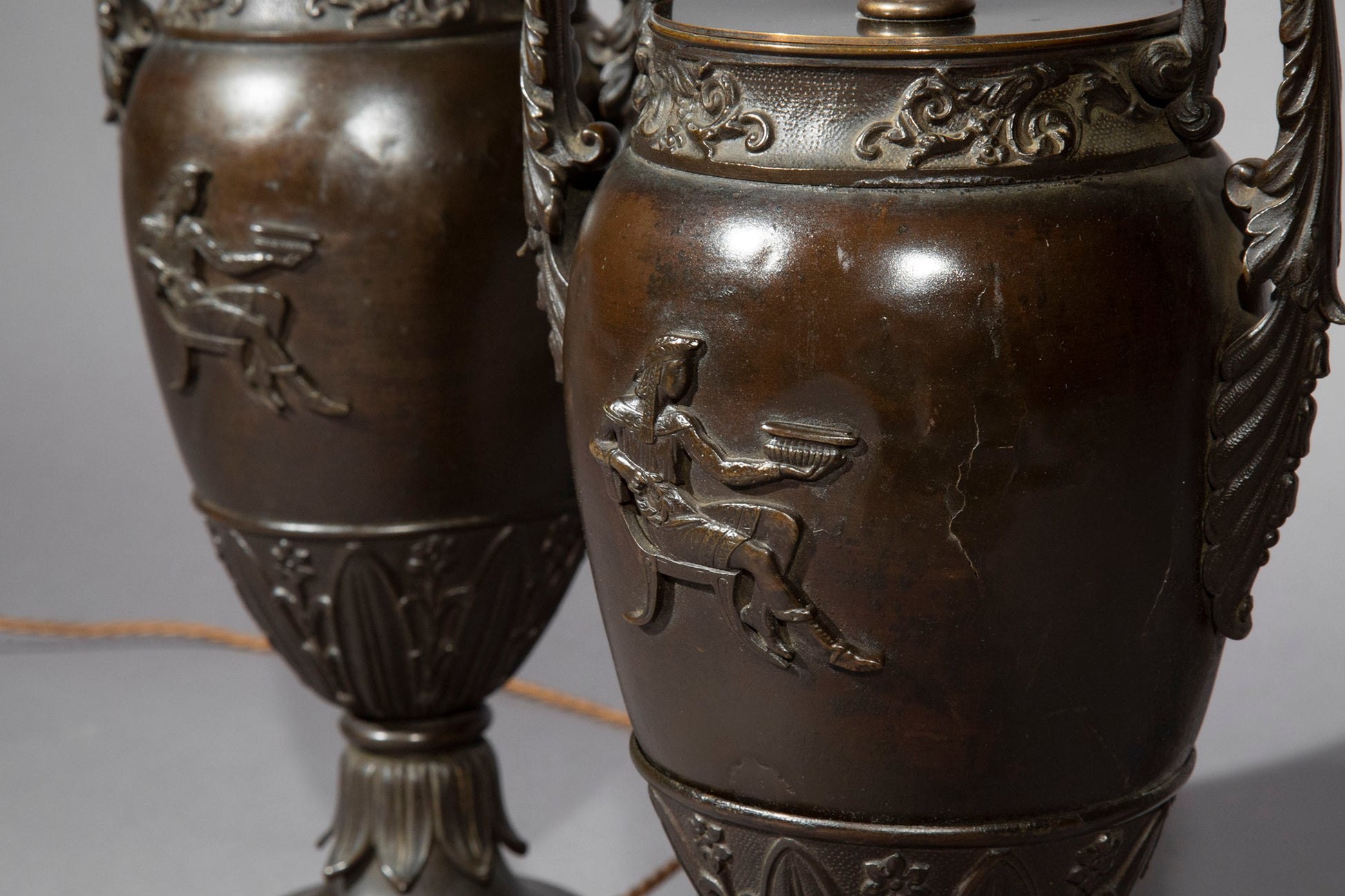 A very decorative pair of antique bronze urns mounted as table lamps,