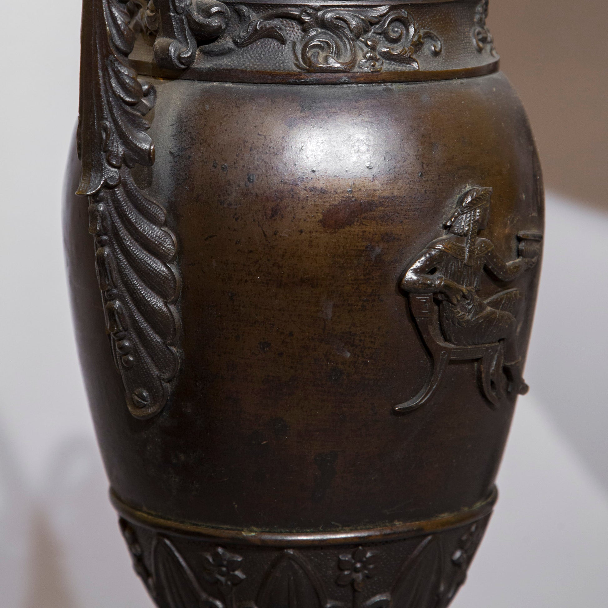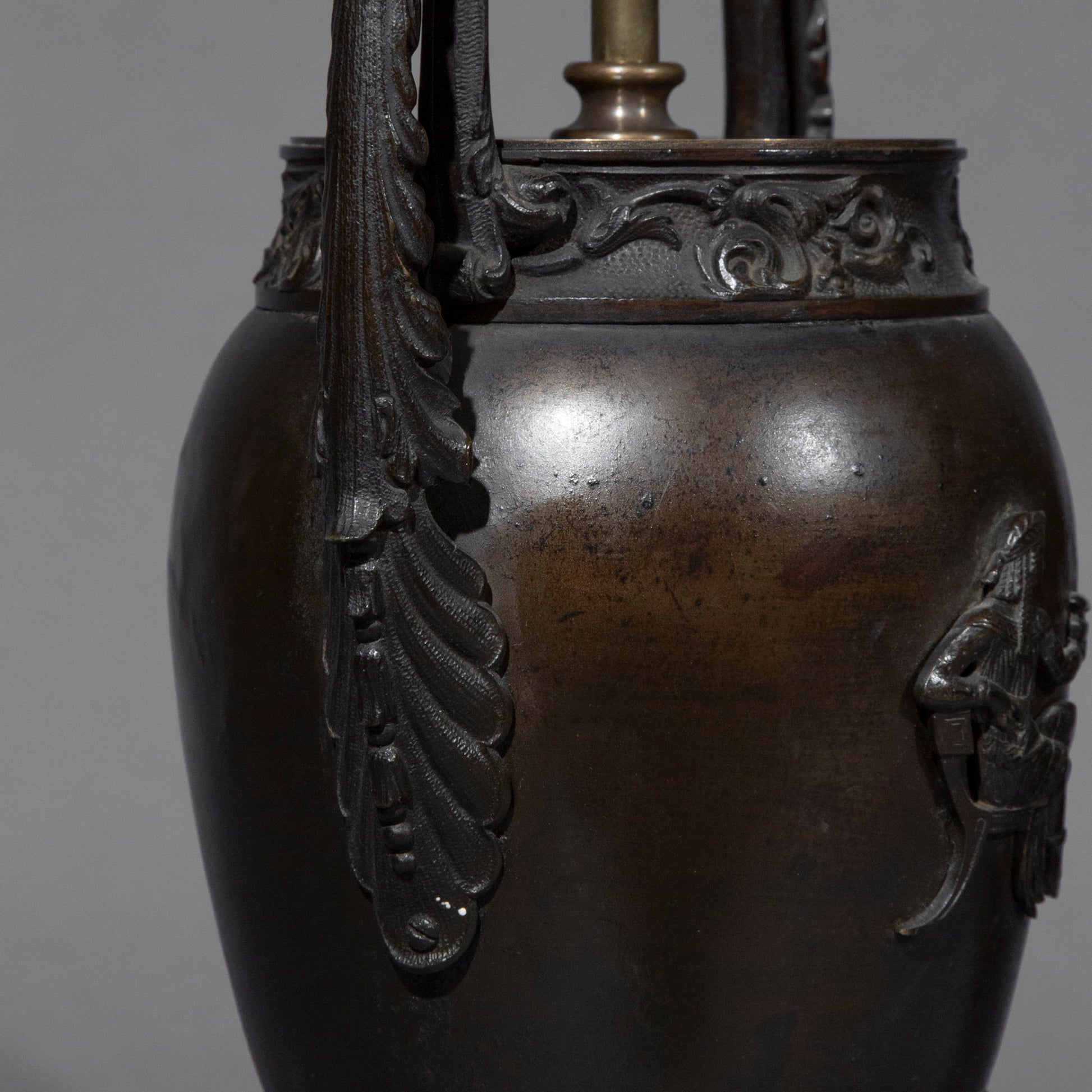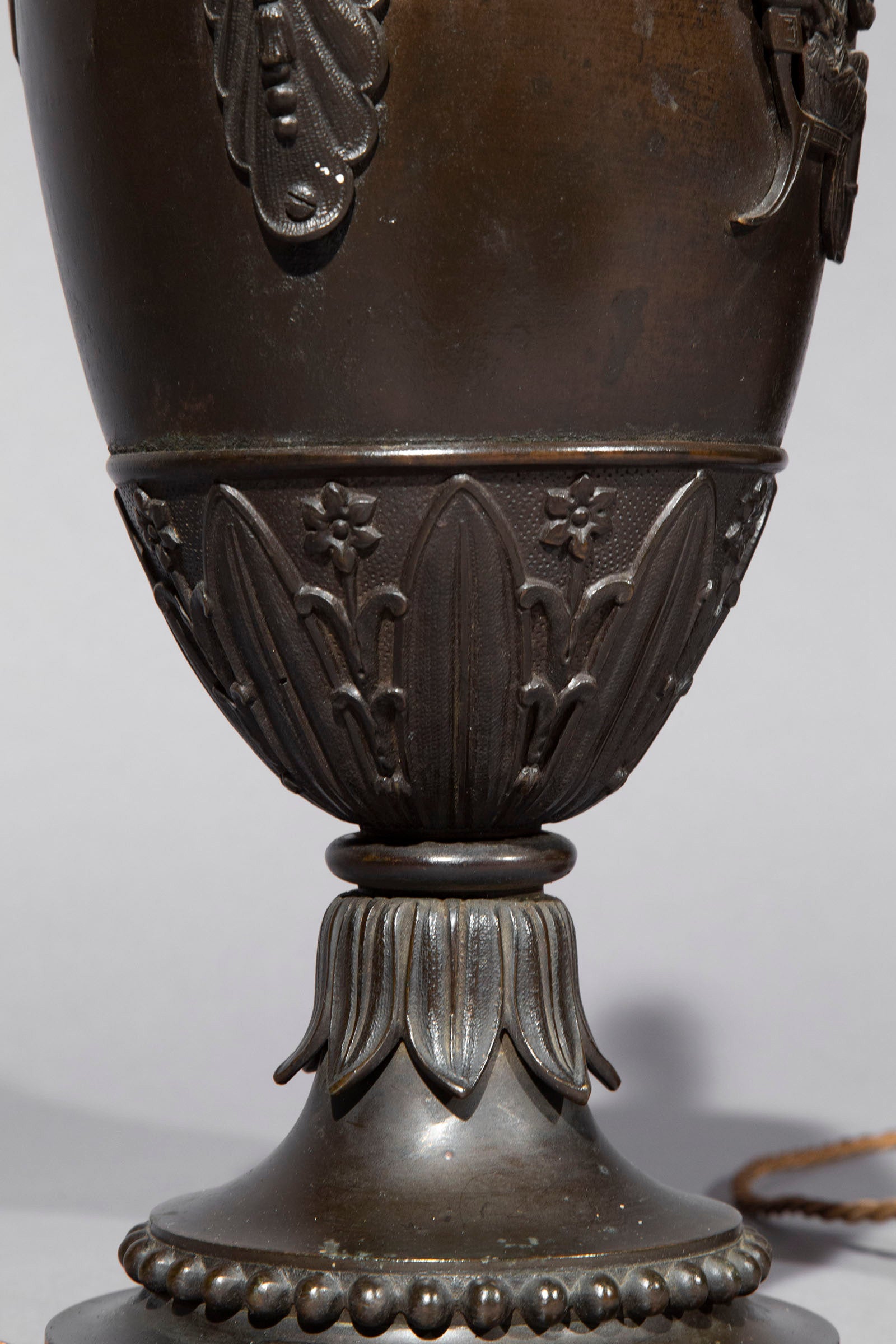 A very decorative pair of antique bronze urns mounted as table lamps,