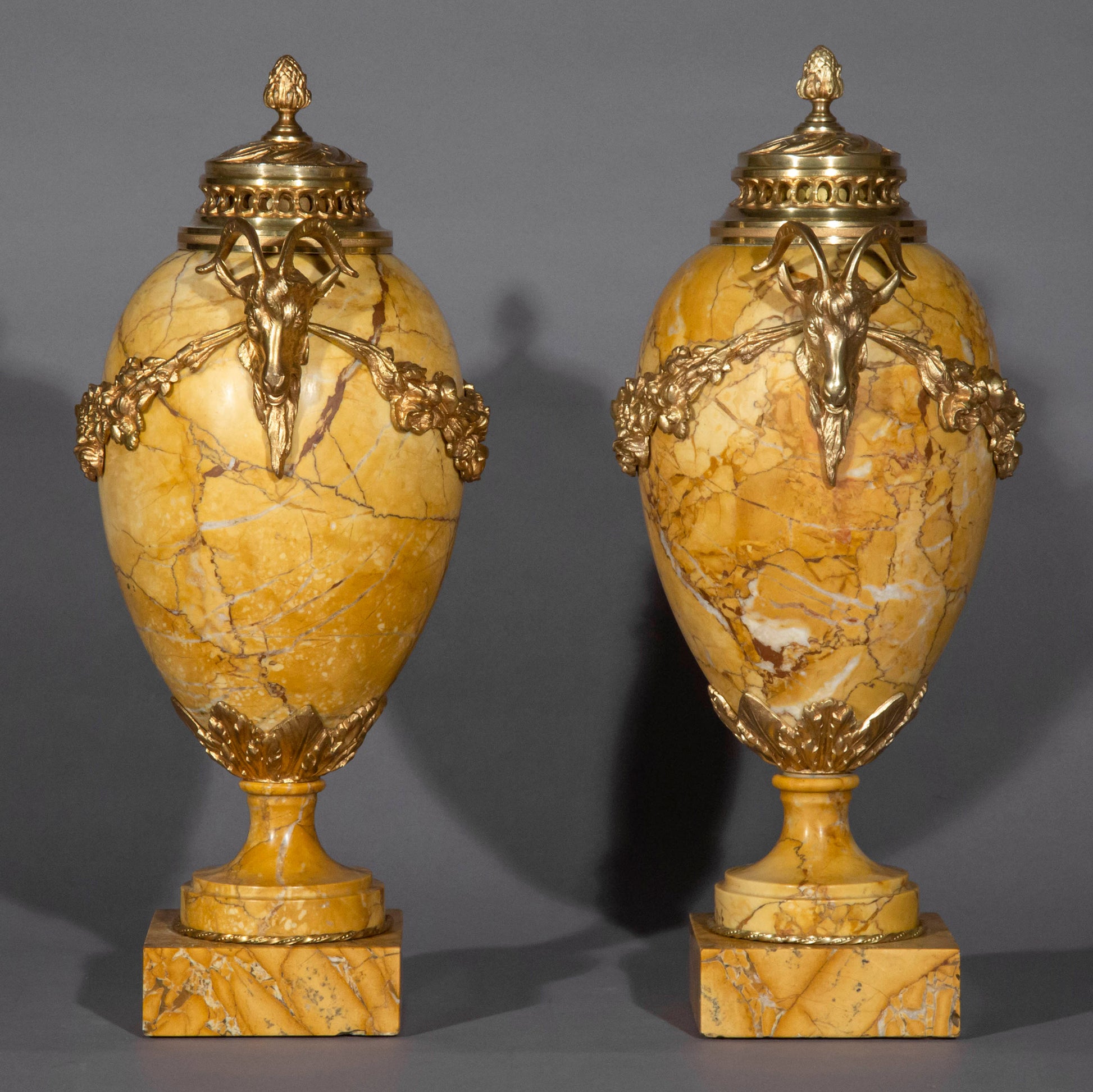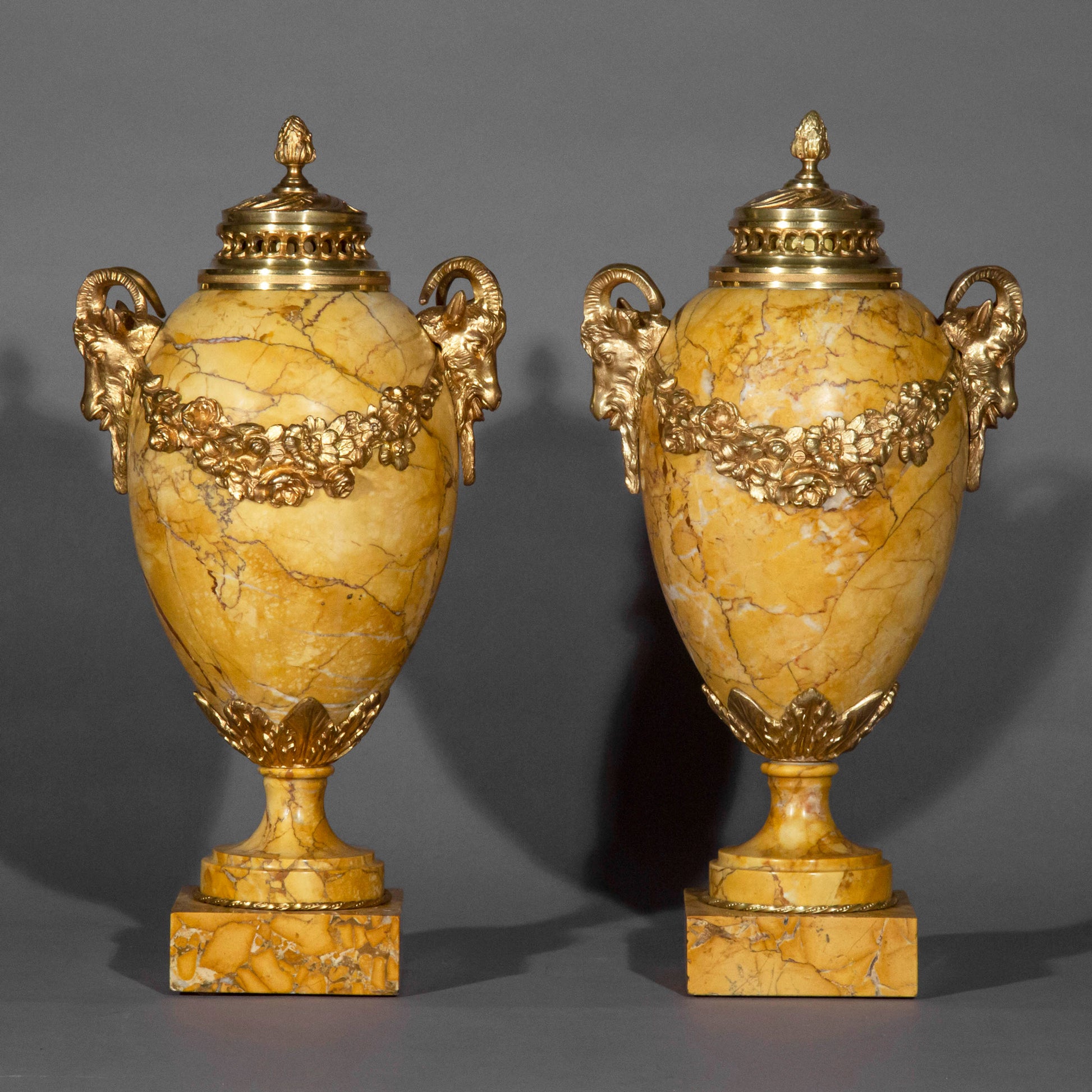 A superbly decorative pair of neoclassical Siena marble urns, with ornate gilt bronze mounts. French, late 19th - early 20th century.