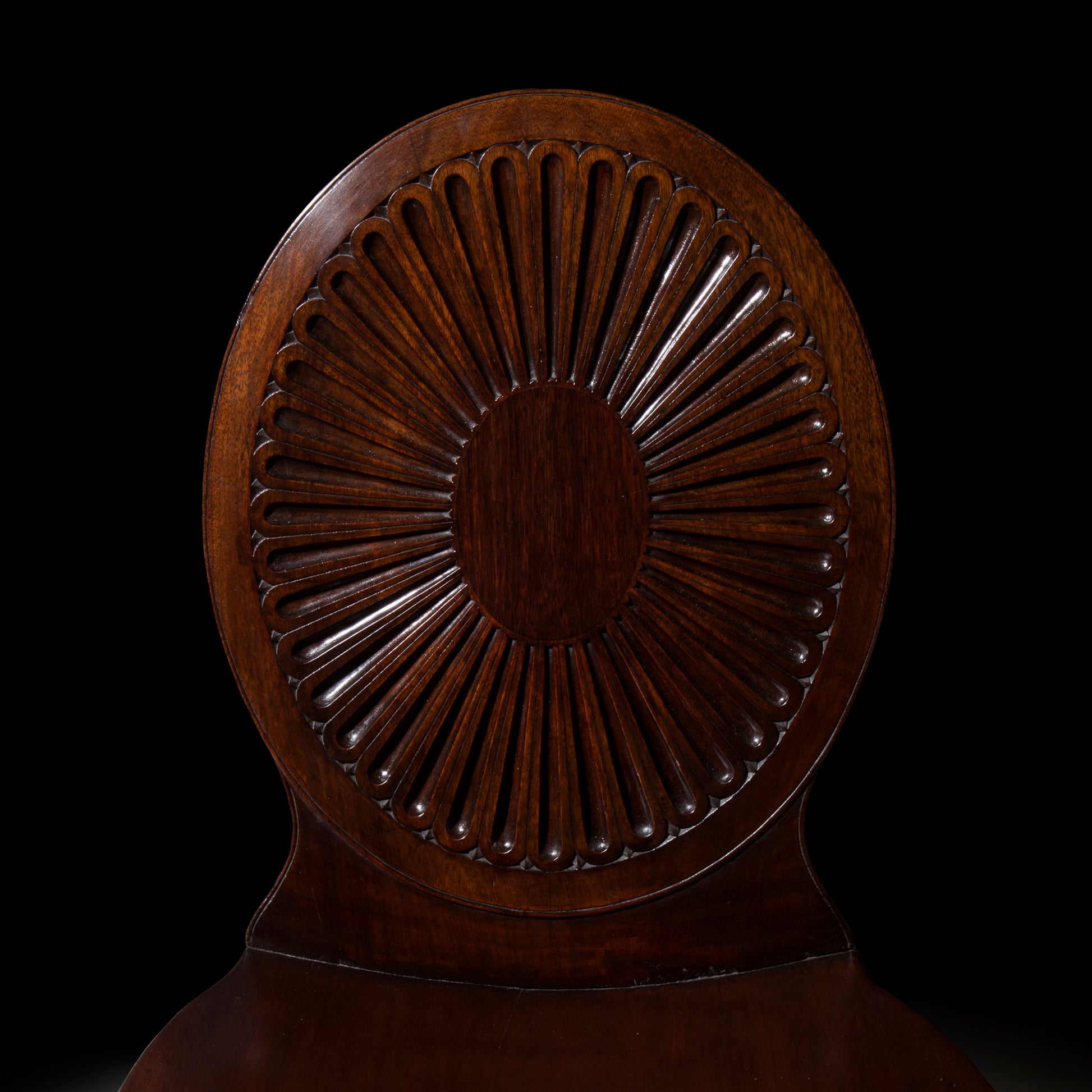 With their distinctive medallion-shaped fluted backs, the present hall chairs are designed in the George III ‘Roman’ fashion, introduced in the 1770’s and promoted by Robert Adam, James Wyatt, and other fashionable designers of the day. This design is found on a set of armorial chairs dating from the 1770’s and attributed to the leading London firm of Mayhew and Ince, sold Christie's, 21 June 2004, lot 54.