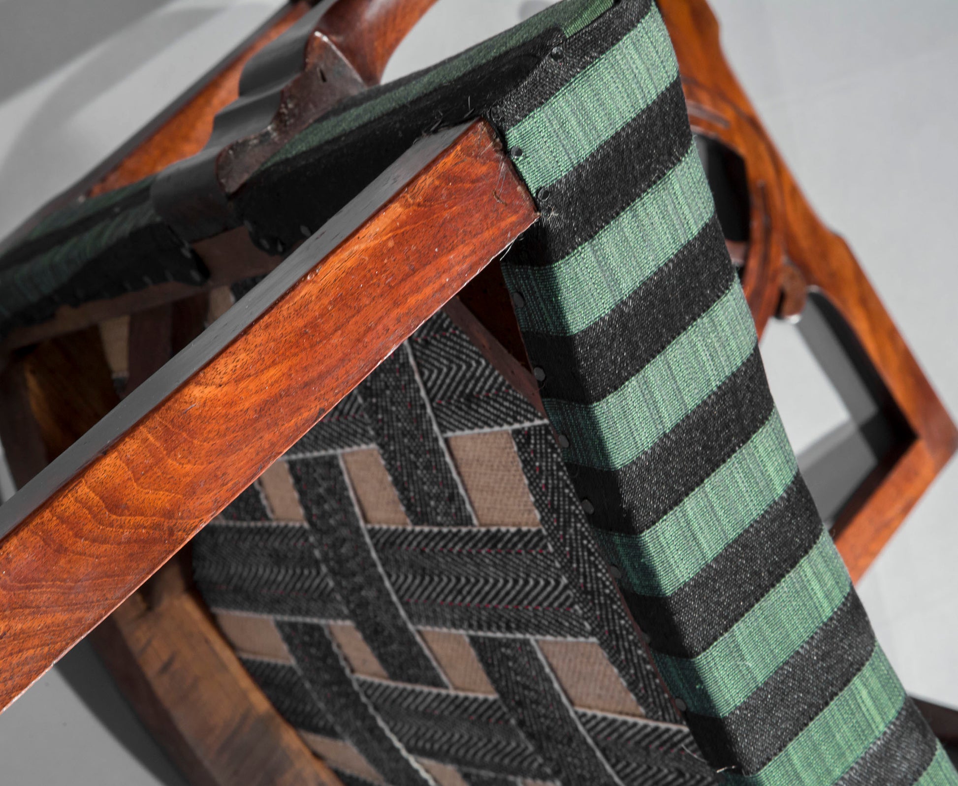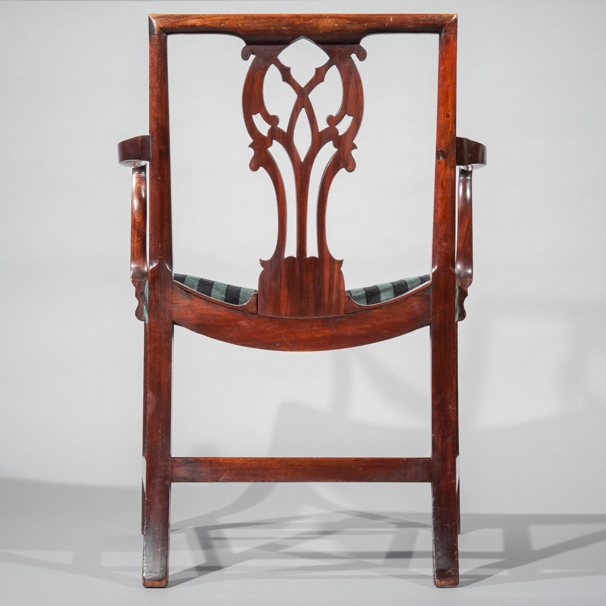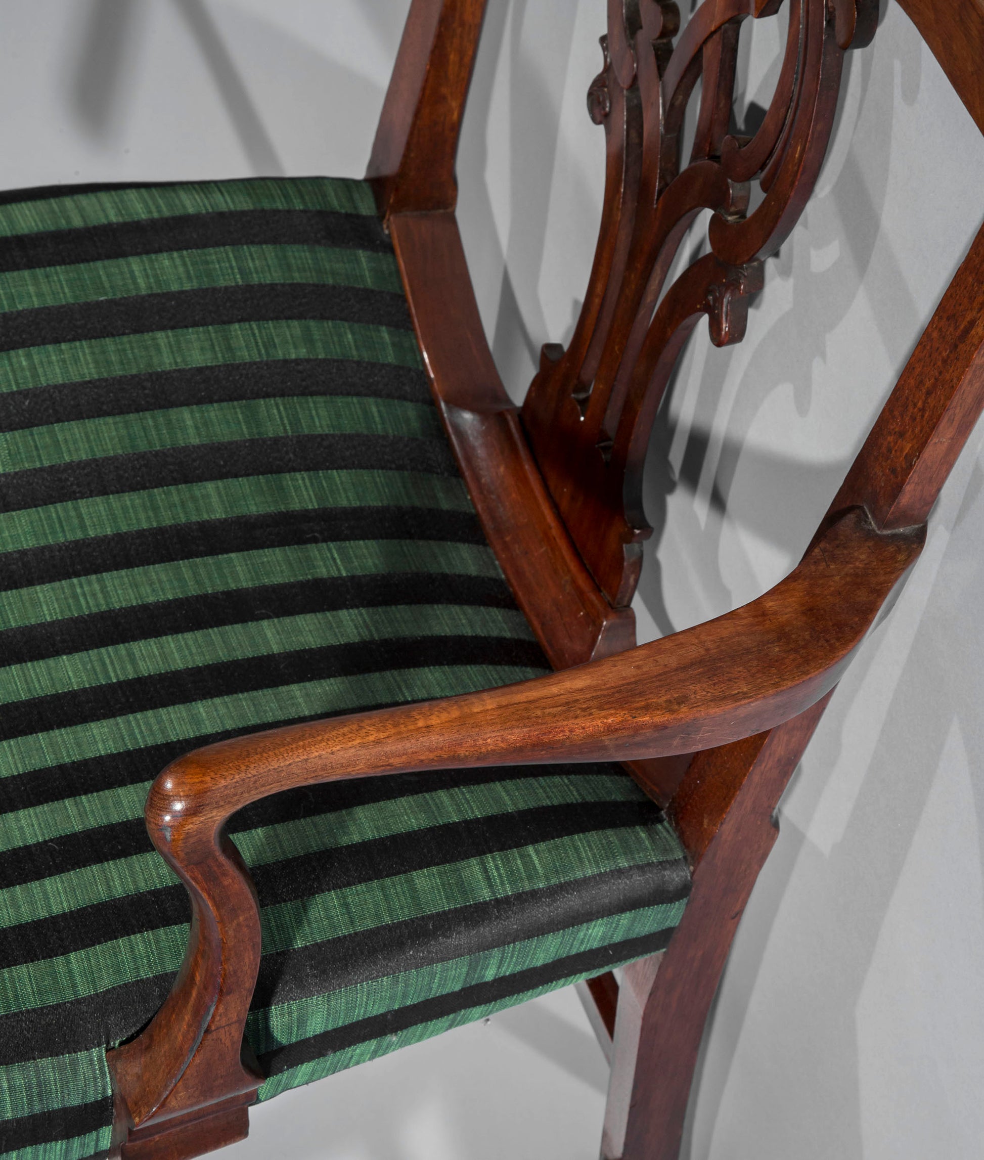 An unusual pair of mahogany open armchairs of the George III Chippendale period, handsomely reupholstered in sumptuous John Boyd Textiles green and black striped horsehair fabric.