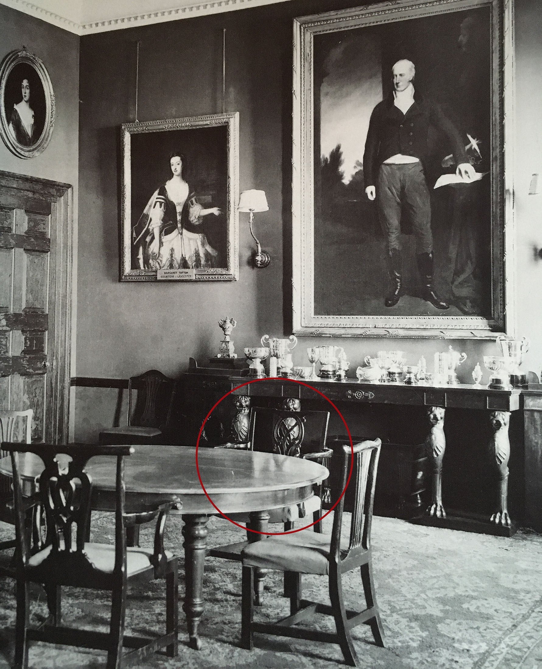 One of these or an identical armchair can be seen on a circa 1910 photograph of a dining room at Wingerworth Hall, Derbyshire, an English baroque countryhouse, which was the seat of the Hunlocke family. The house was demolished in early 1920's with its contents auctioned off; one of the rooms was sold to the St Louis Museum of Art, Missouri.