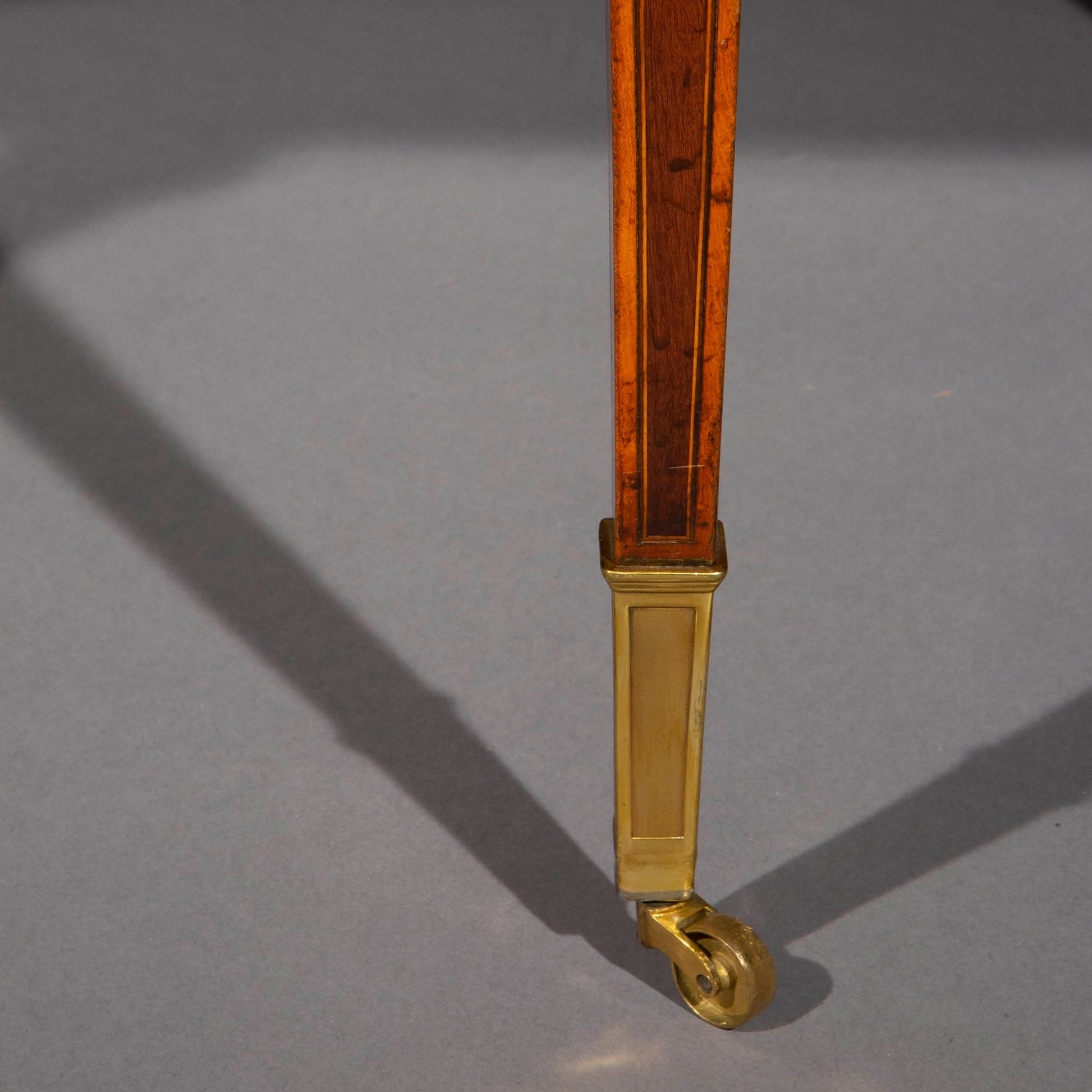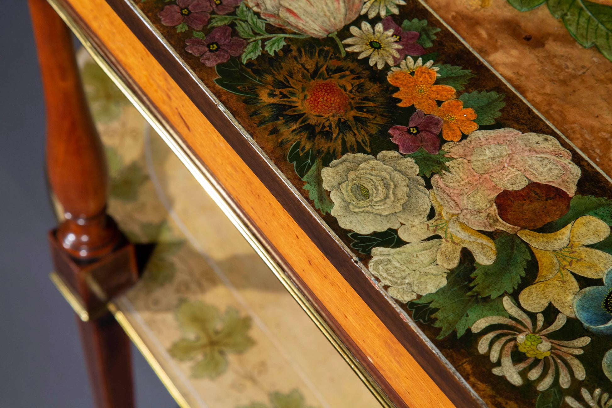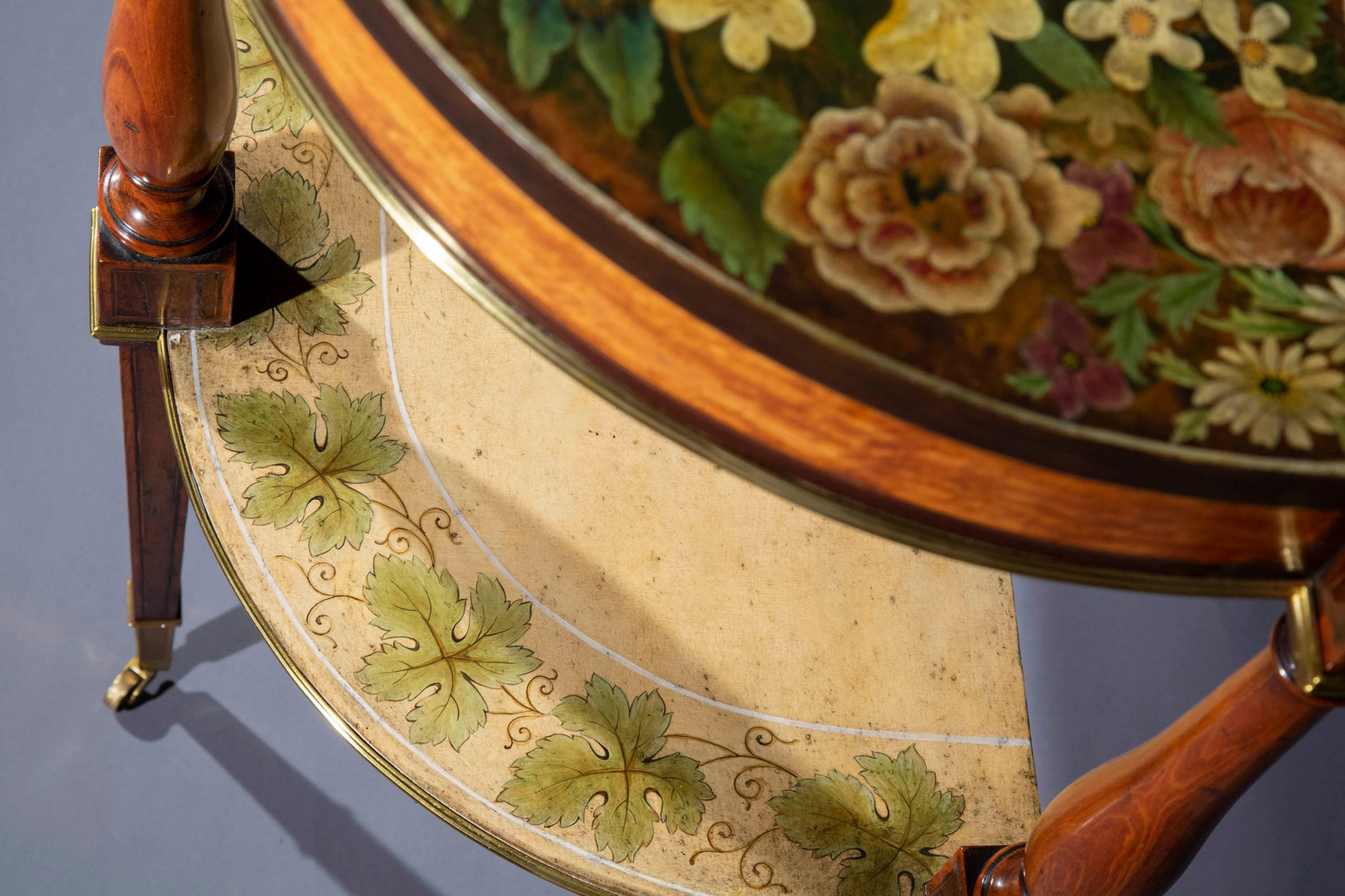 A wonderfully elegant, subtle design. The minutely hand-painted polychrome decoration in the Pompeian style is simply exquisite. The cabinetwork is quite remarkable too; the slender structures are supported by the thinnest legs that we have ever seen with the tops resting on the most exquisitely sculpted satinwood balusters. Beautiful pieces to look at, useful and versatile in a layered interior.