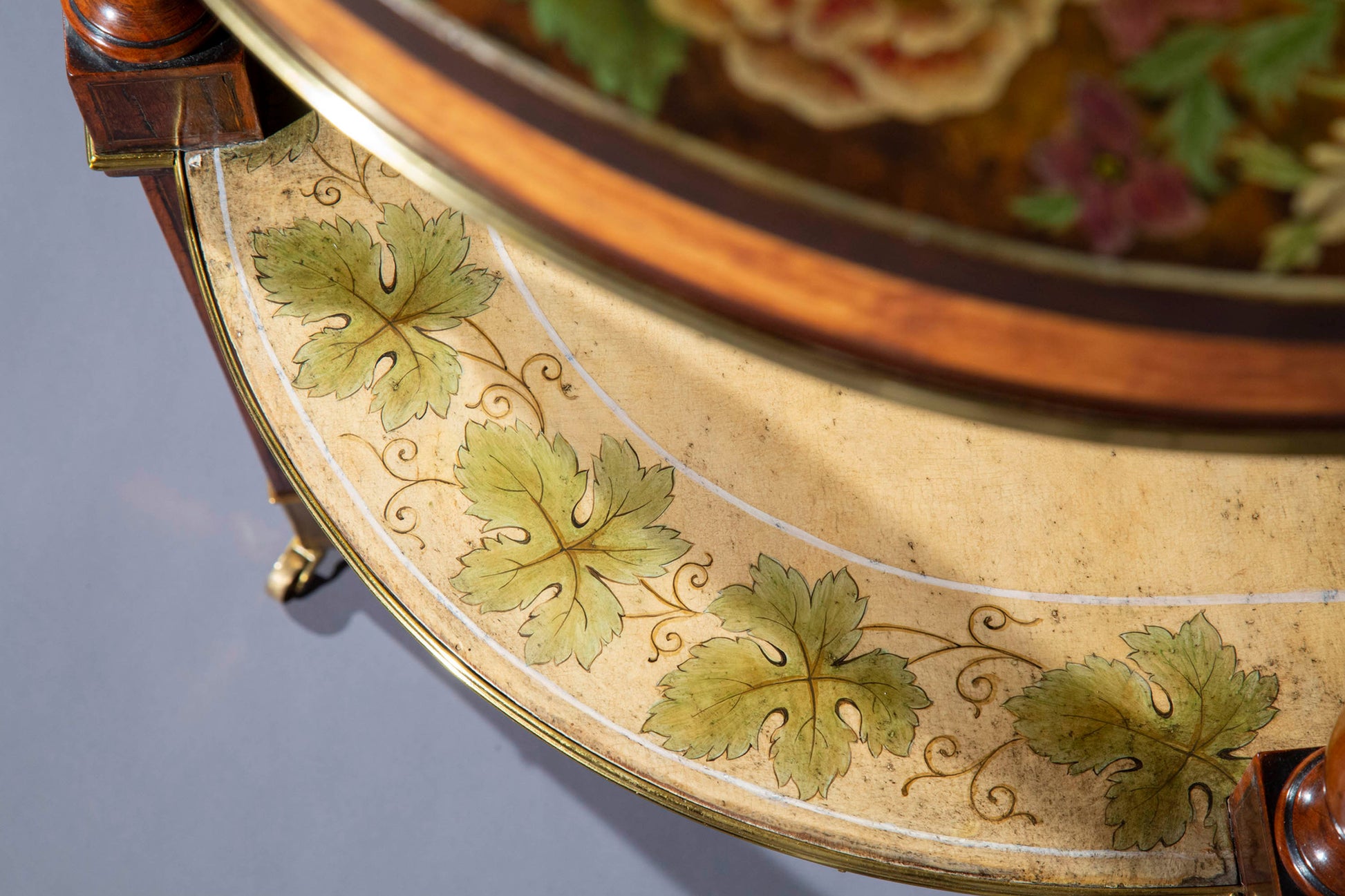 The fashion for painted pier tables dominated drawing-room design in the late 1780s and early 1790s. These tables relate to a design published by Thomas Sheraton in his Cabinet-Maker and Upholsterer's Drawing Book, 1793, Appendix, pl. IV. A measure of the importance of floral decoration at this date is given in The Cabinet-Maker's London Book of Prices, published in 1788, in which the frontispiece illustration is framed by ribbon-tied floral garlands.