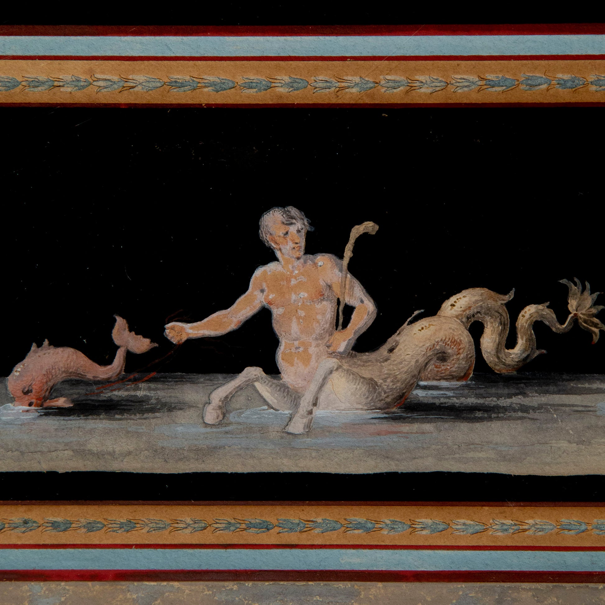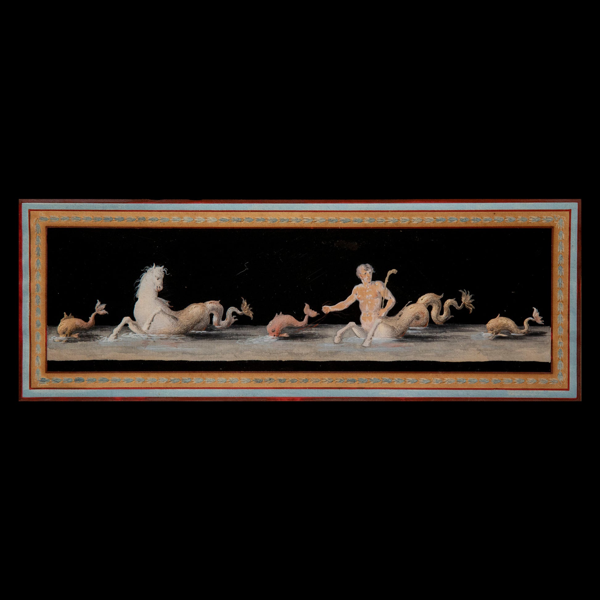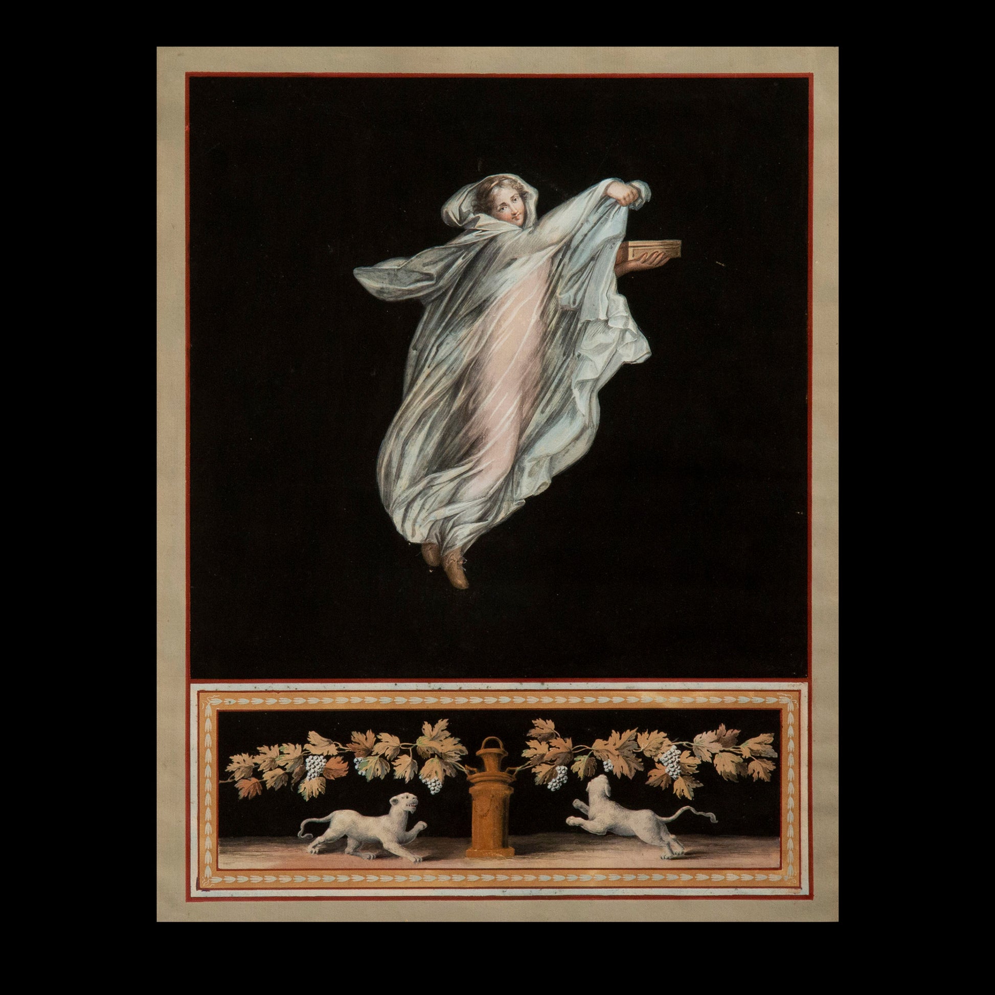 These gouaches are the ultimate evocation of the ancient Pompeii, corresponding to the fragments of frescoes excavated in the late 18th century.