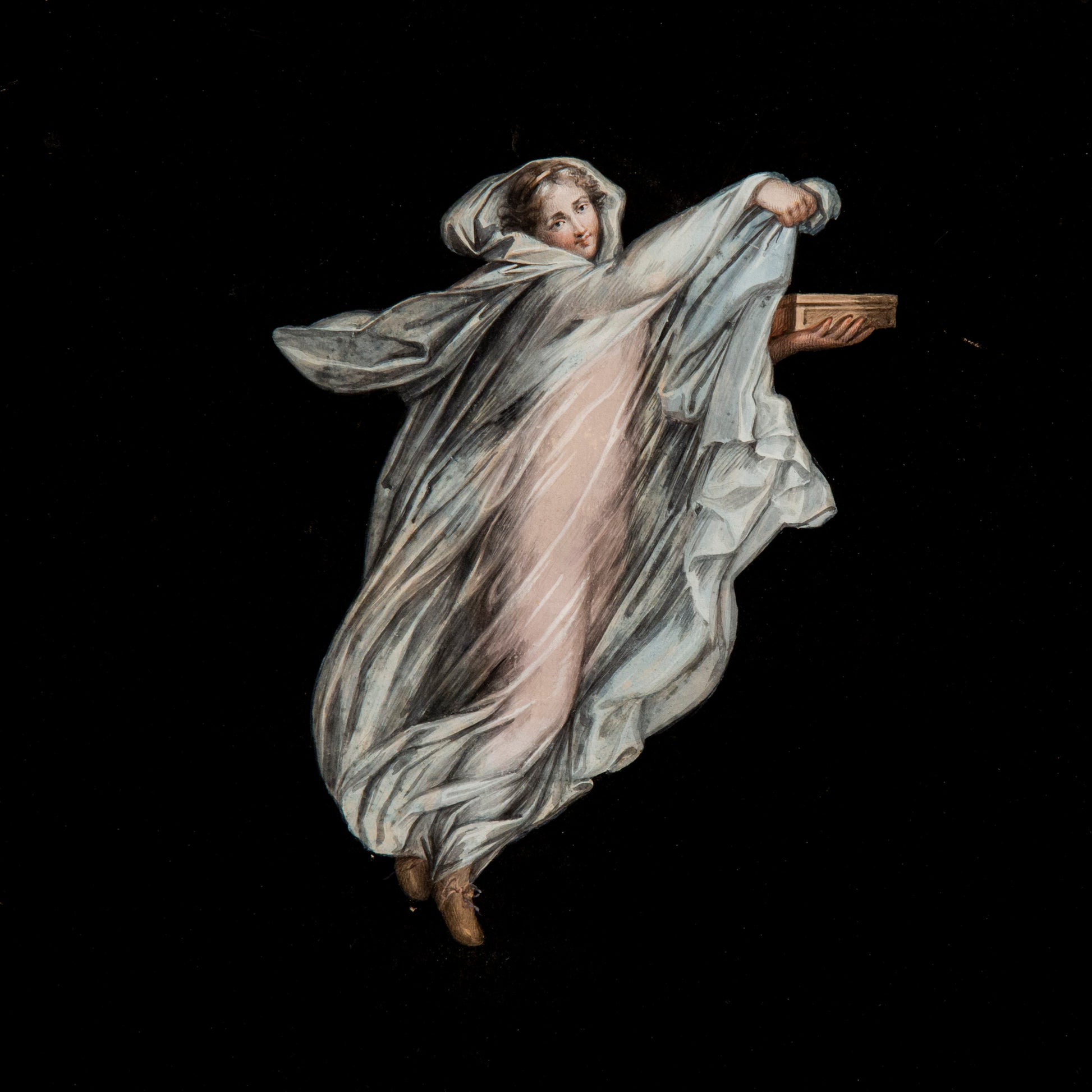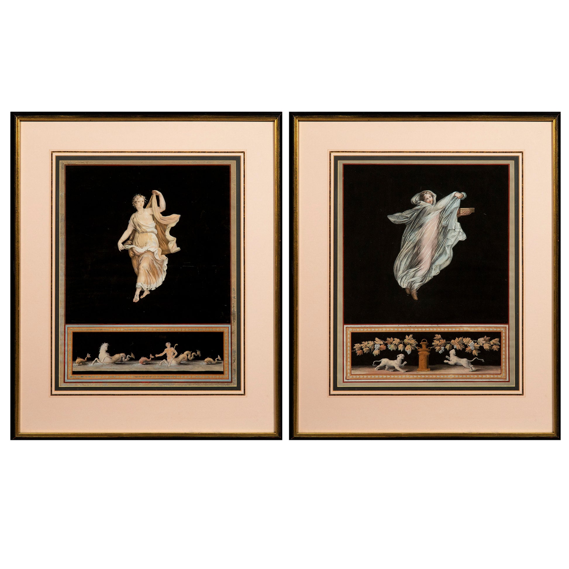 Michelangelo Maestri is mainly known for his bodycolours that he based on the then only recently discovered wall frescos in Pompeii. The drawings, which were often made over etched outlines became very popular amongst travellers on their Grand Tour. These particular works are from the very popular series of The Hours of Day and Night, and are based on frescoes 'Dancers of Herculaneum' found in the triclinium of the so-called Villa of Cicero in Pompeii, that was excavated on 25 May 1748 to 18 January 1749. Now in Naples Archaeological Museum (inventory numbers 9295, 9297).