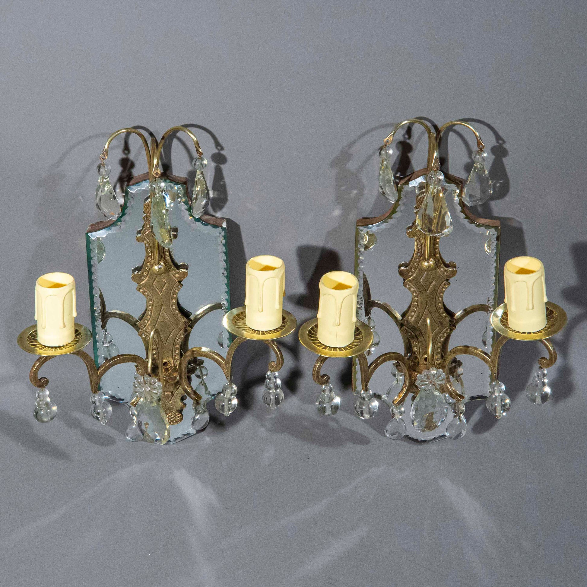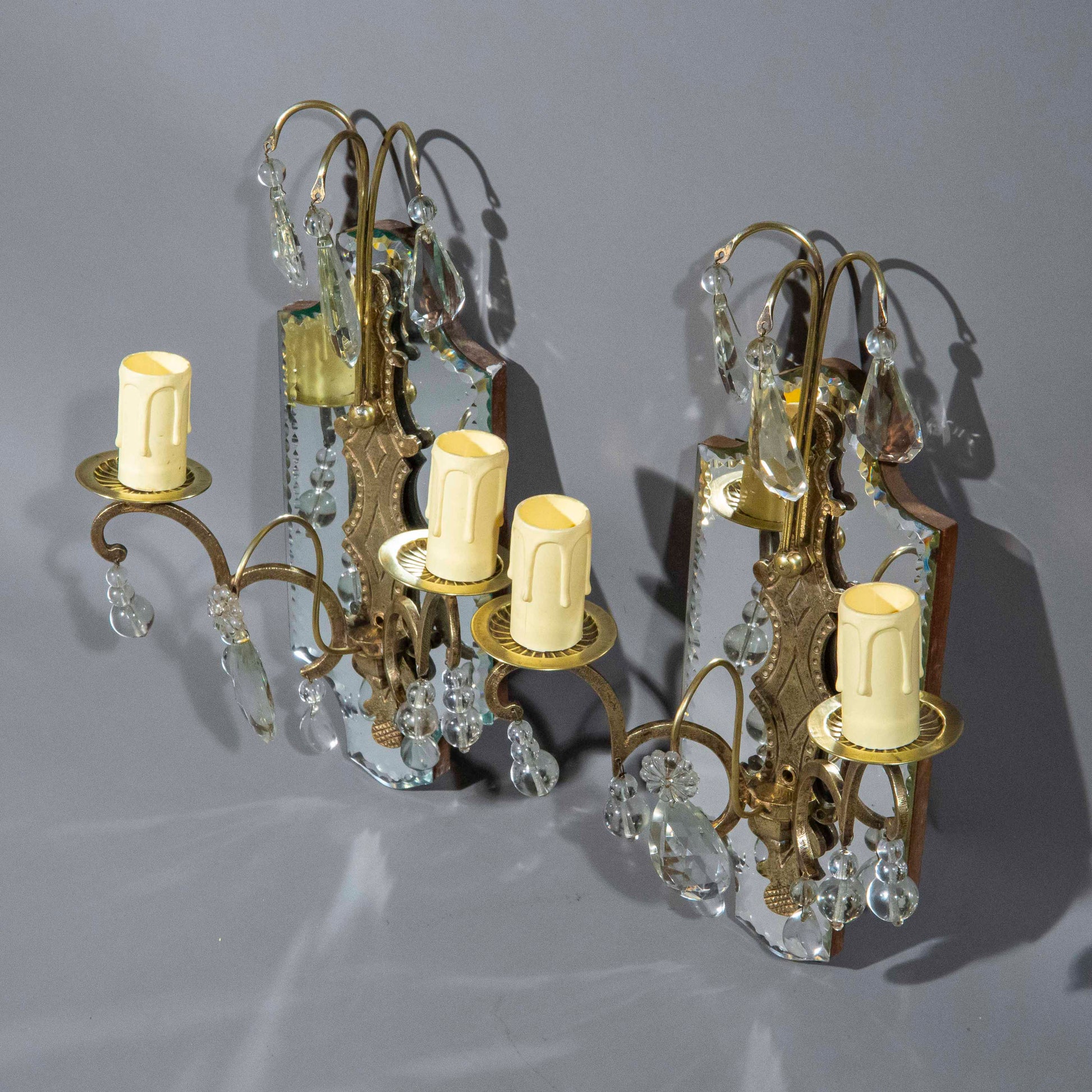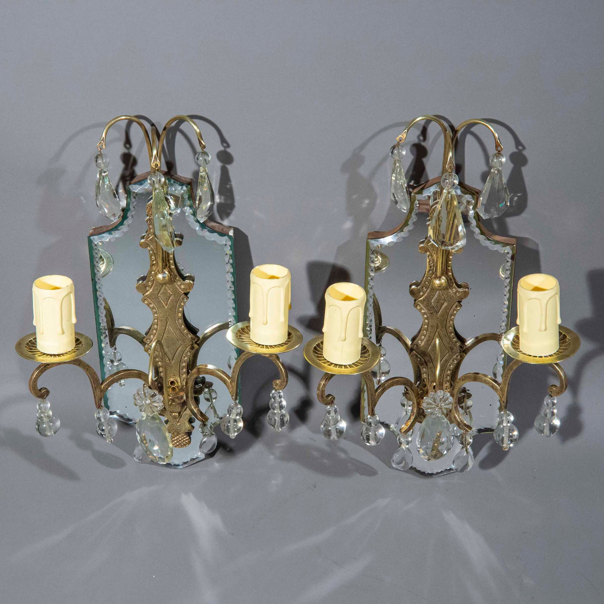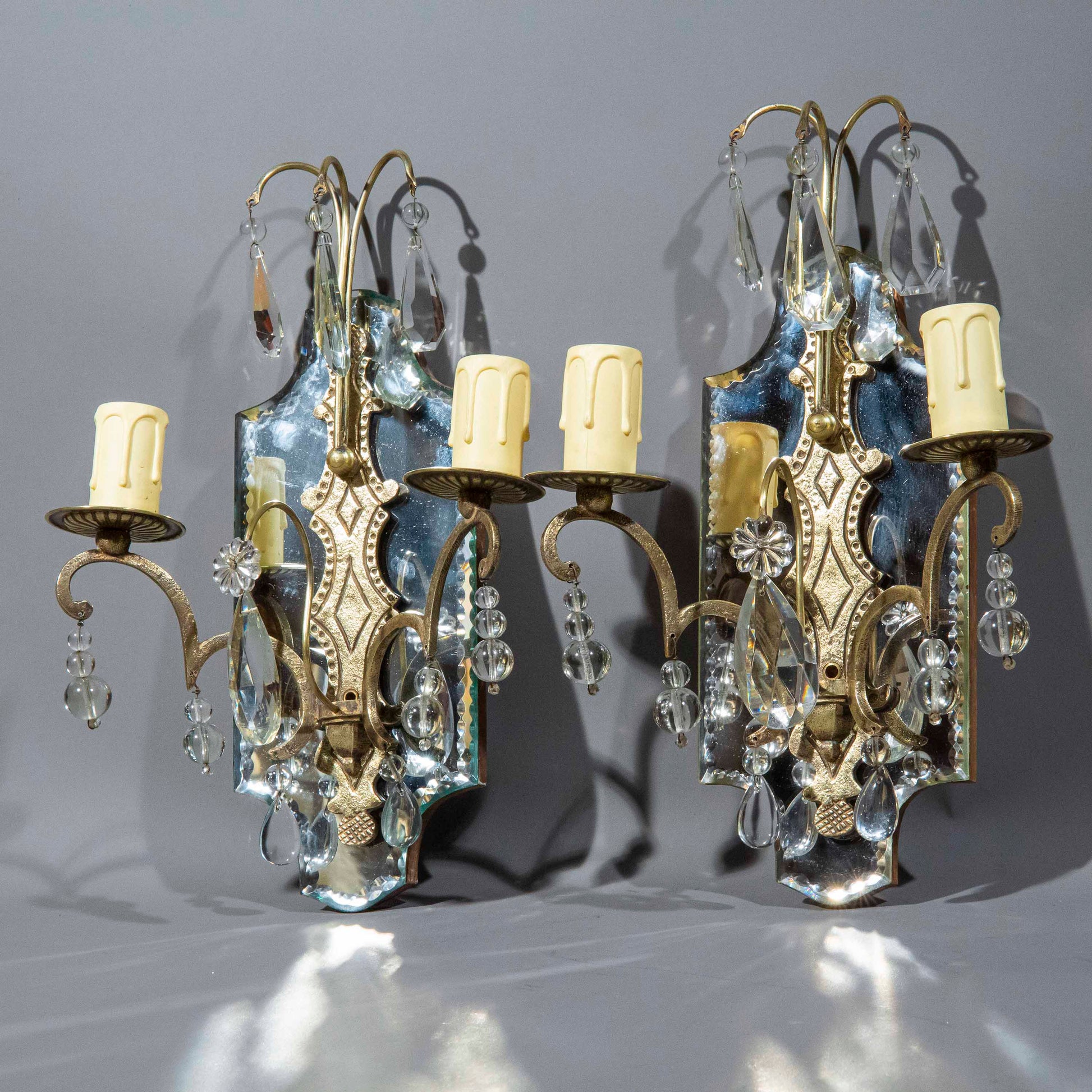 A superbly decorative pair of bronze mirrored wall lights or sconces, very much in the style of Maison Jansen. Probably France, mid-20th century.