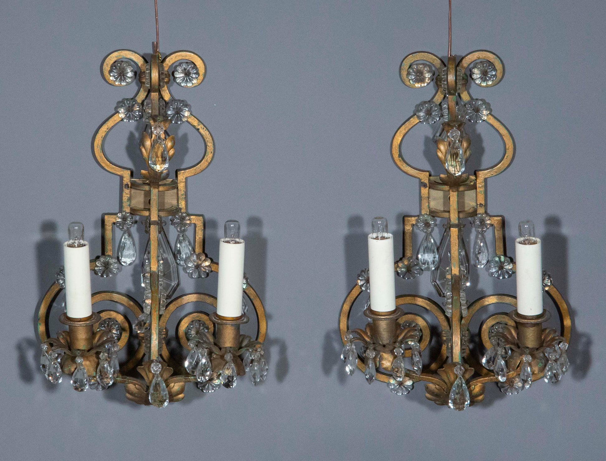 A superbly decorative pair of painted wrought iron wall lights or sconces, very much in the style of and quite possibly made by, Maison Baguès. Probably France, early to mid-20th century.