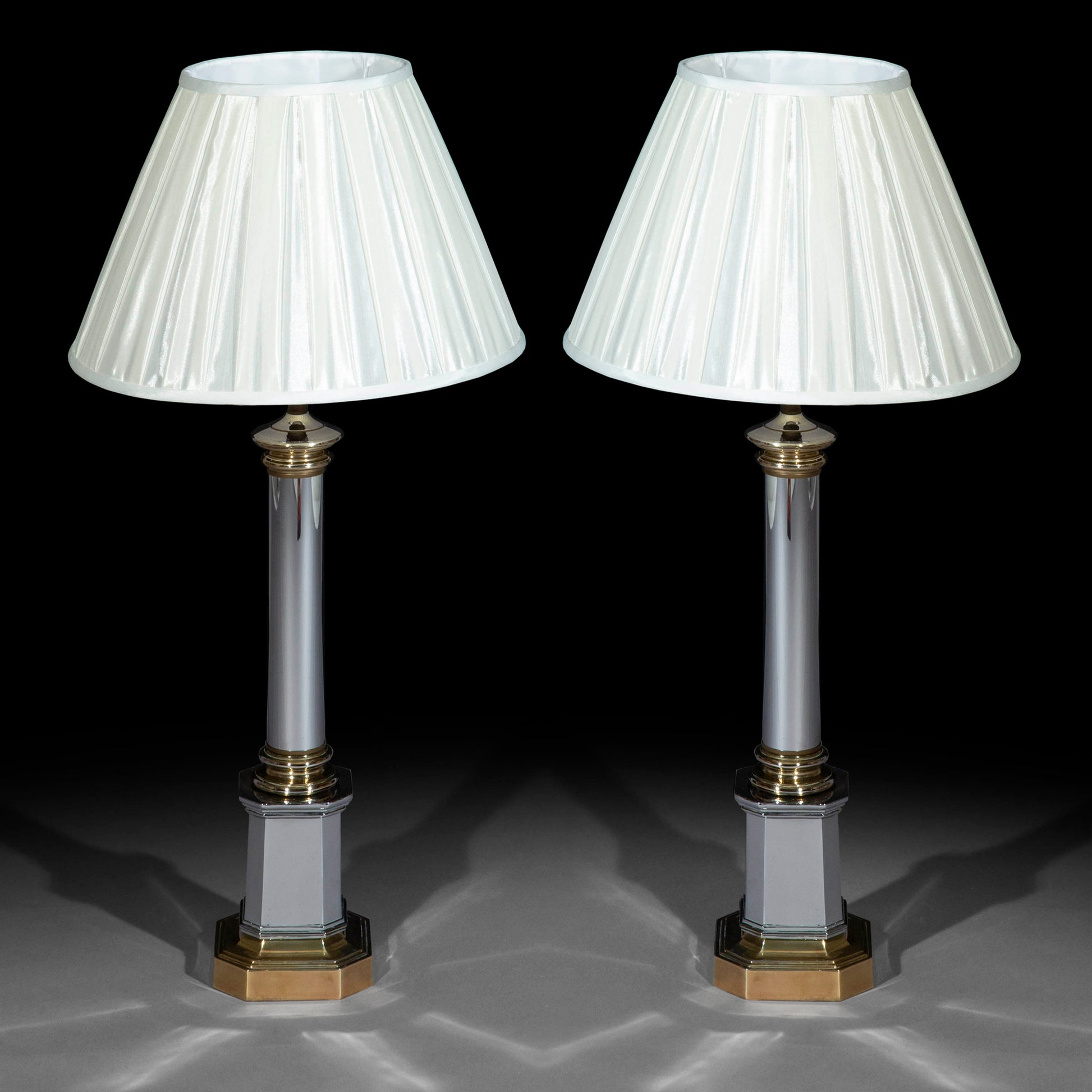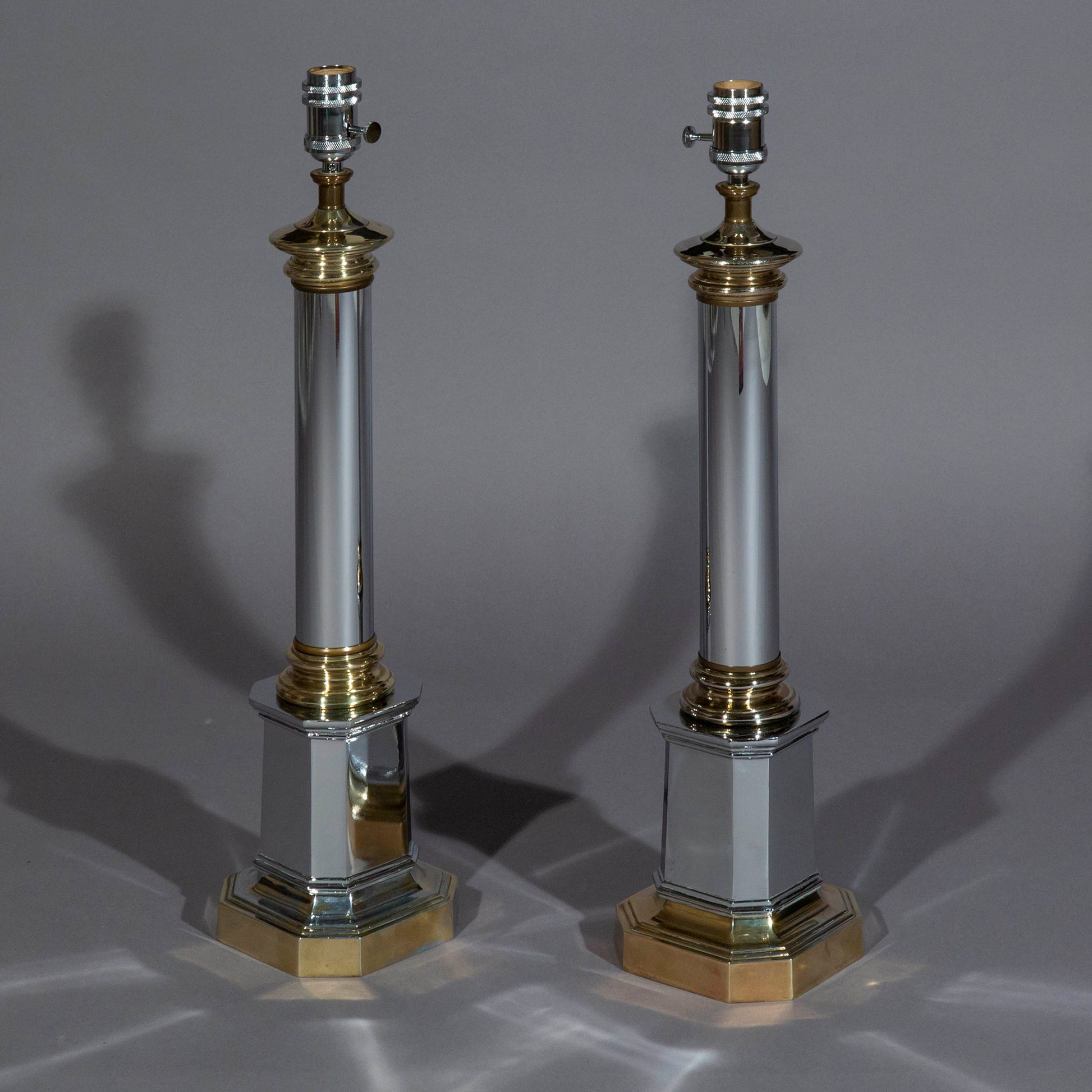 A handsome pair of polished metal table lamps. Mid-20th century.