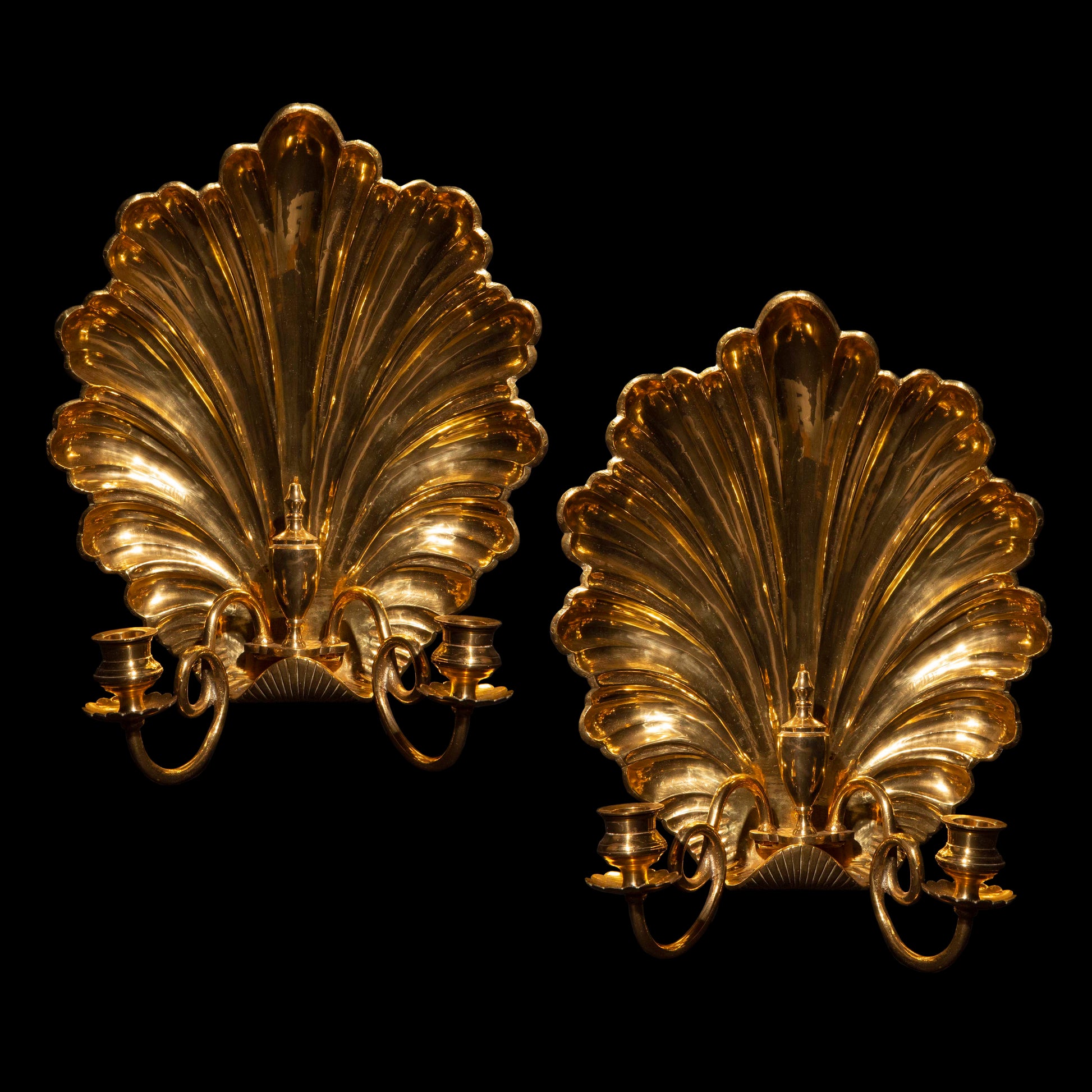 A stylish pair of cast and gilt brass wall lights, fashioned as stylised scallop shells, each with scrolled twin-arm sconces. Superb solid quality, rare large size, striking accent pieces.