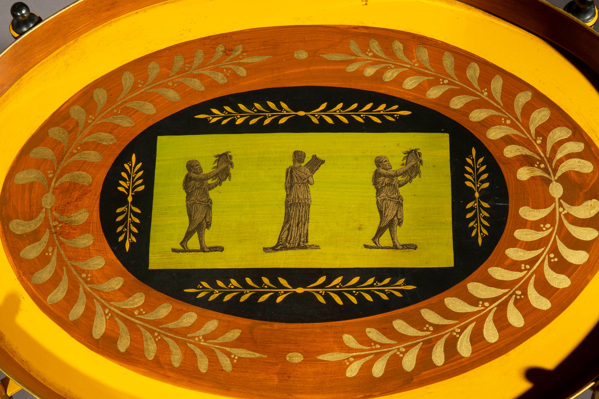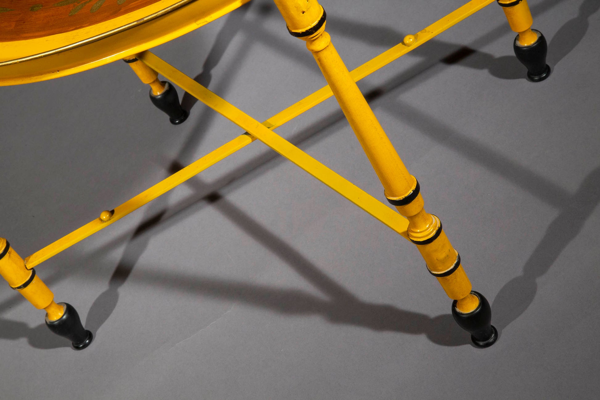 A charming pair of midcentury neoclassical style toleware tray tables, painted yellow with polychrome accents. Italian, circa 1960.