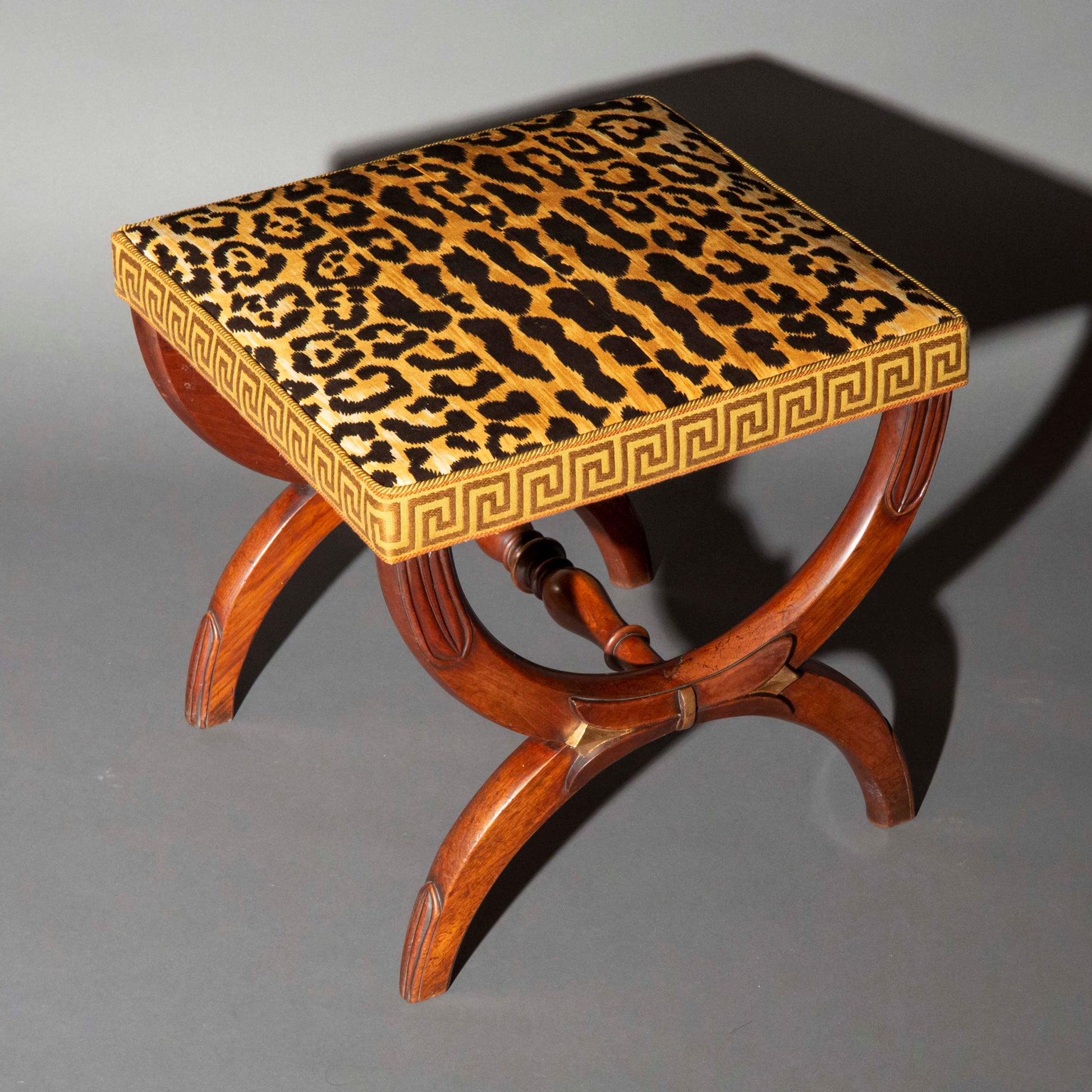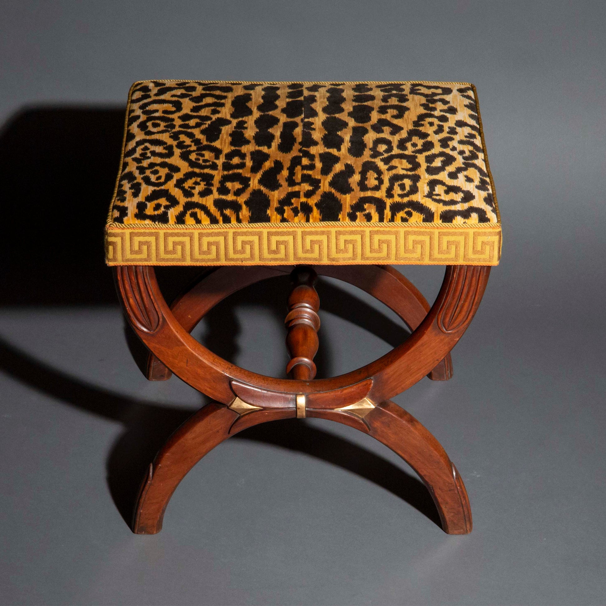 An elegant x-frame or curule-form stool in Spanish mahogany, beautifully upholstered in leopard print velvet with hand-sewn cord and Greek-key border.