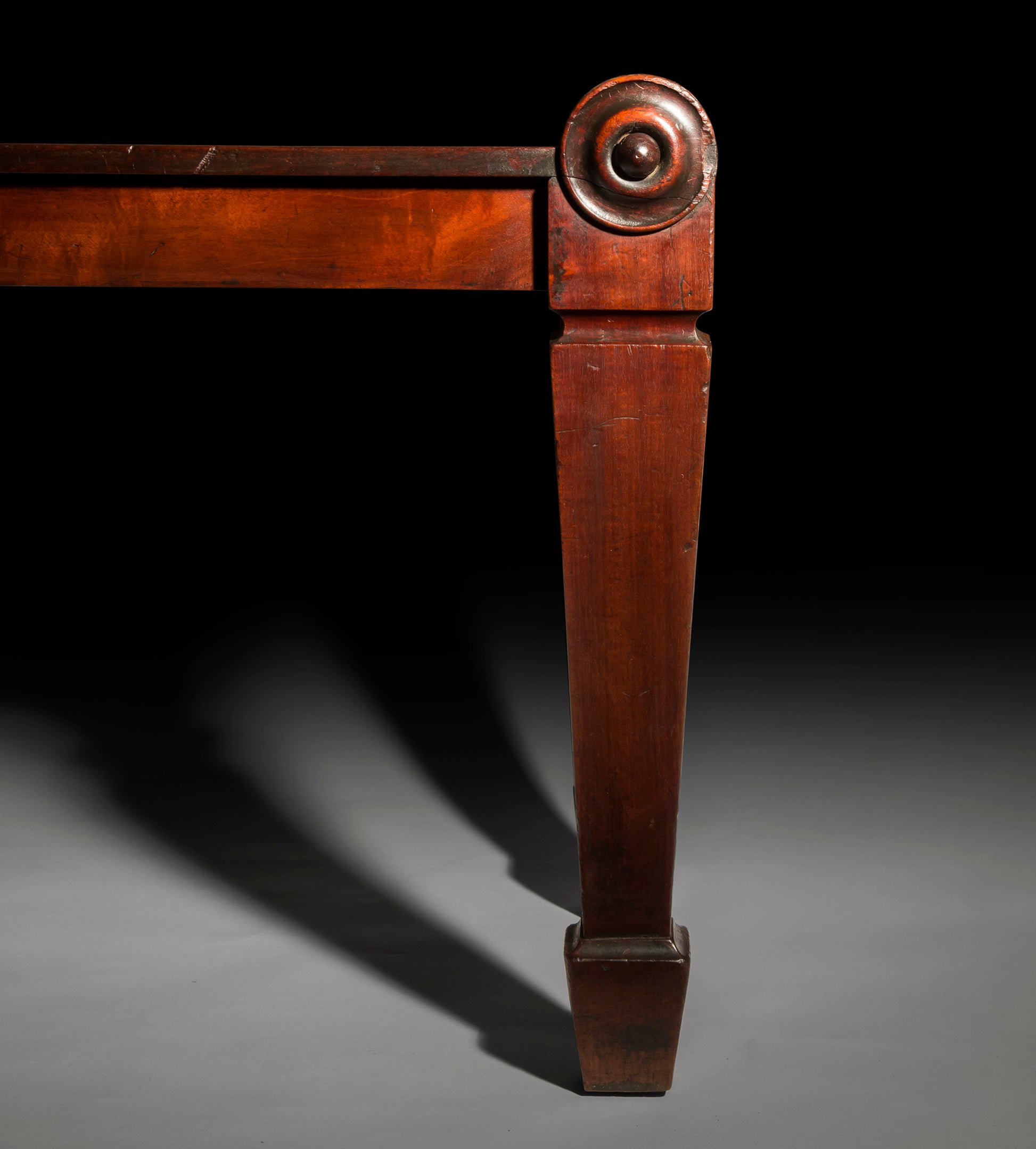 The design for this hall stool evolved from an antique Roman marble seat, with fluted legs and drapery-covered seat, that was drawn by the architect Charles Heathcote Tatham (d. 1842) and published following his return from Rome in his 'Etchings of Ancient Ornamental Architecture', 1799 (pl. 46). The fashion for ancient Greek and Roman designs was popularised by C. Percier and P. Fontaine's, Receuil de decorations Interieuses, 1801 and promoted by the connoisseur Thomas Hope (d.1842), author of a guide-book to his London mansion/museum entitled Household Furniture and Interior Decoration, 1807. The rectangular frame has architectural 'eared' ends that are supported on taper-hermed legs. These same elements feature in a stately throne pattern published in January 1807 and included in a Collection of Designs for Household Furniture and Interior Decoration, 1808, (pl. 58) issued by George Smith (d.1826), 'Upholder Extraordinary to His Royal Excellency the Prince of Wales'.