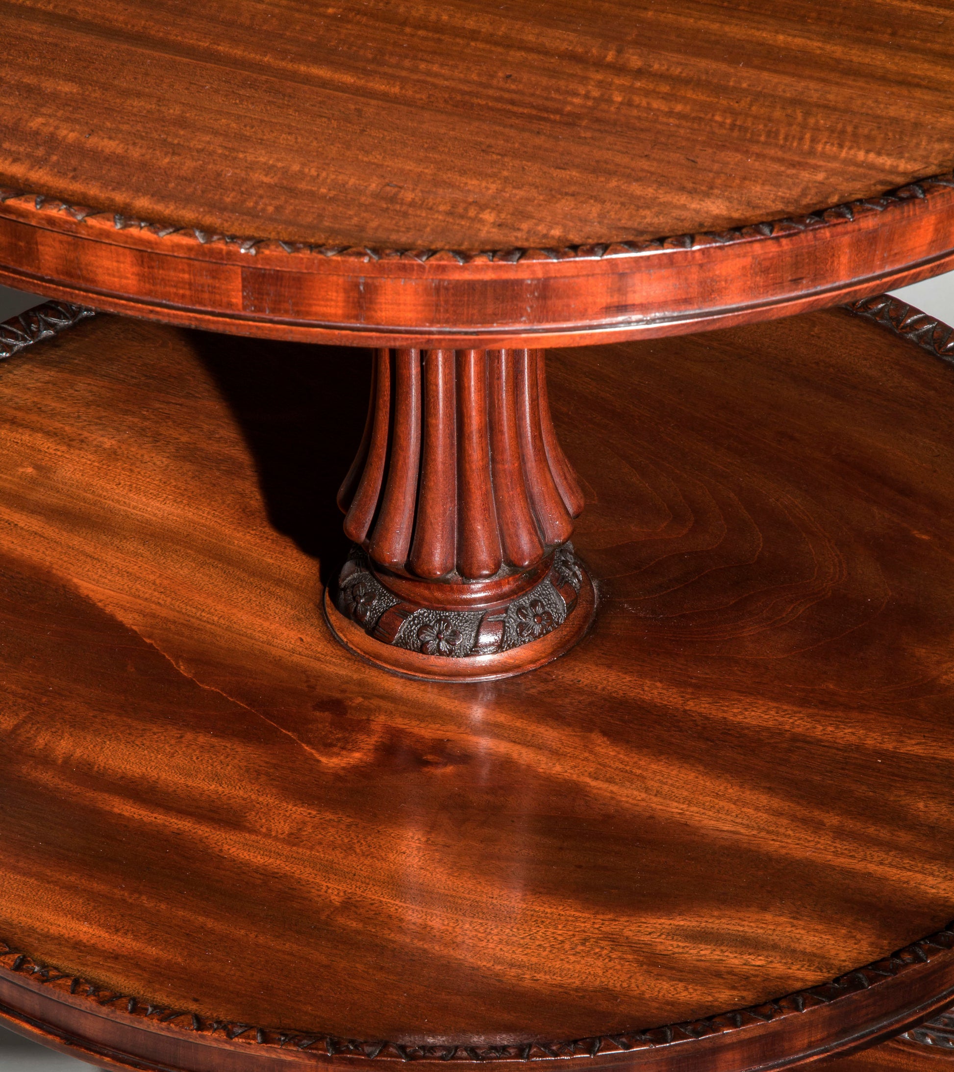 Fine antique condition, slight warping to top tier which does not affect its functionality. Carving to the edges of tiers are possibly 19th century embellishments.