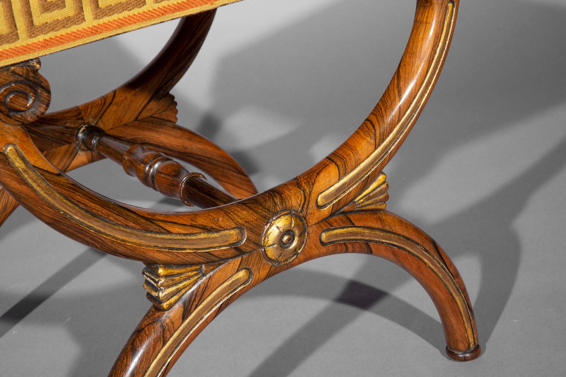 A Regency period parcel-gilt 'curule' stool of compact proportions.