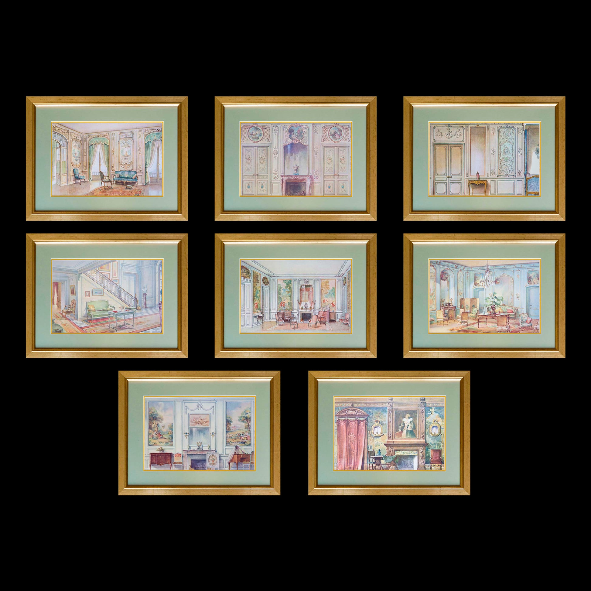 A set of eight antique lithographic prints of watercolours, depicting interiors in various historic styles, in the manner of Alexandre Serebriakoff,