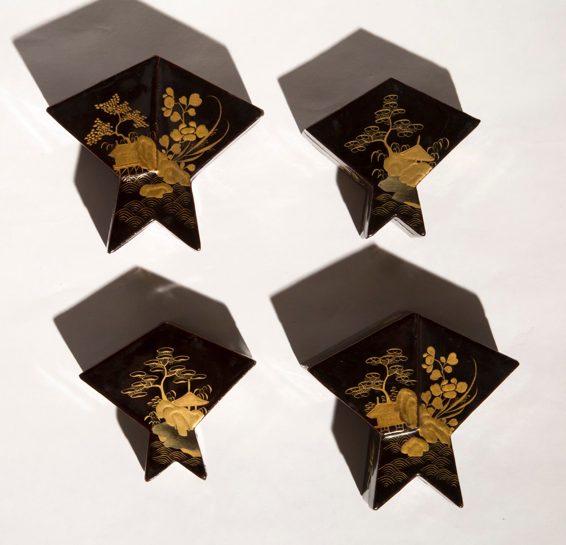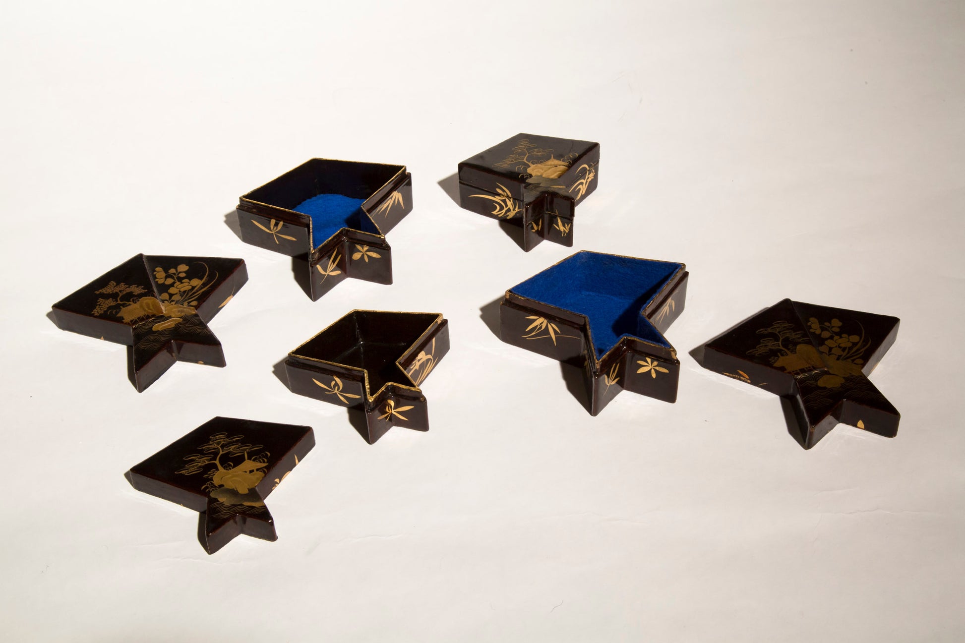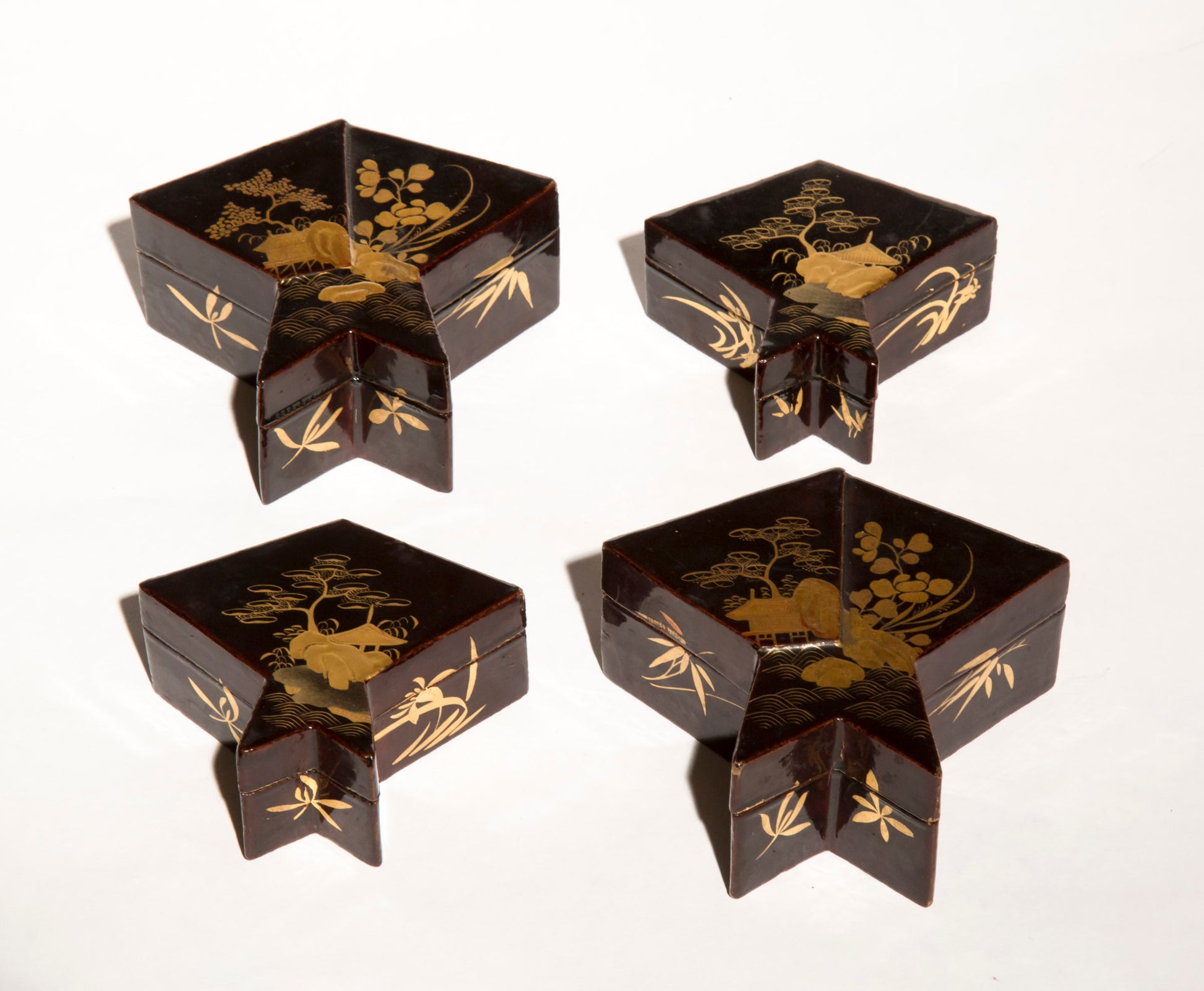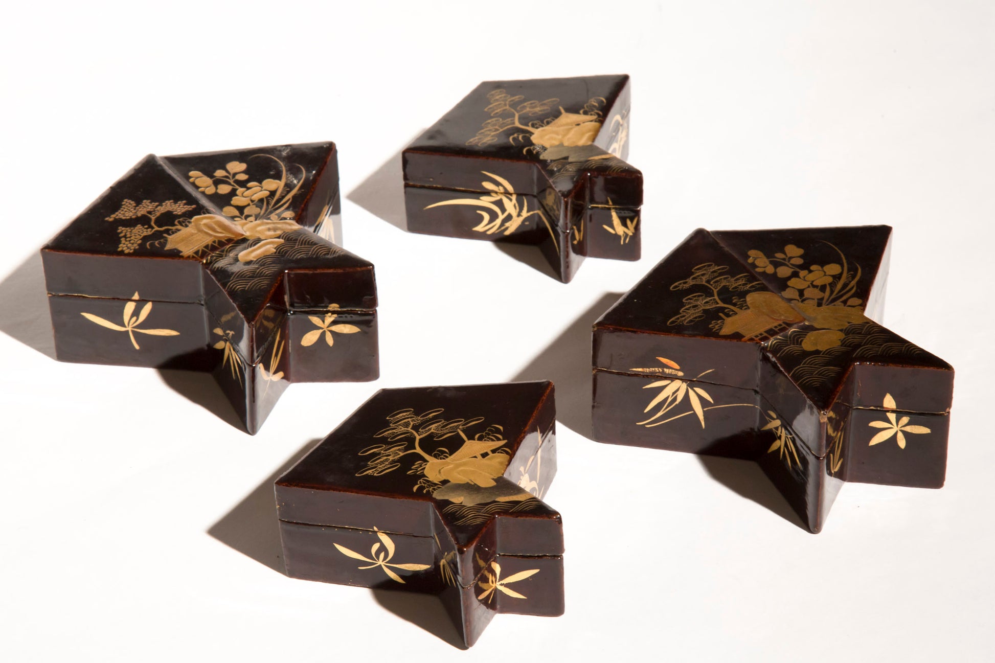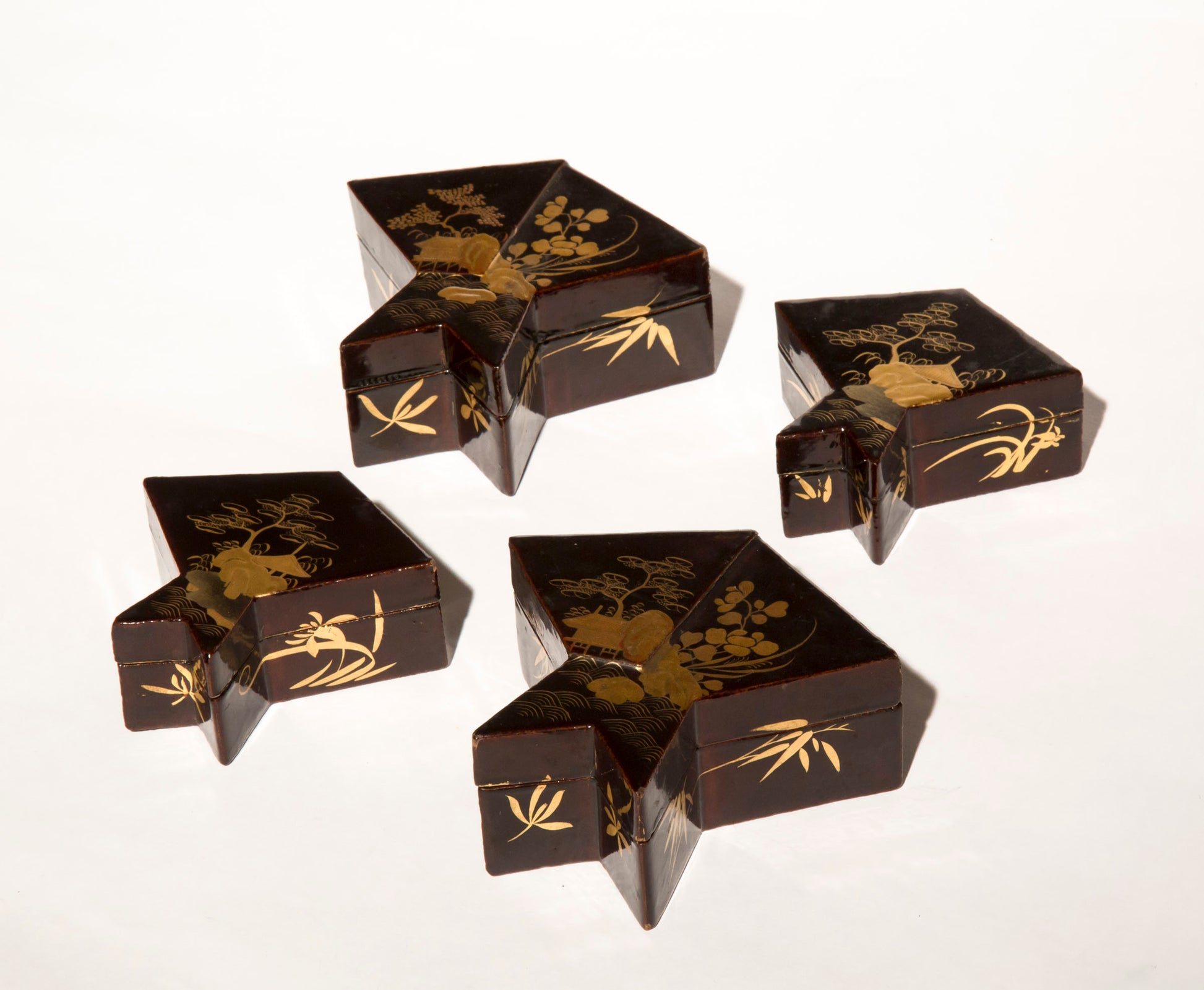 Fine set of four late 19th century black lacquer and gold decorated fan-shaped nesting boxes, the two smaller boxes fit snugly into the larger ones, lined with felt inside.
