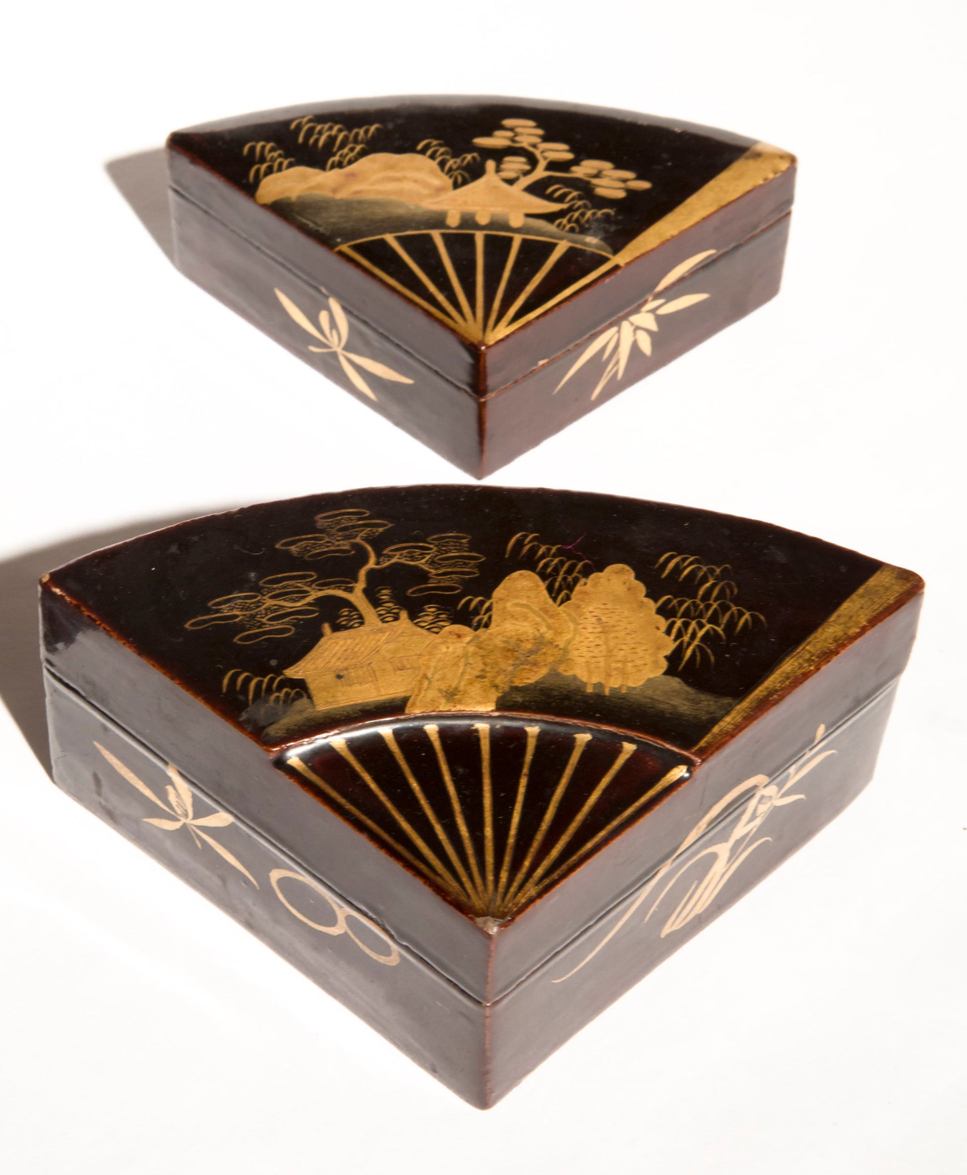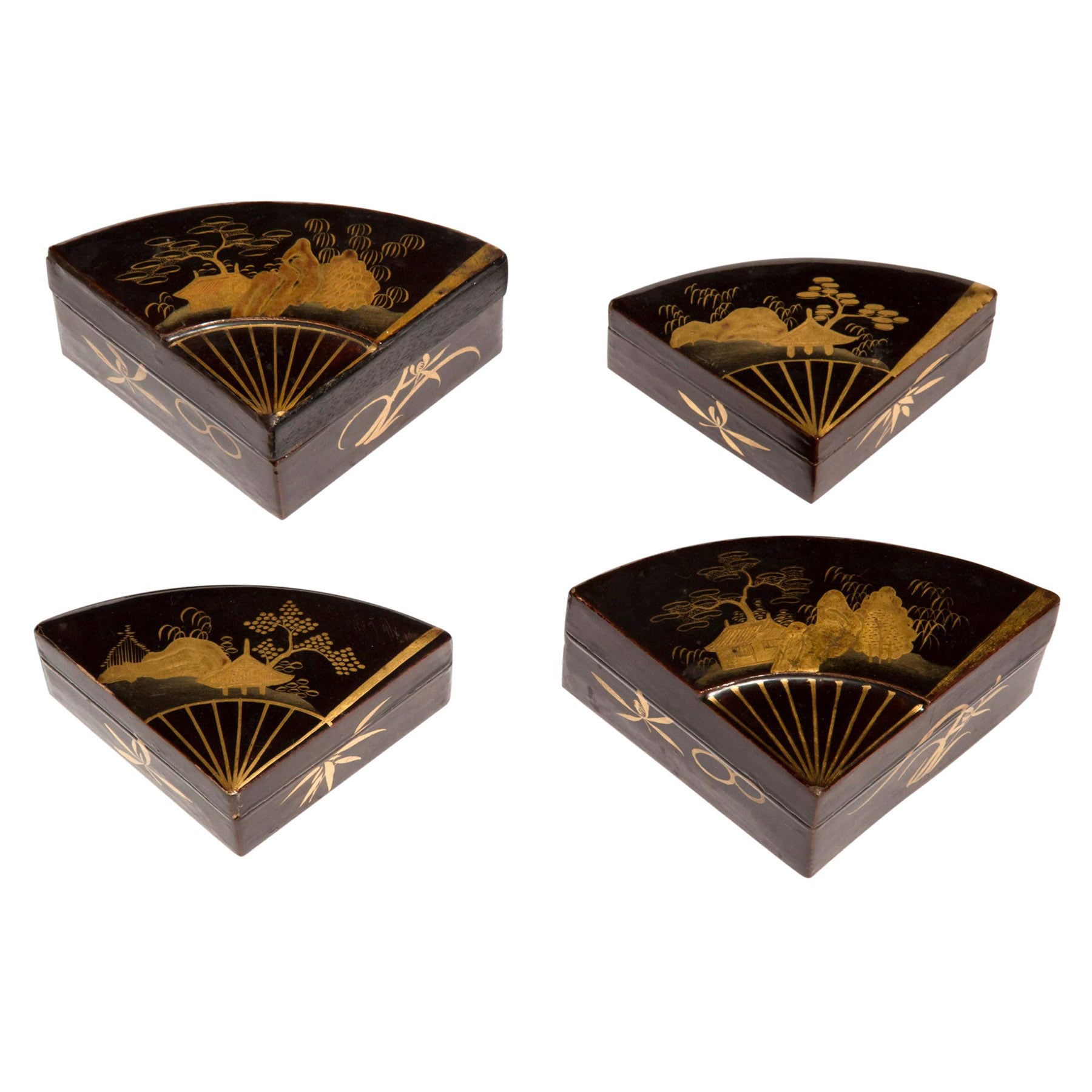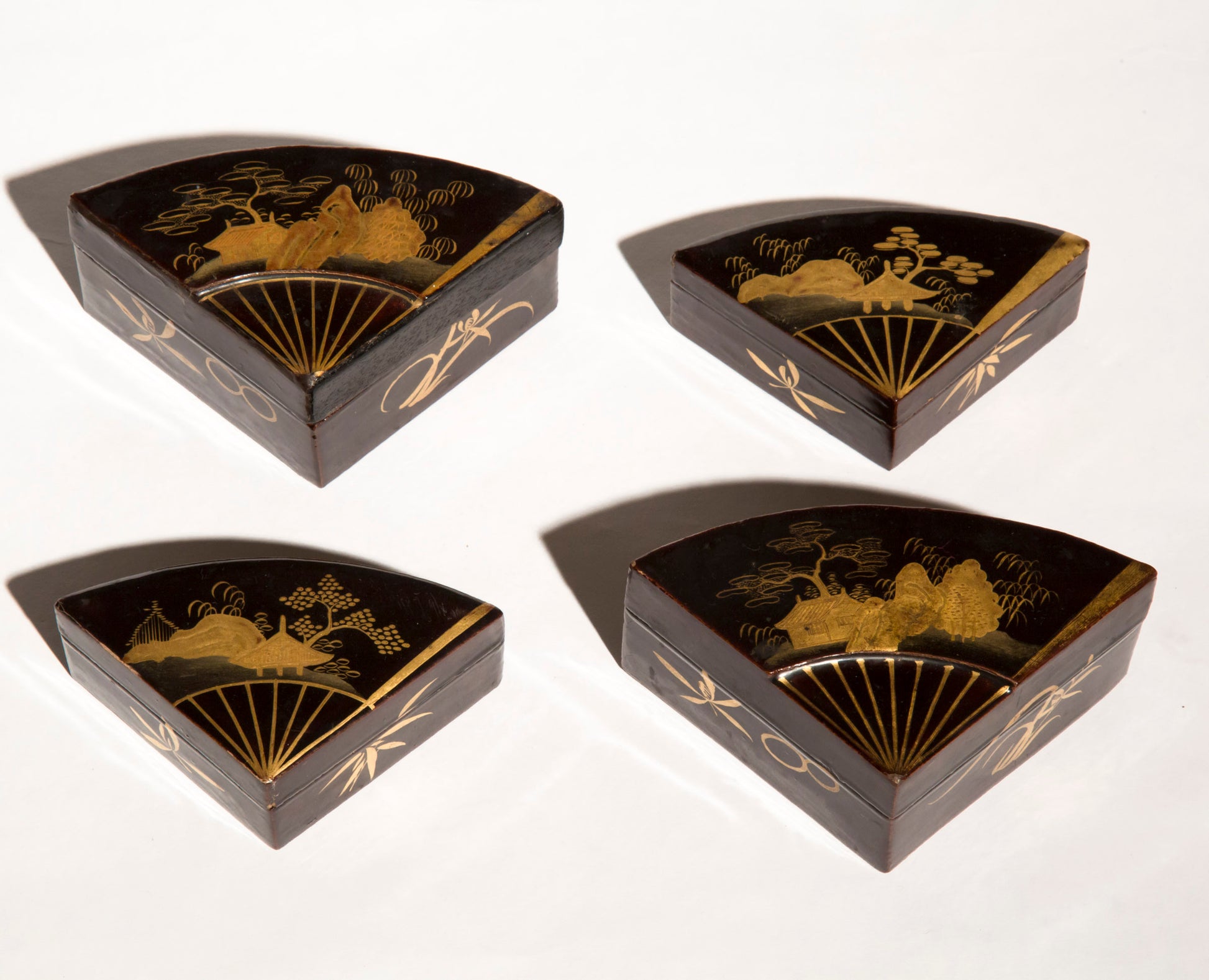 Fine set of four late 19th century black lacquer and gold decorated fan-shaped nesting boxes, the two smaller boxes fit snugly into the larger ones, lined with felt inside.