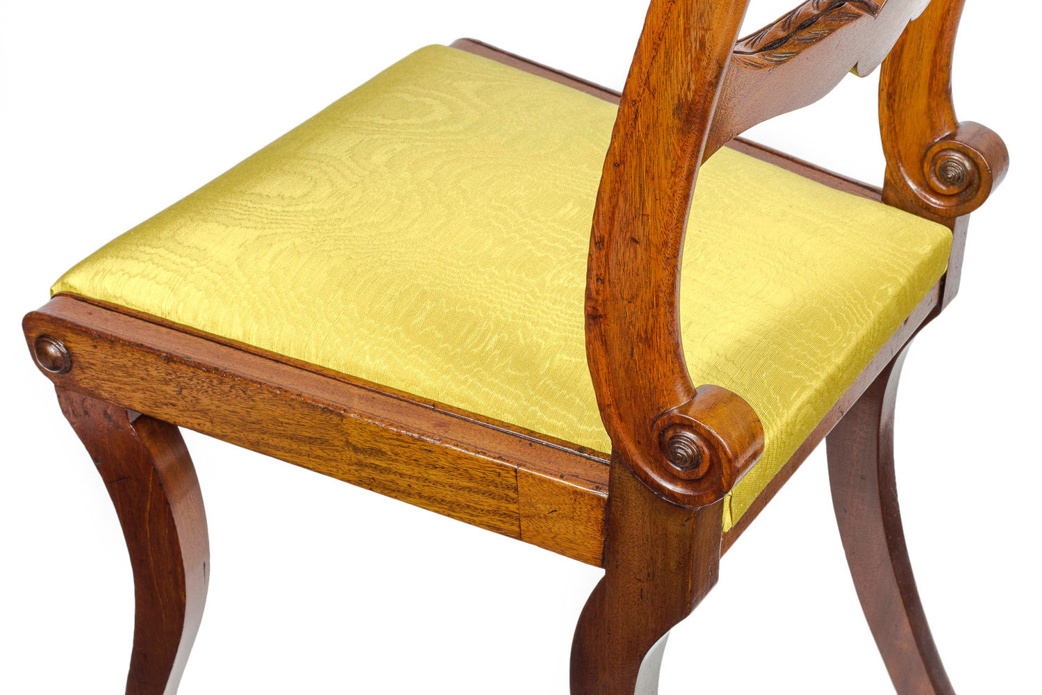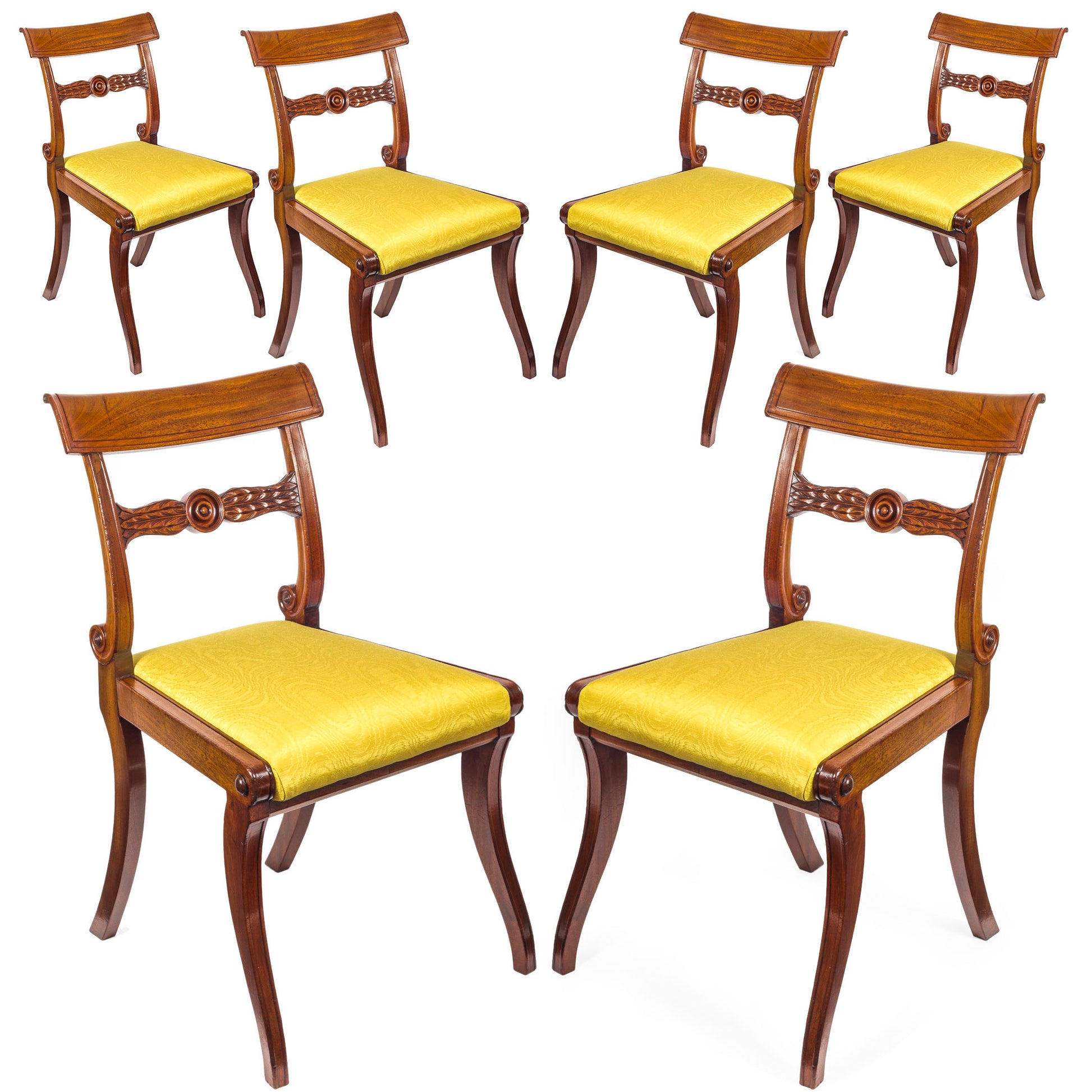 These chairs have moulded and concave-shaped scrolled tablet backs, above the foliage-carved splats, centered by Grecian paterae, between the moulded uprights, terminating in scrolls, adorned with roundels to either side, above the over-stuffed traditionally upholstered slip-seats, covered in ochre yellow moire silk; the whole raised on double-curved channelled sabre legs at the front and outswept back supports.