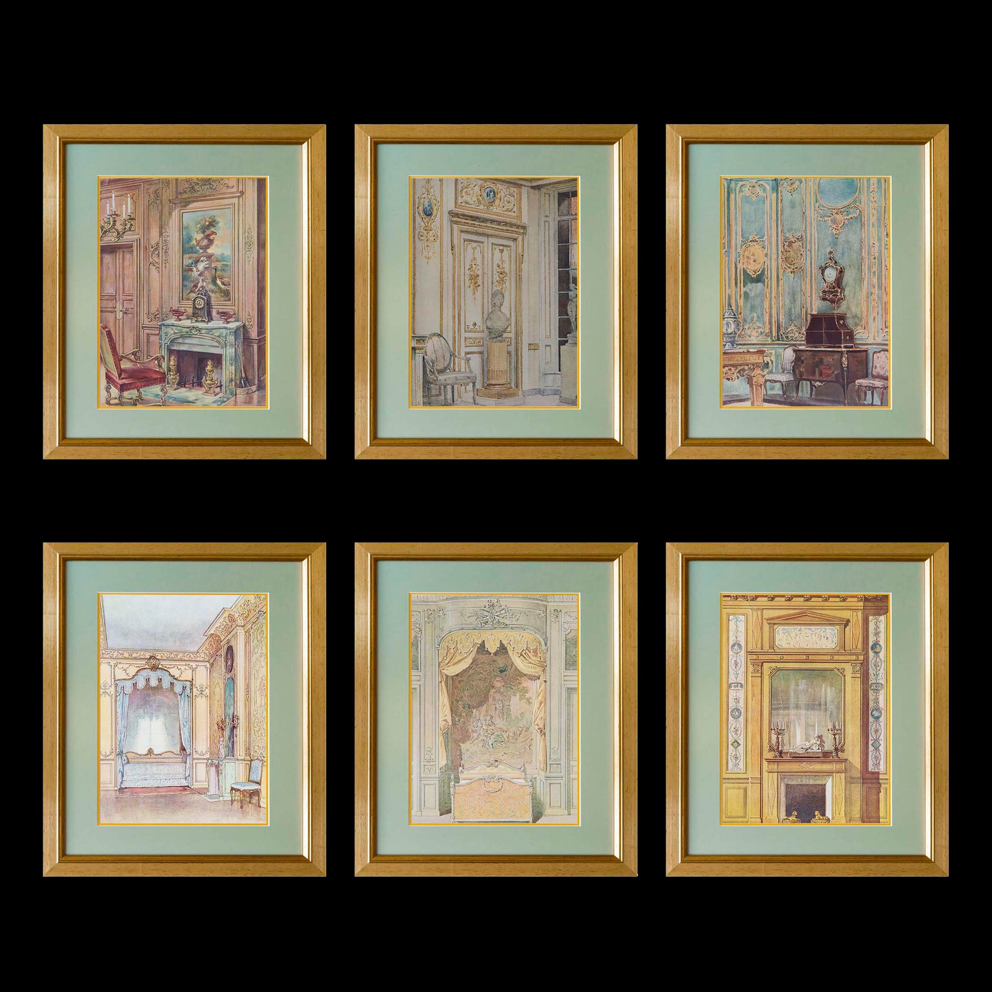 A decorative set of six antique lithographic prints of watercolours, depicting interiors in various historic styles, in the manner of Alexandre Serebriakoff,