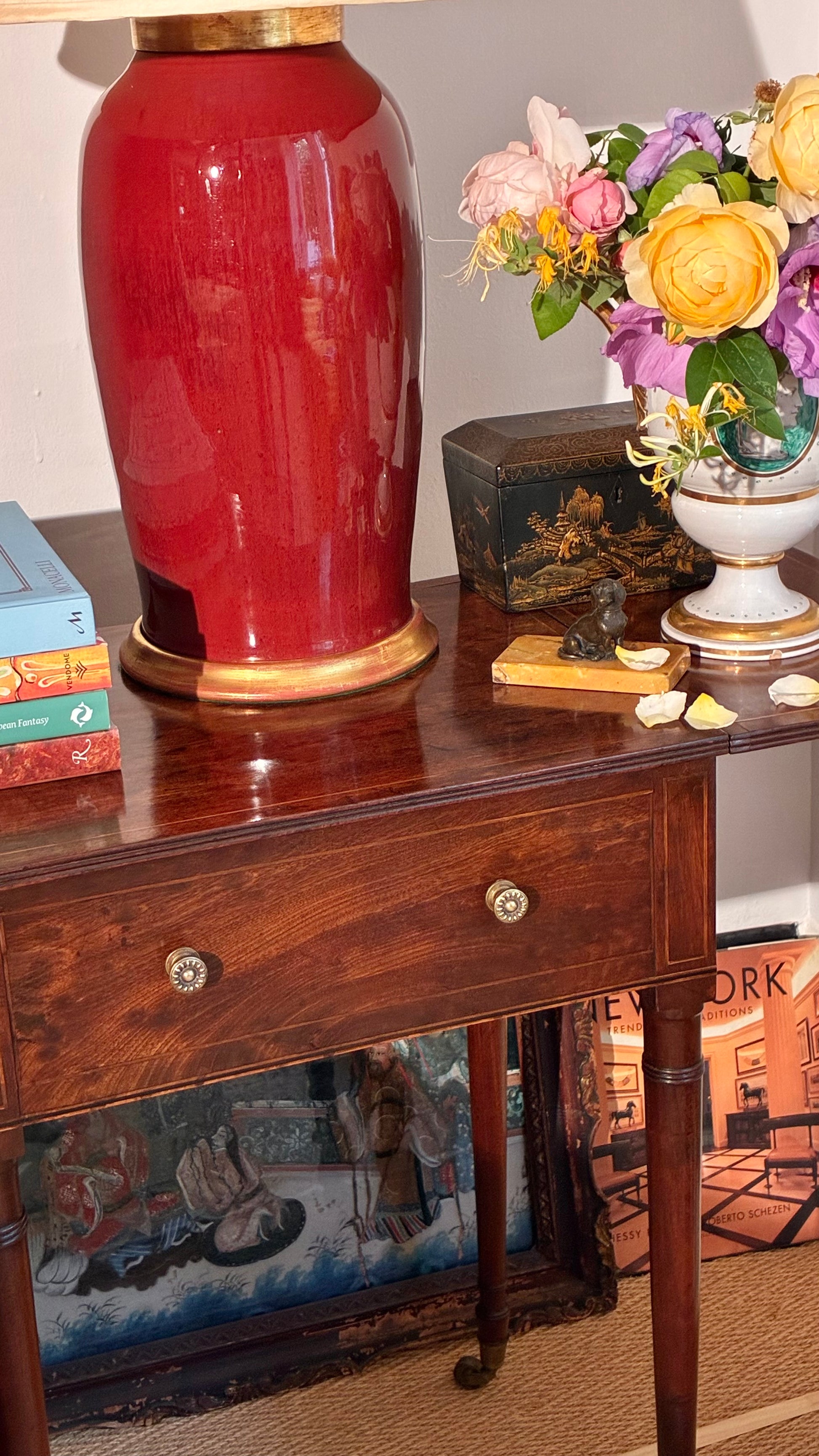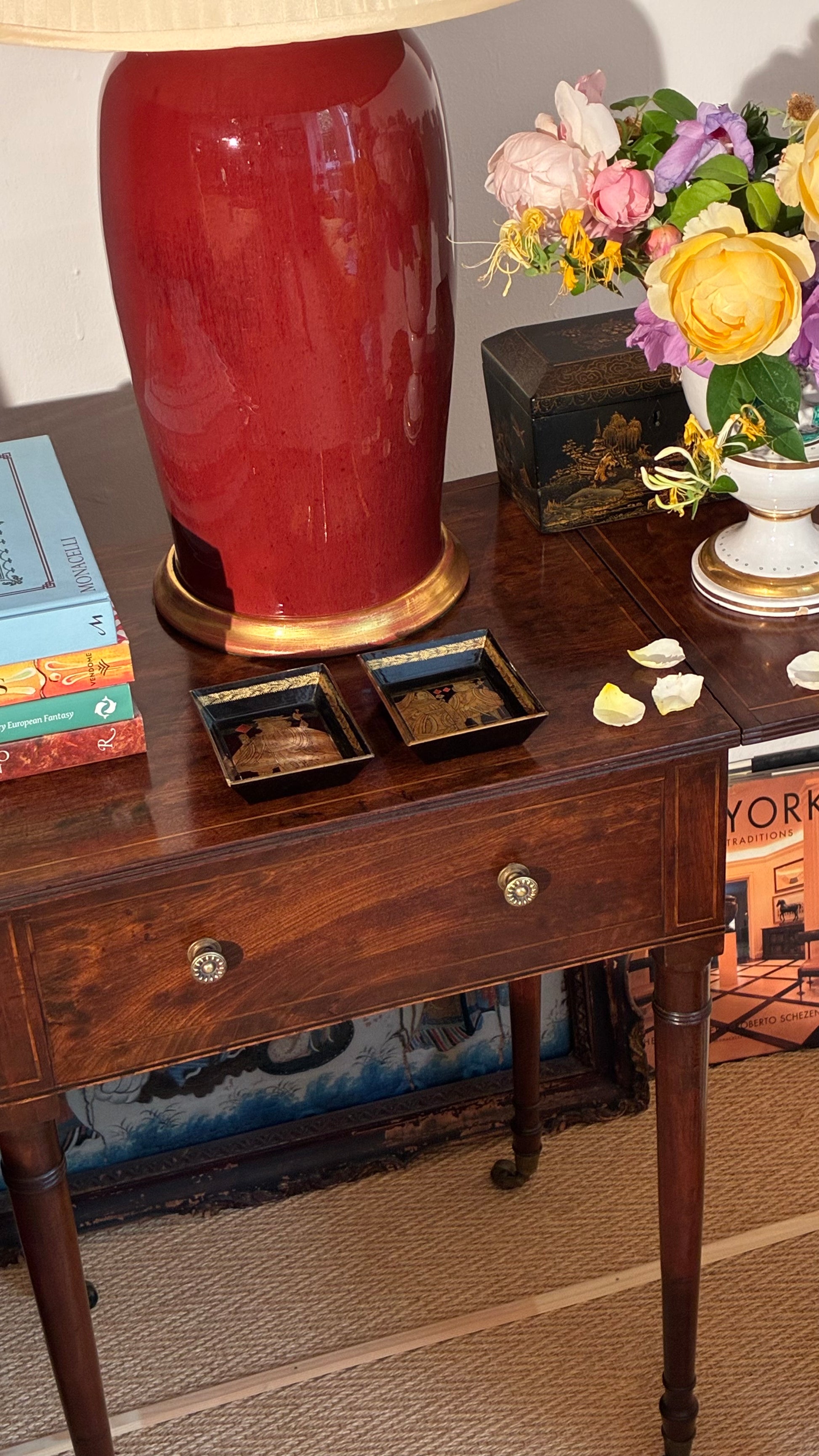 We love the elegant simplicity of this table, its superb colour and patination, as well as the unusual thinness of its components, which lend this design a very delicate look. A rather unusual design too: having no drawer, the inner compartment is reached by lifting the hinged top.