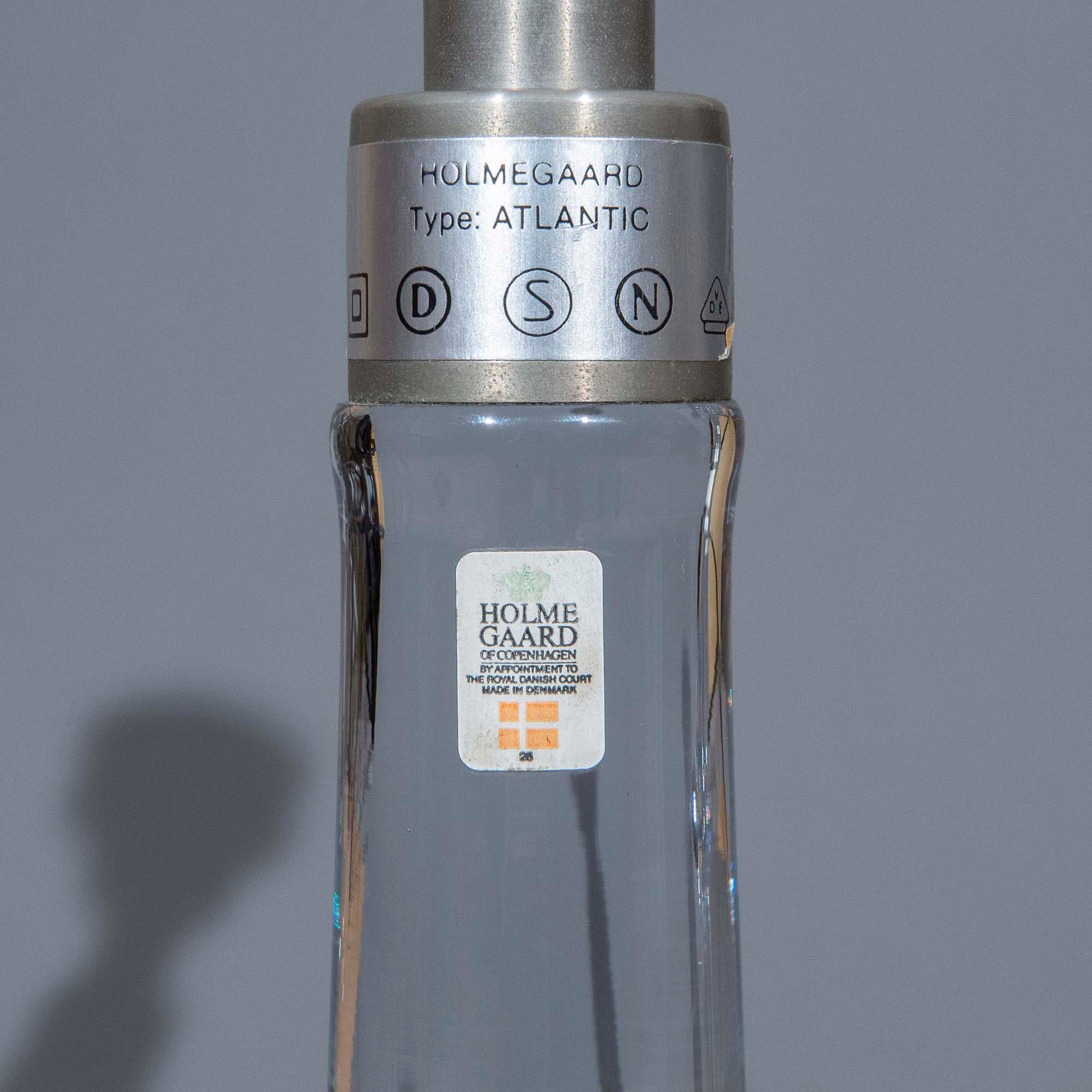 Designed by Michael Bang for Danish glass company Holmegaard. Model ‘Atlantic’, first introduced in 1978 and made until 1984. The solid glass gives it a classic feel without compromising the clean, modern look. The light shines in a wonderful way trough the base. Signed at the top of the base with two original stickers.