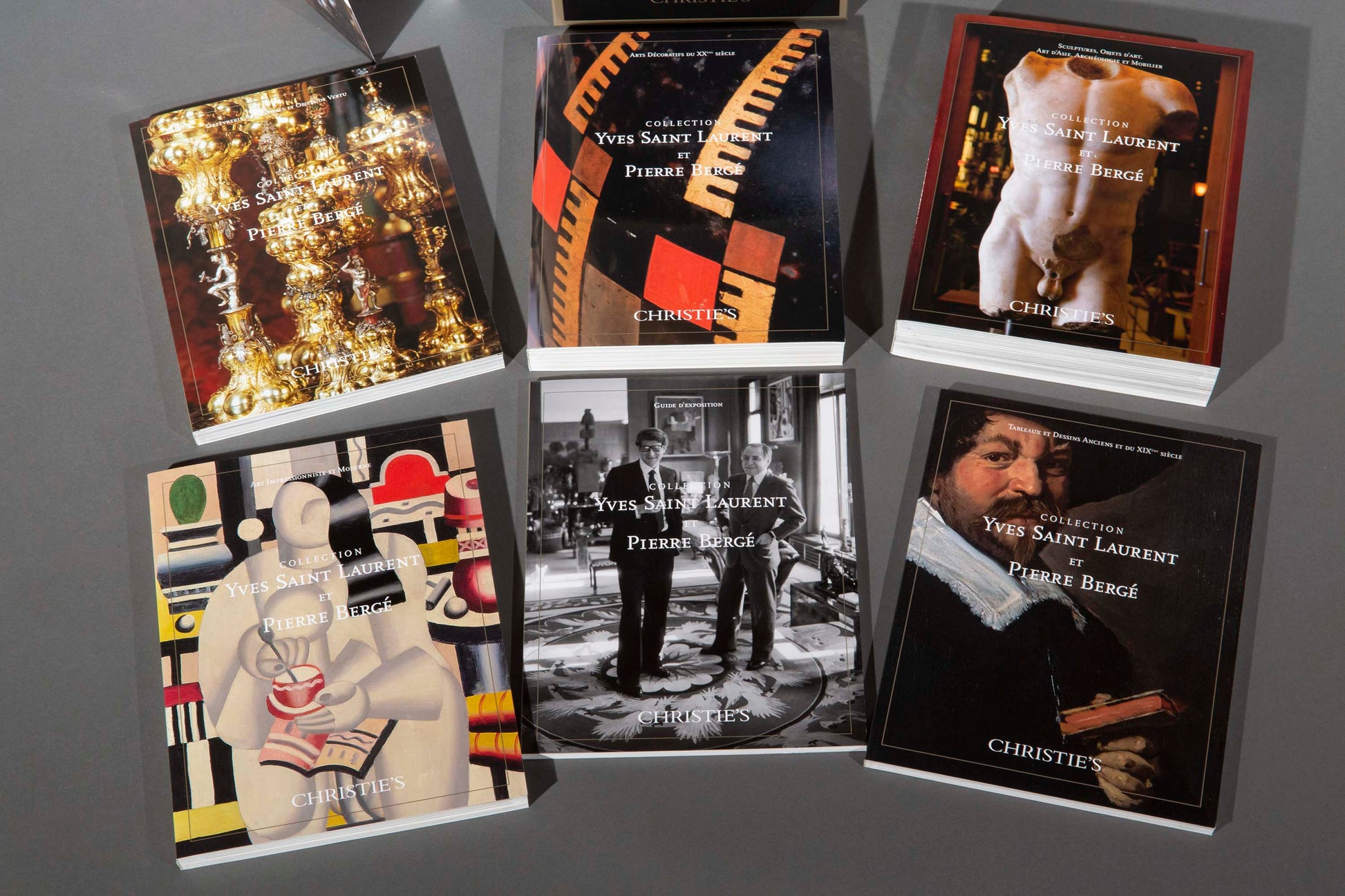 Collection Yves Saint Laurent et Pierre Berge, a complete set of catalogues of the Christie's Paris sale held on 23–25 February, 2009. 6 paperback volumes housed in glossy paper-covered card slipcase, plus DVD. 281, 161, 275, 437, 681, 111 pages. 696 lots illustrated profusely in colour, with archival photographs and details, and several folding-plates. French, with some English translations. 325 x 240mm.